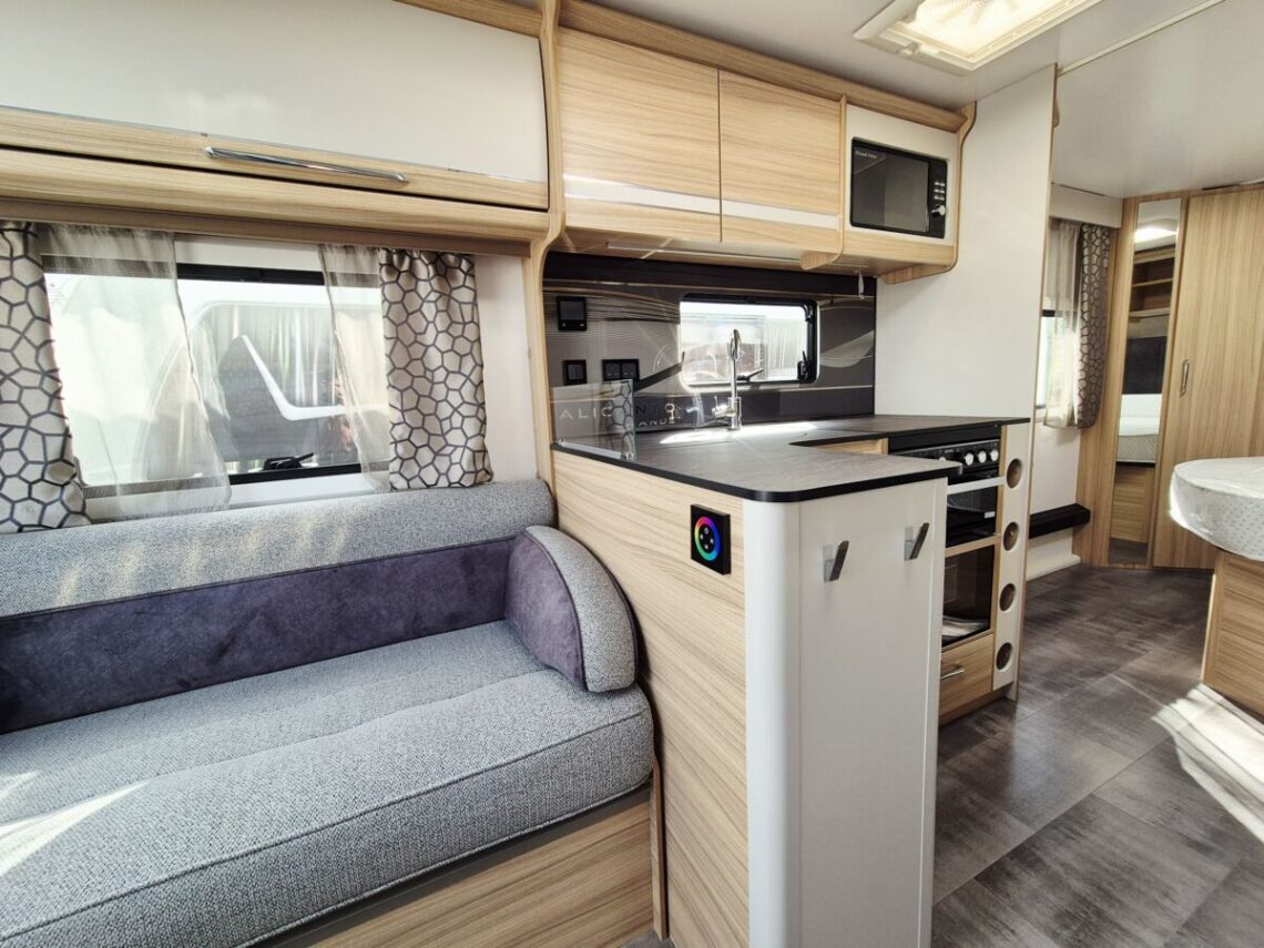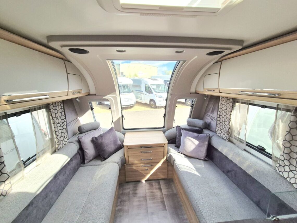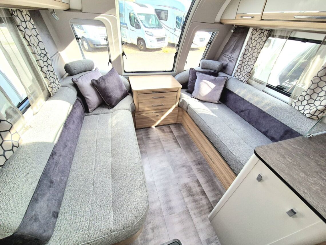 The Alicanto Grande is the Bailey Flagship range, and the Evora is the highly sought after model with a fixed King Size island bed!