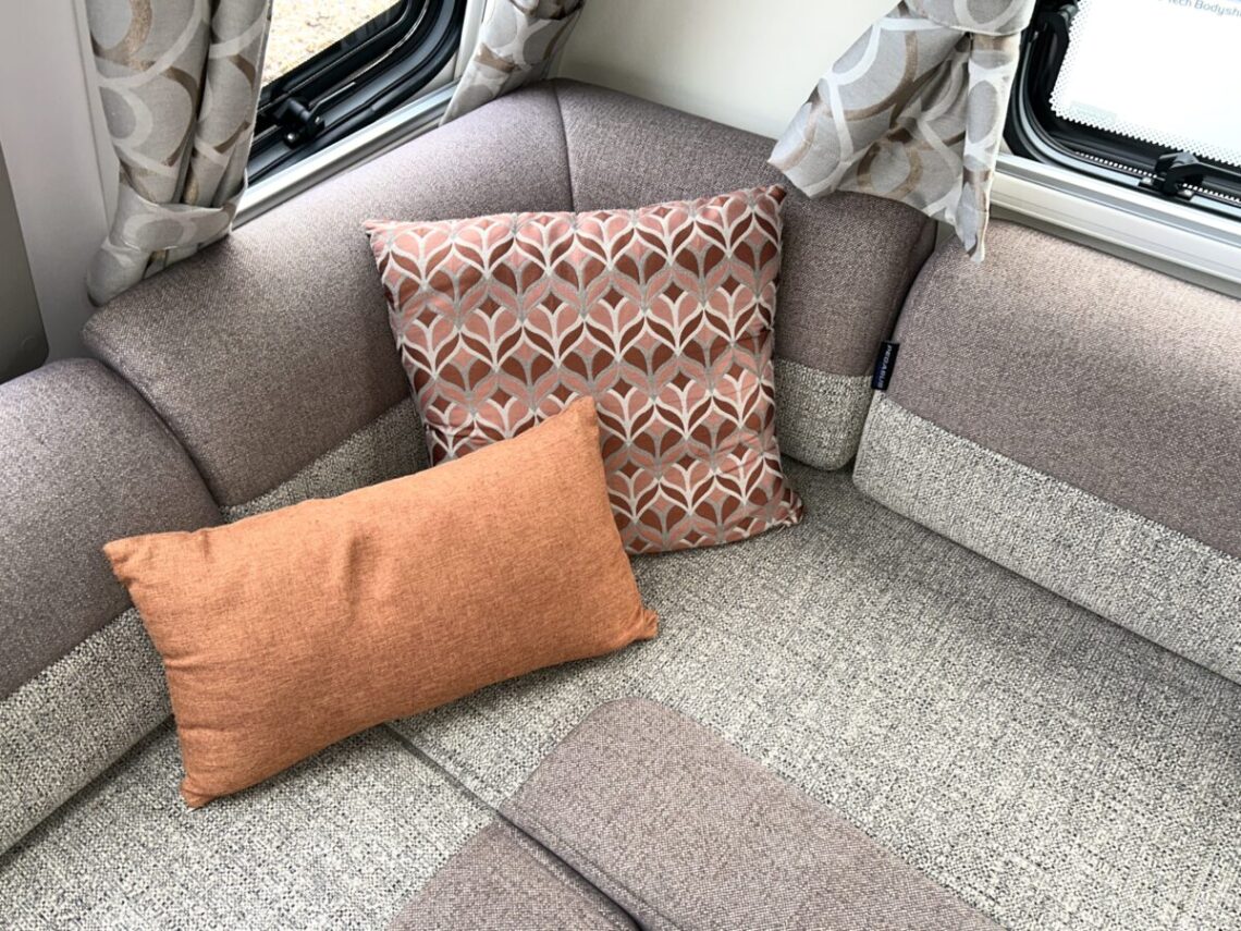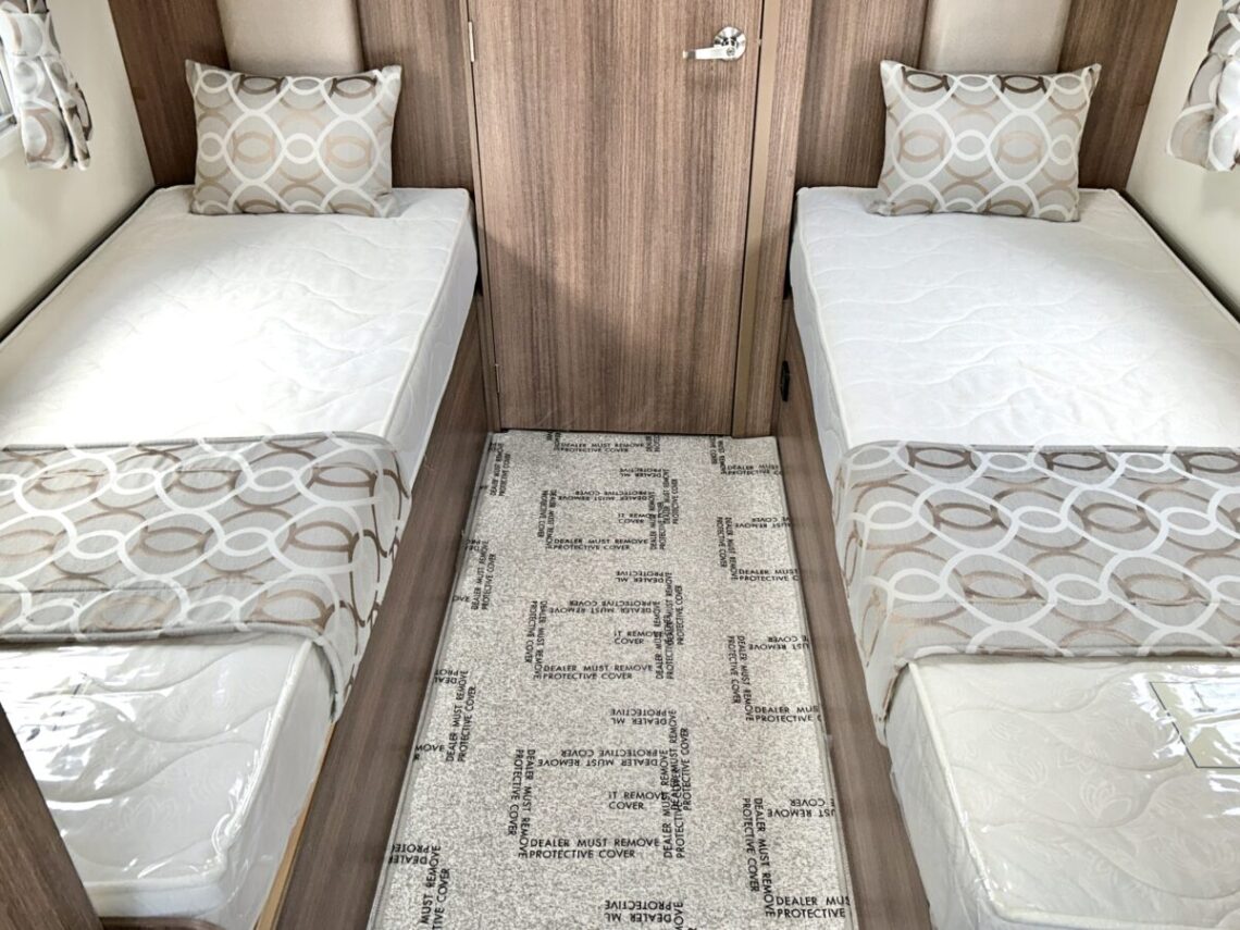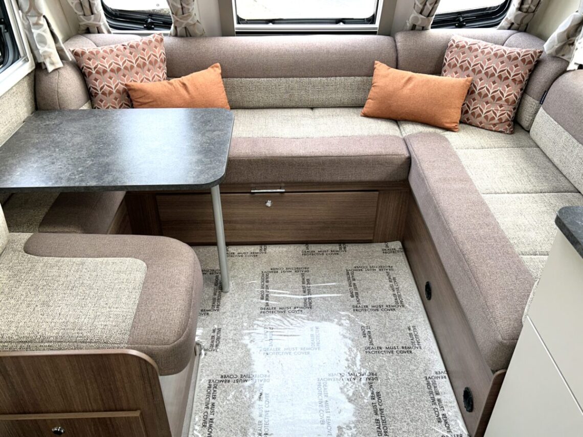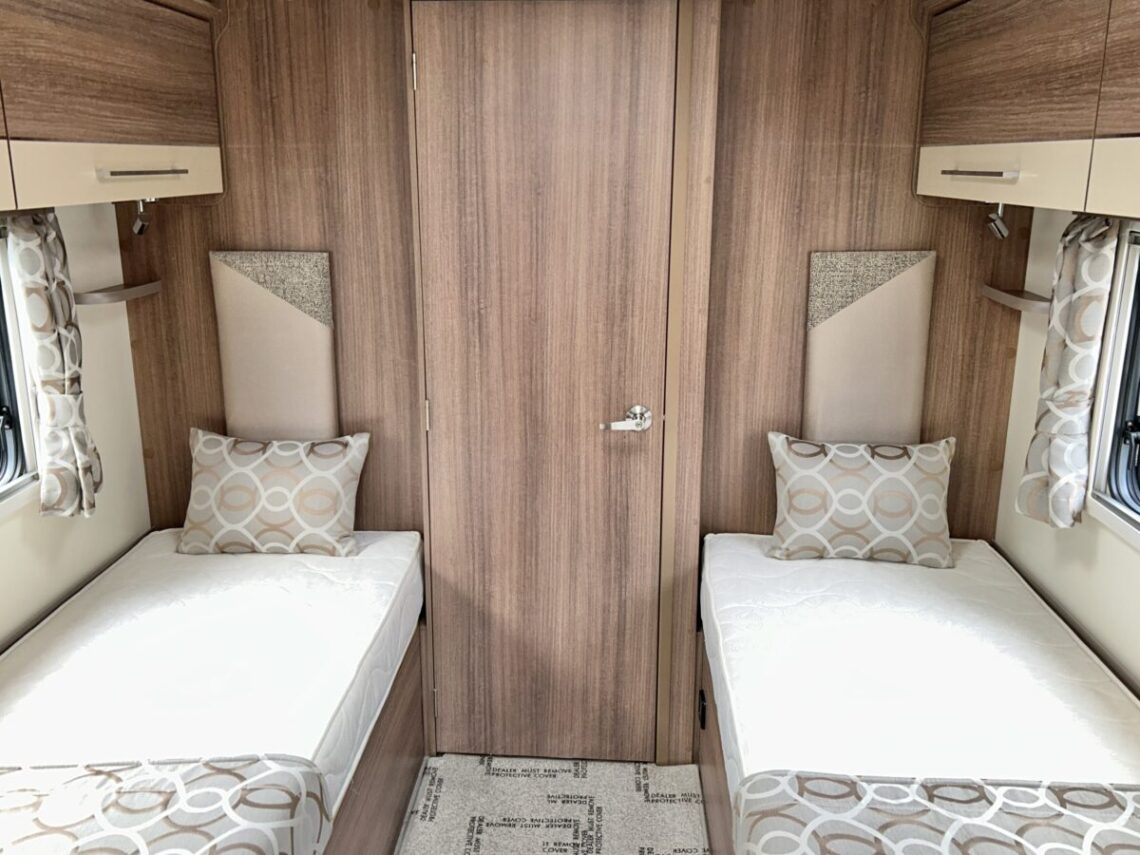 The Grande Rimini is a single axle 8ft wide model featuring a spacious ‘G’ shaped lounge, fixed twin single beds, and an end washroom.