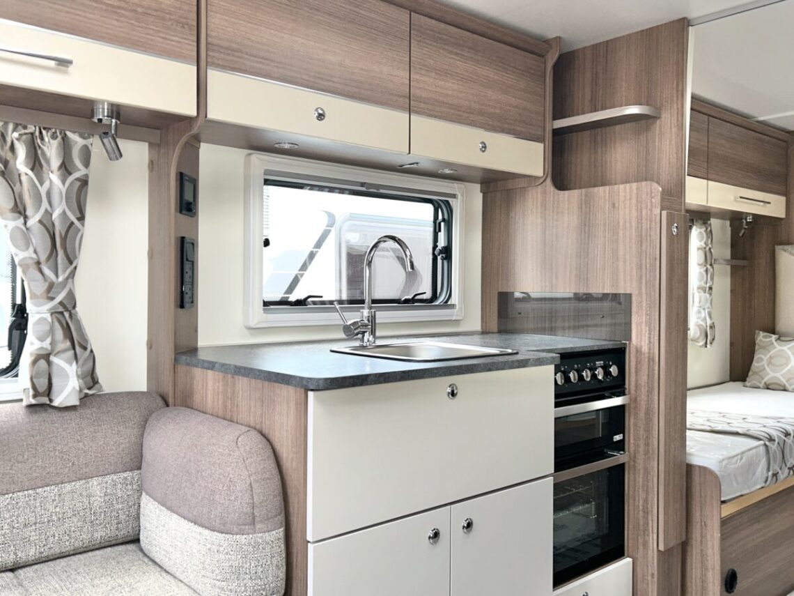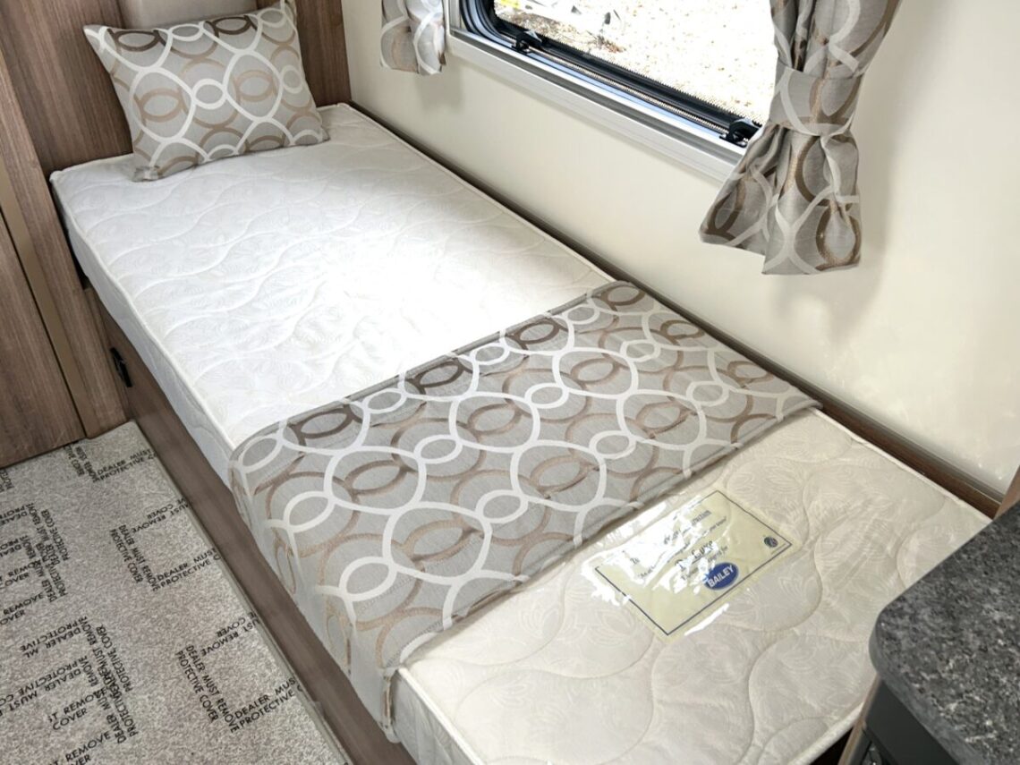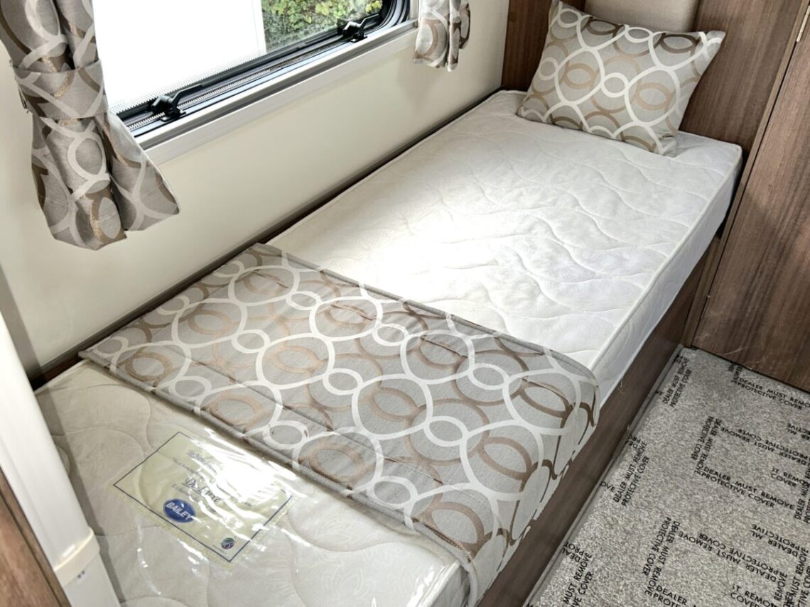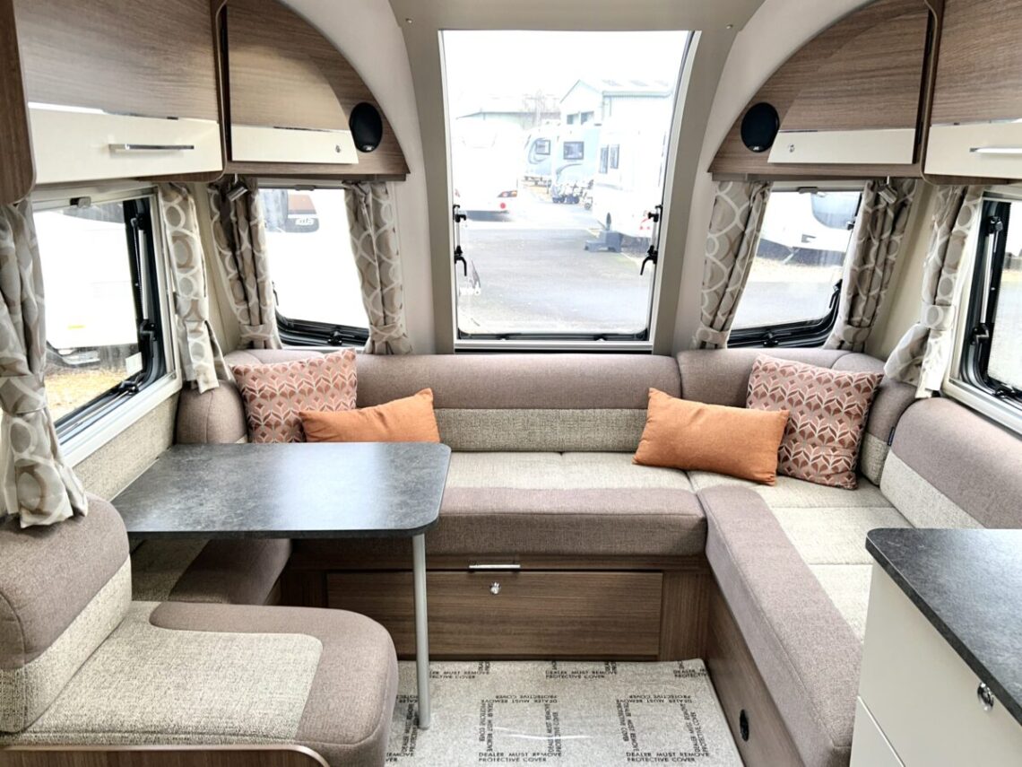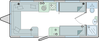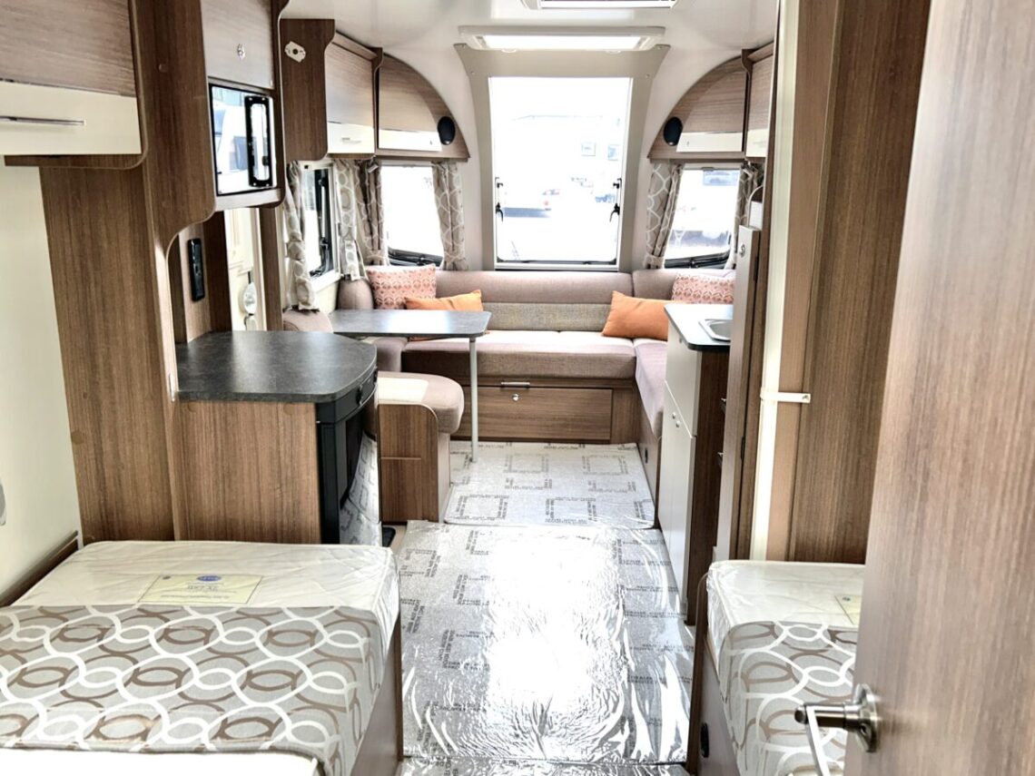 The Grande Rimini is a single axle 8ft wide model featuring a spacious ‘G’ shaped lounge, fixed twin single beds, and an end washroom.