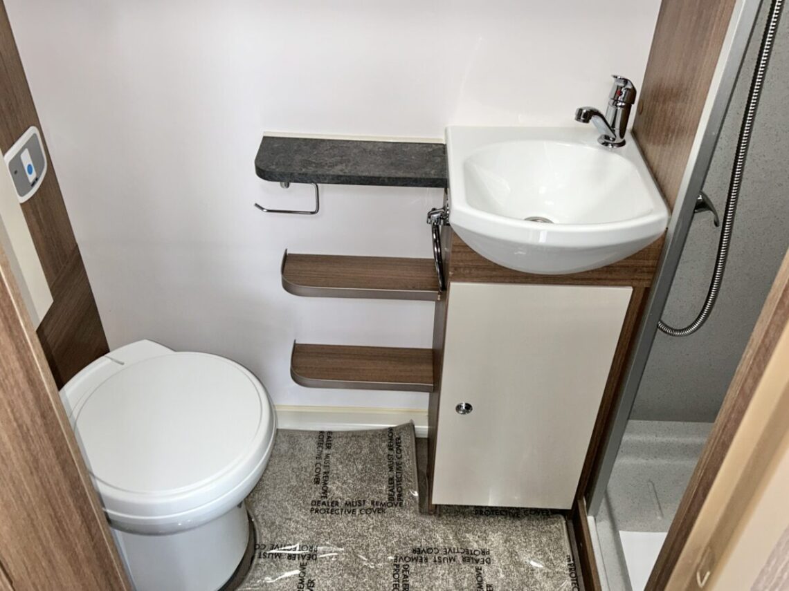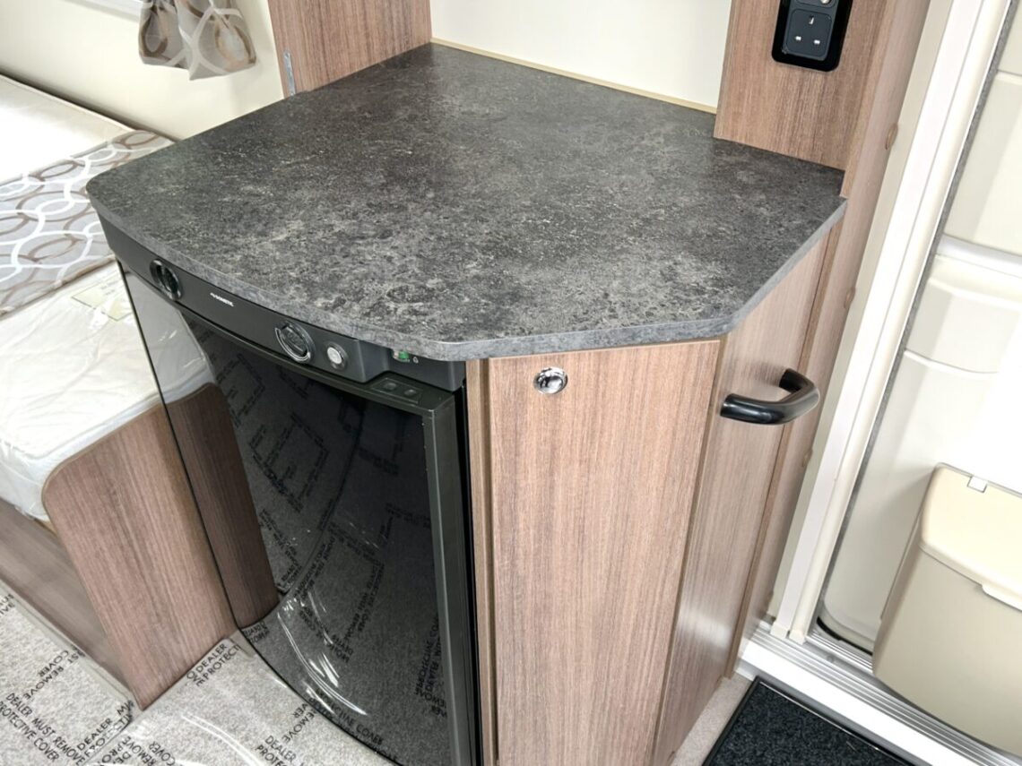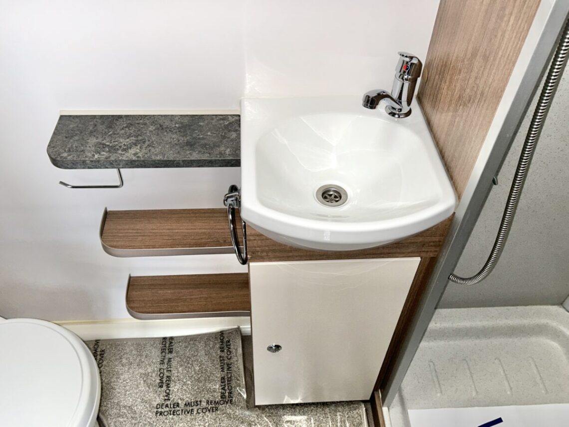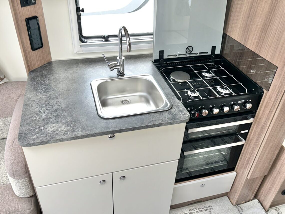 The Grande Rimini is a single axle 8ft wide model featuring a spacious ‘G’ shaped lounge, fixed twin single beds, and an end washroom.