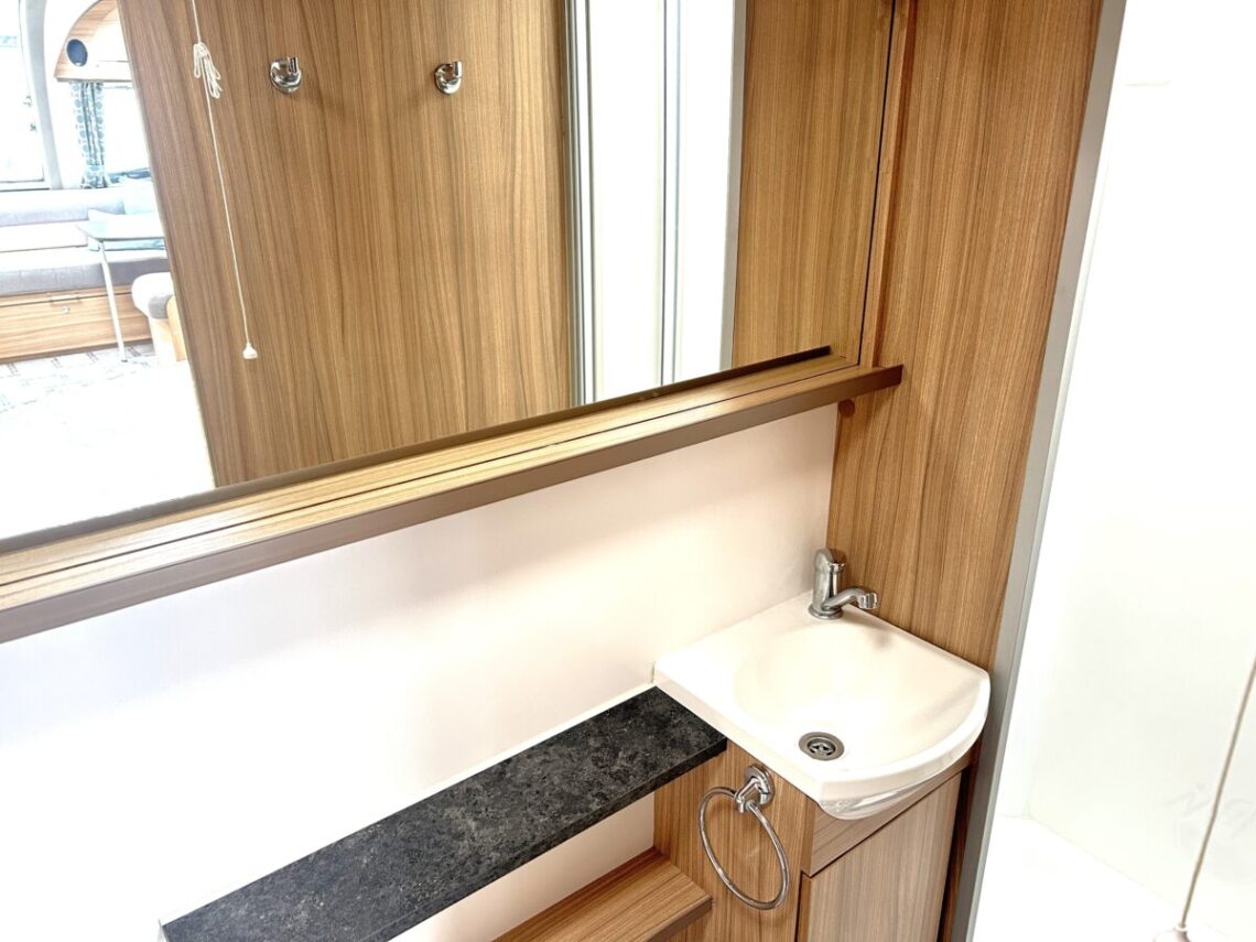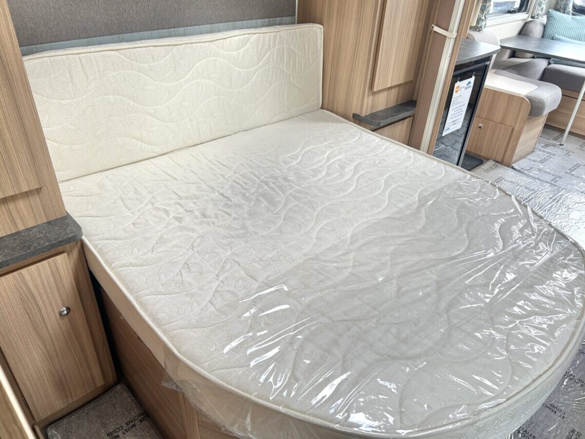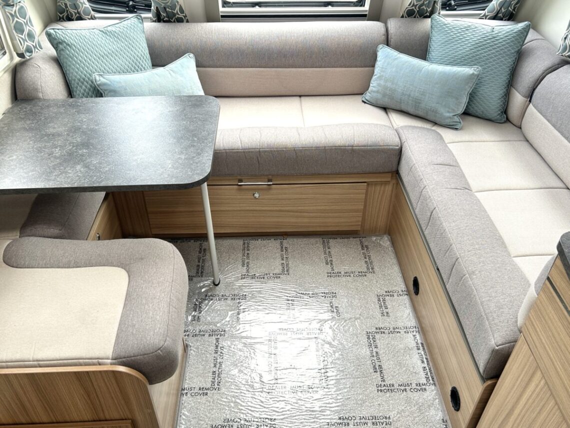 The Brindisi features a spacious 8ft wide design, with a ‘G’ shaped lounge, transverse island bed, and a full-width end washroom.