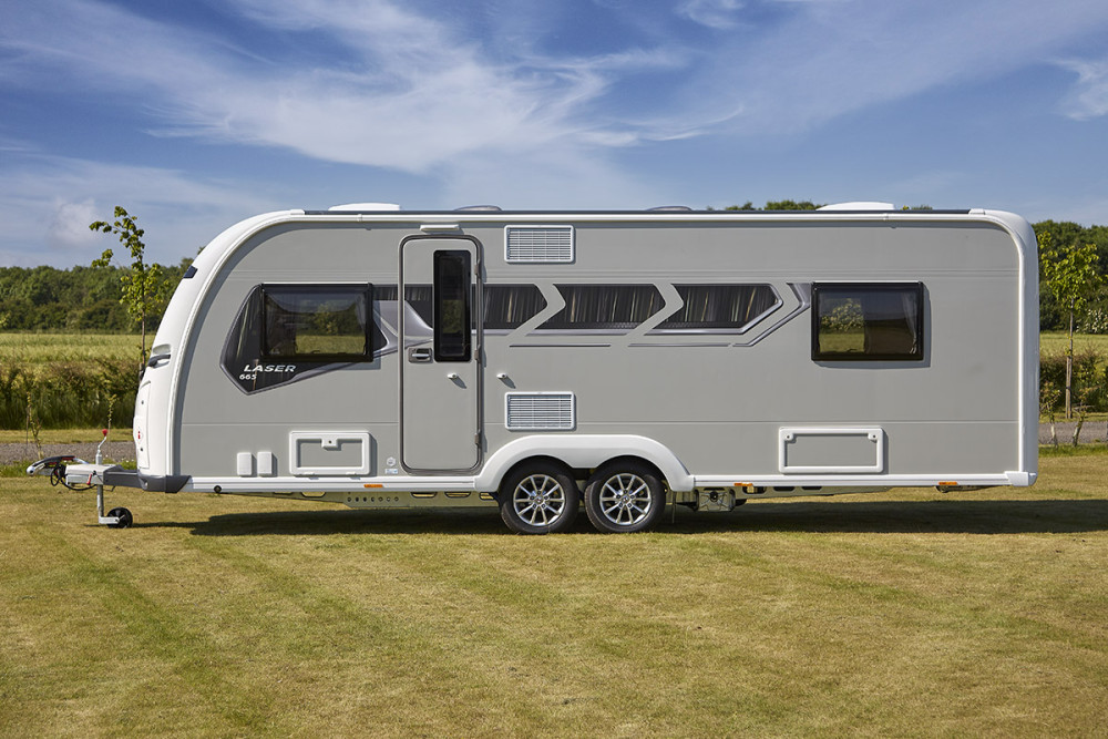 The Laser 665 Xtra is an 8ft wide twin axle model, featuring fixed twin single beds at the rear with a central washroom