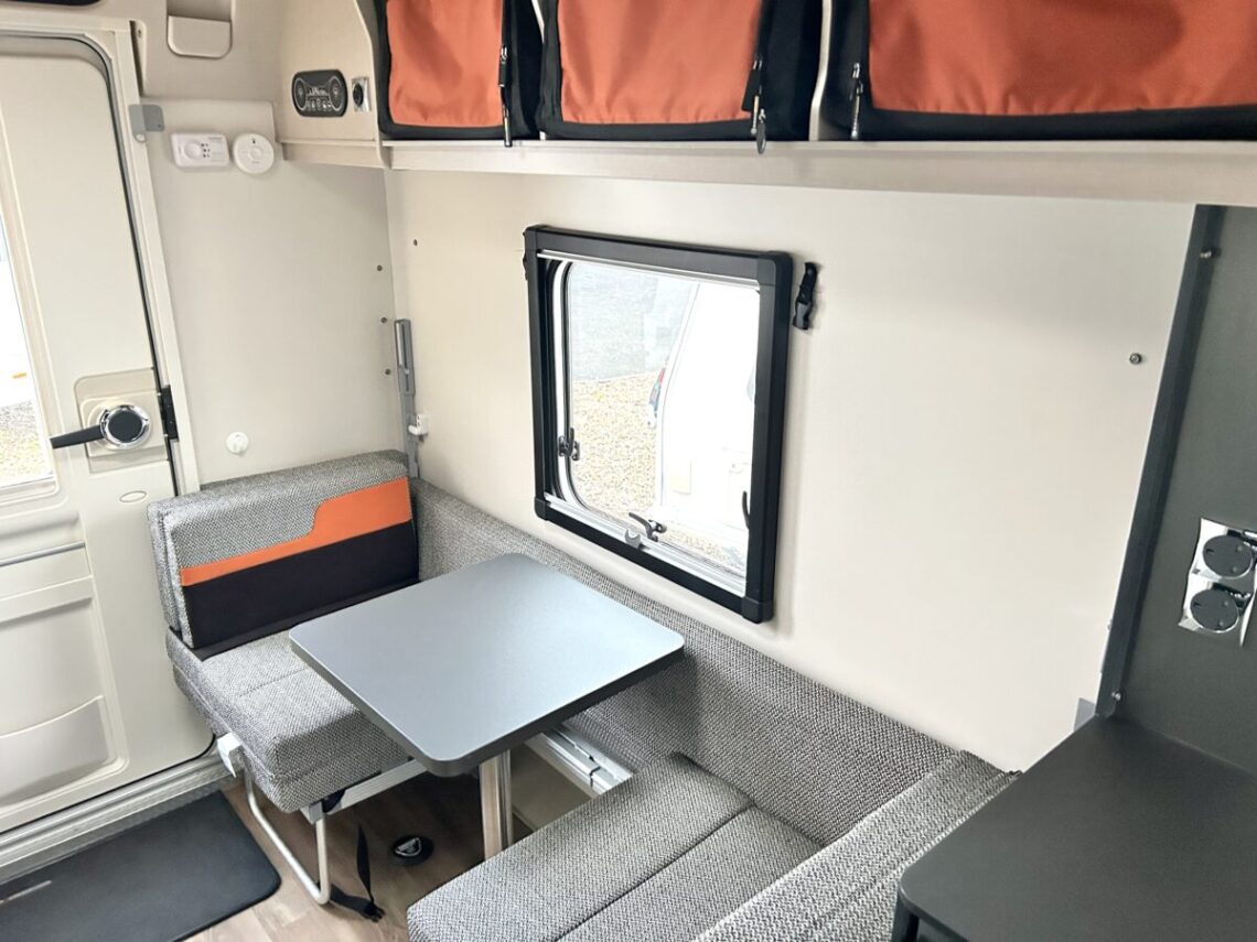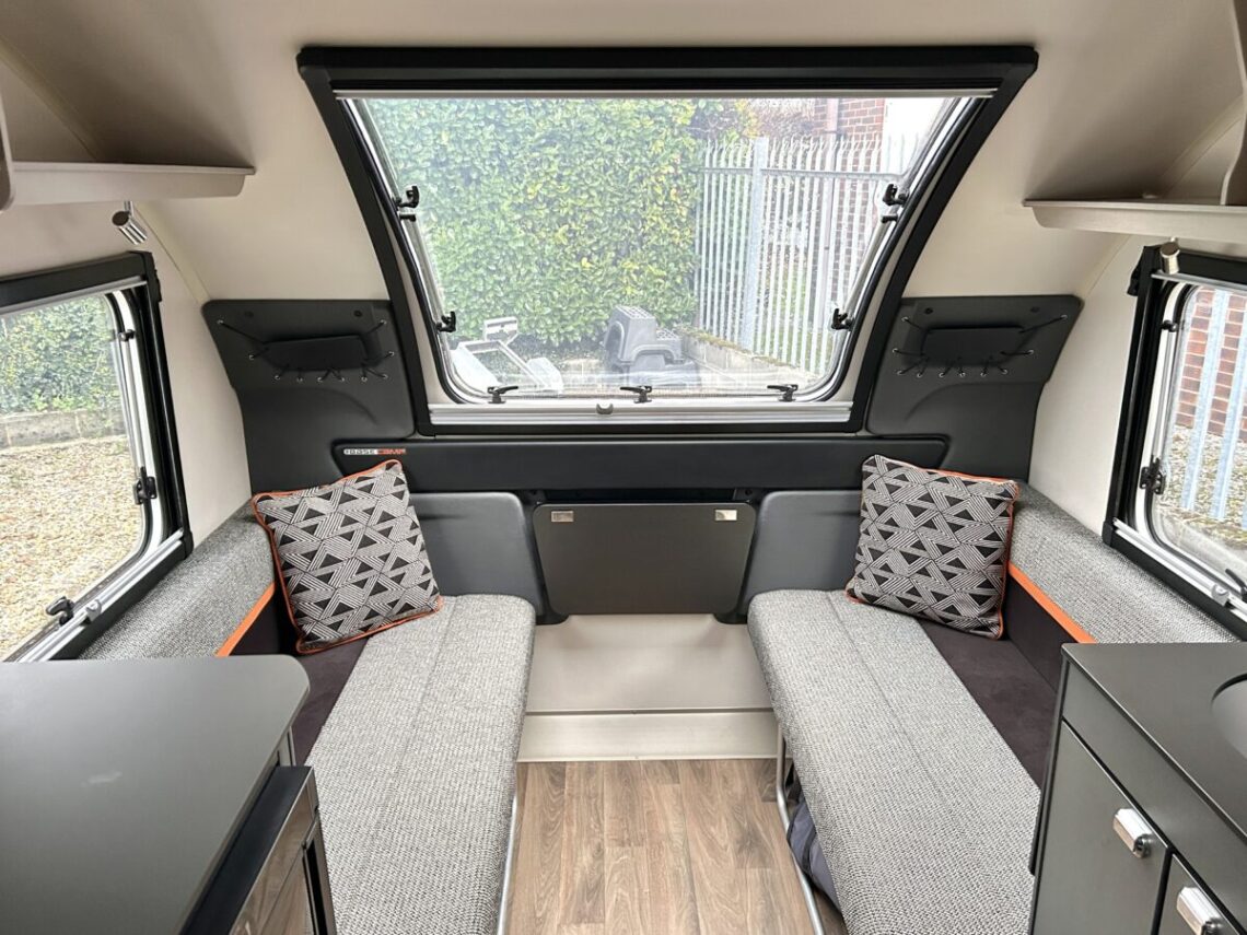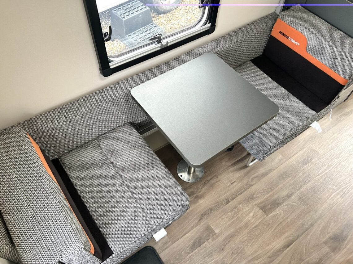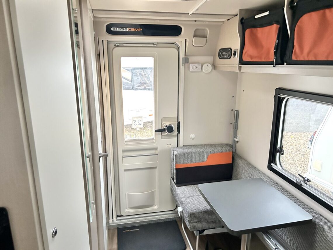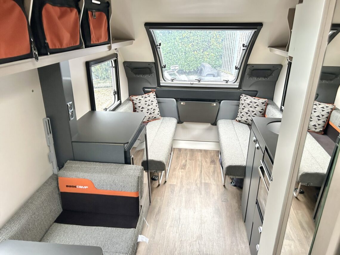 The Basecamp 4 is a unique compact 4 berth model featuring a central side dinette and a rear entrance door