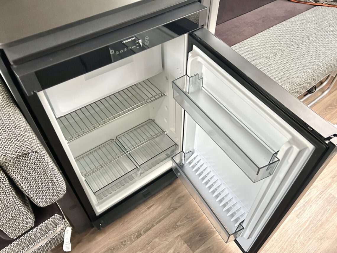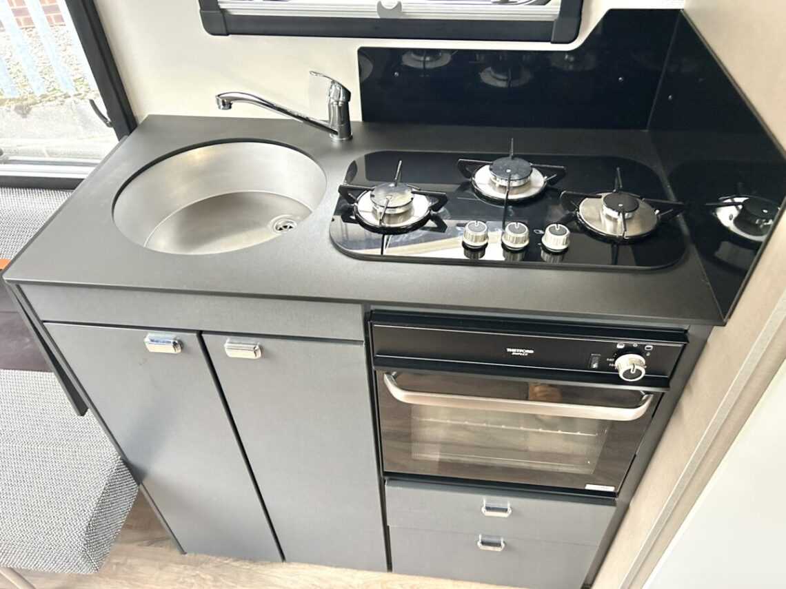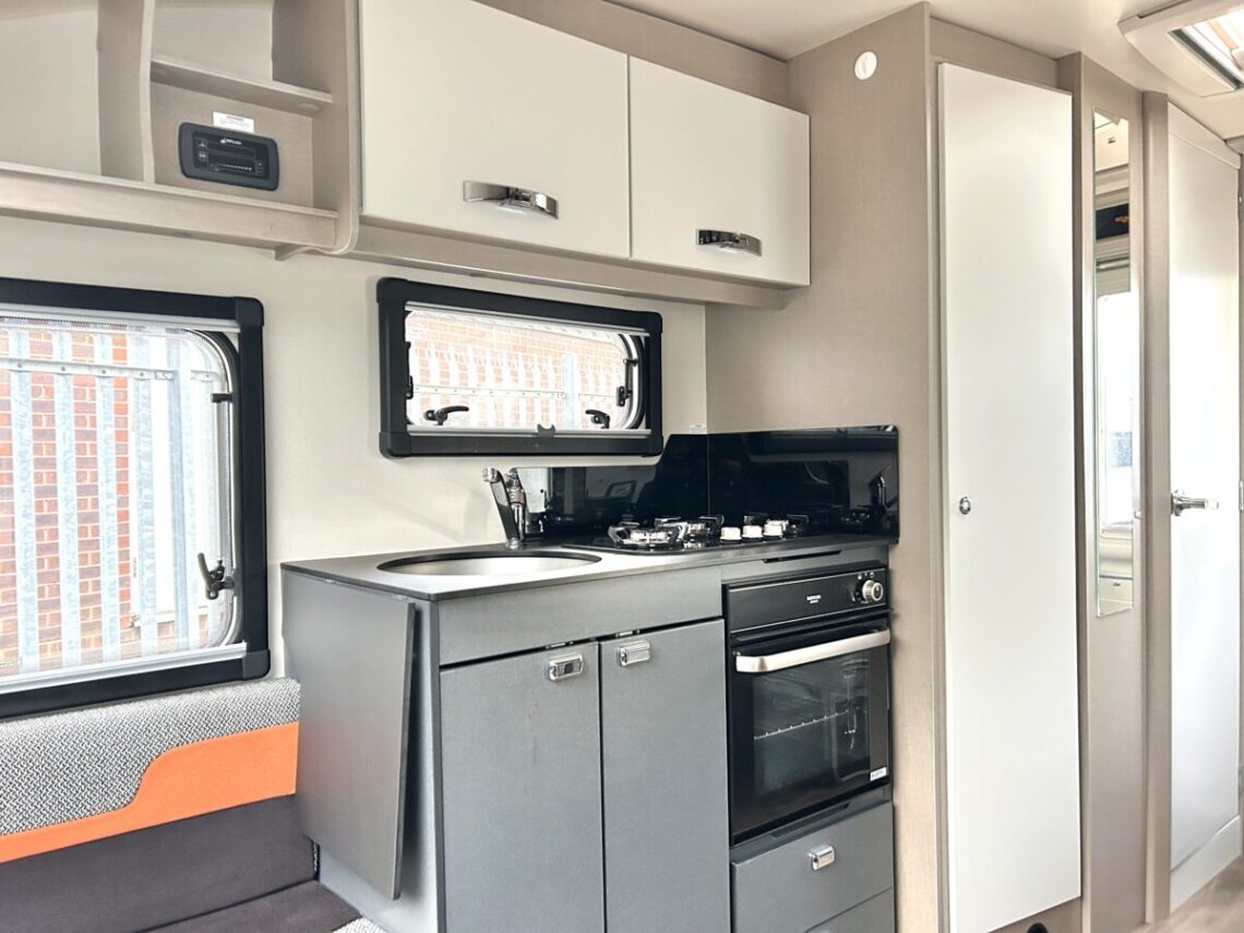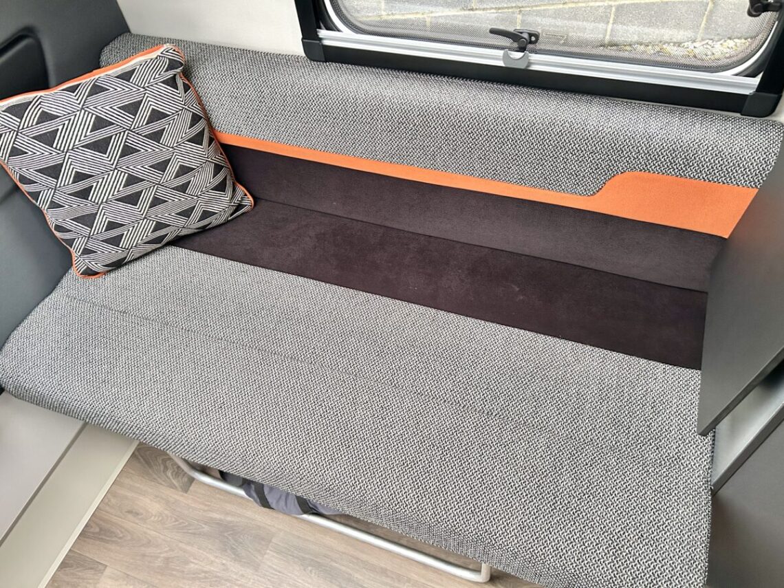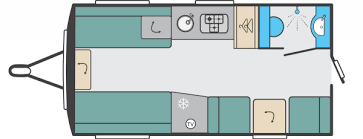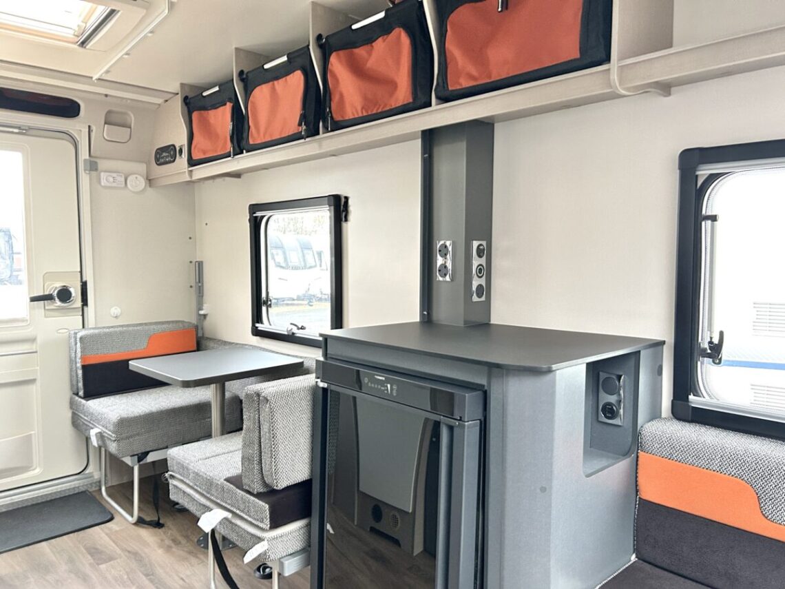 The Basecamp 4 is a unique compact 4 berth model featuring a central side dinette and a rear entrance door