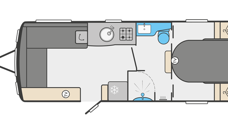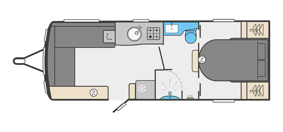 The 650L is the most sought after layout with the ‘L’ shaped front lounge, centre washroom and end bedroom with fixed island bed