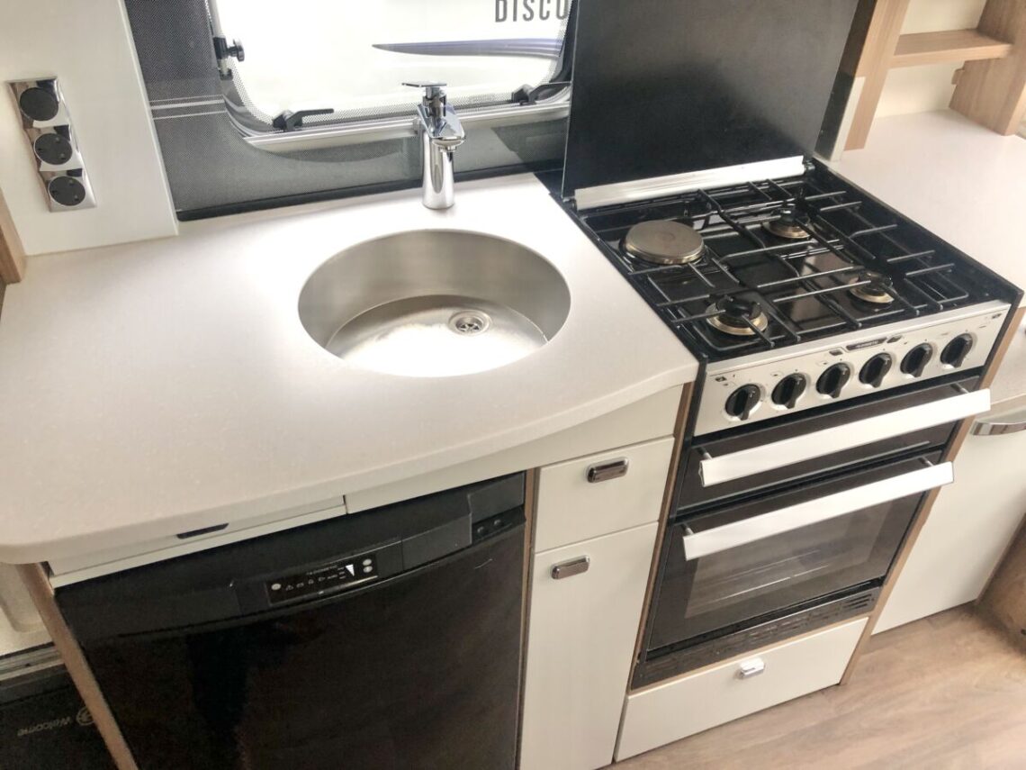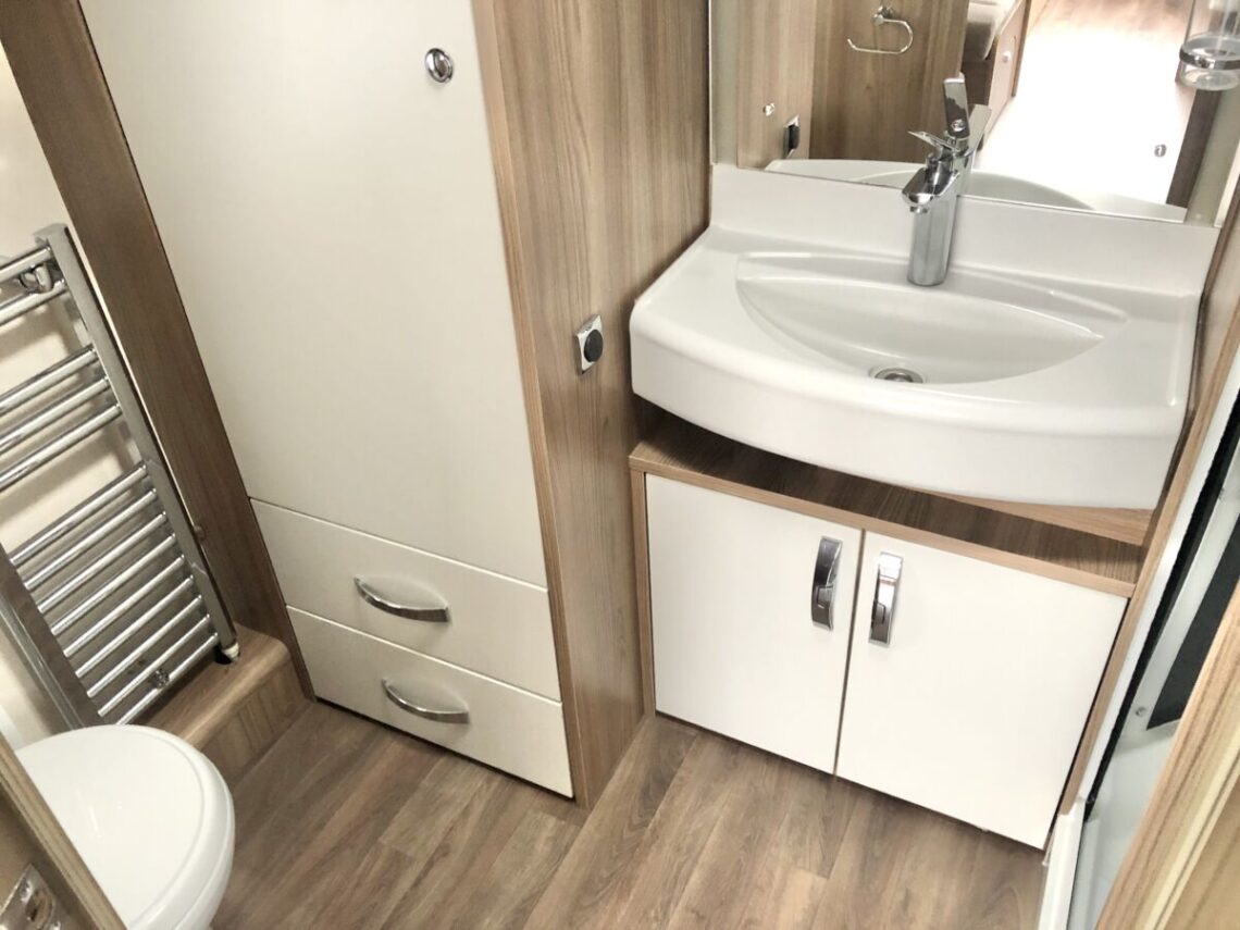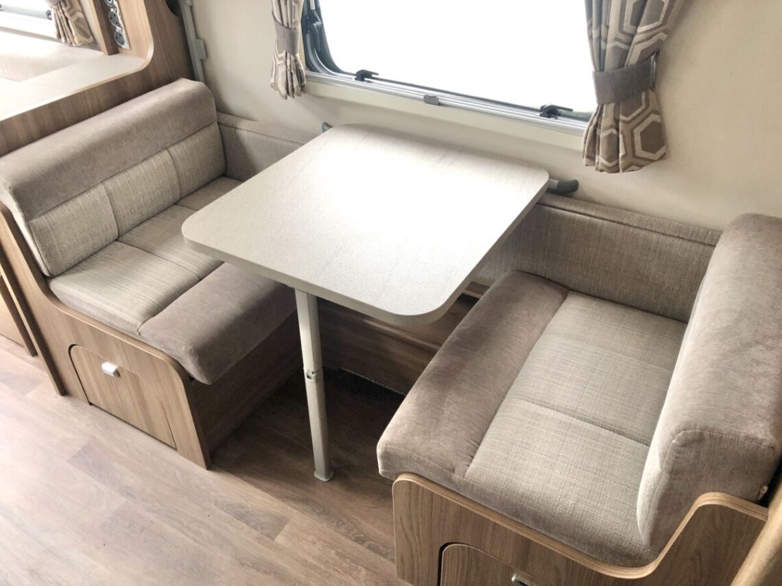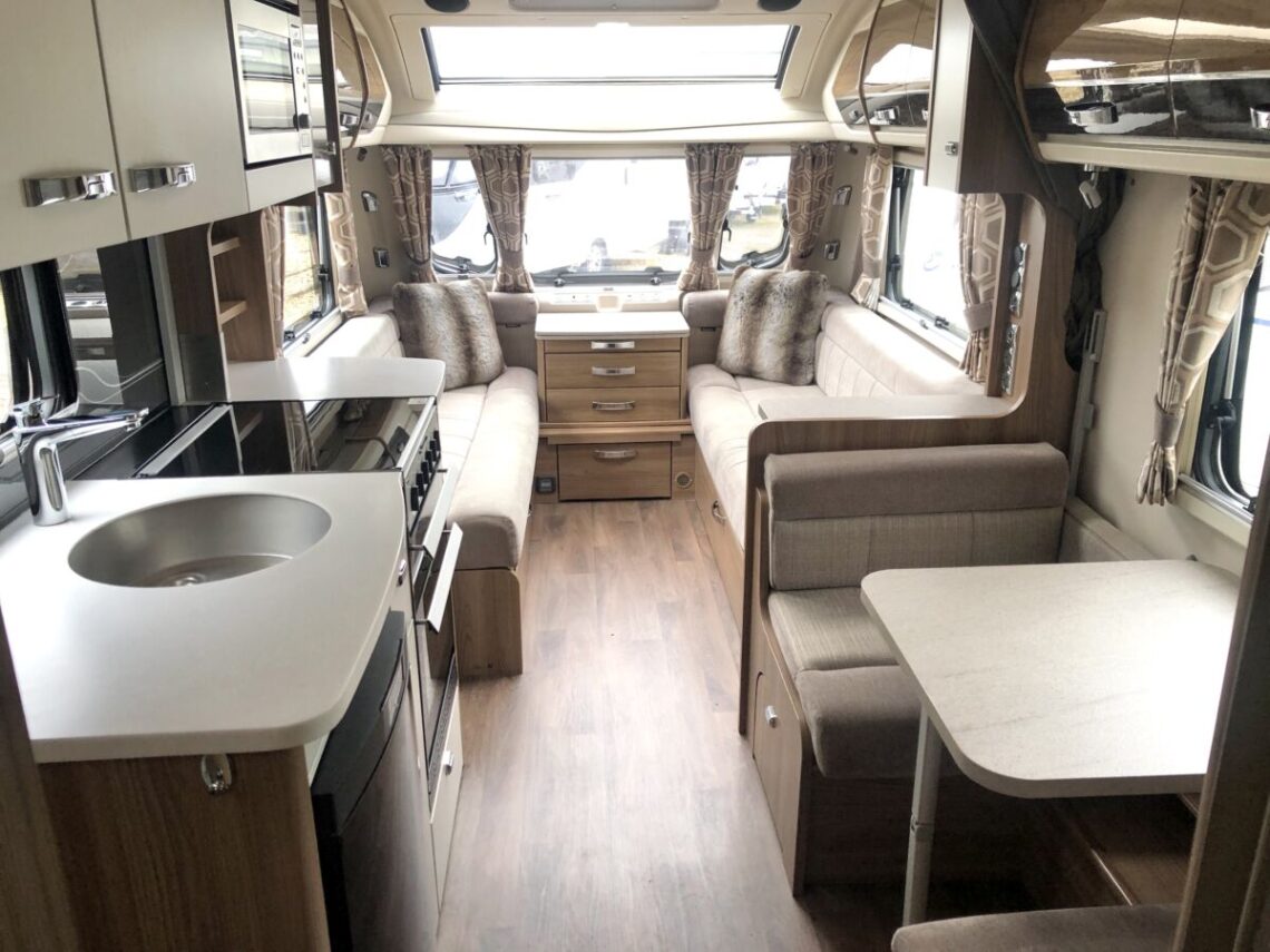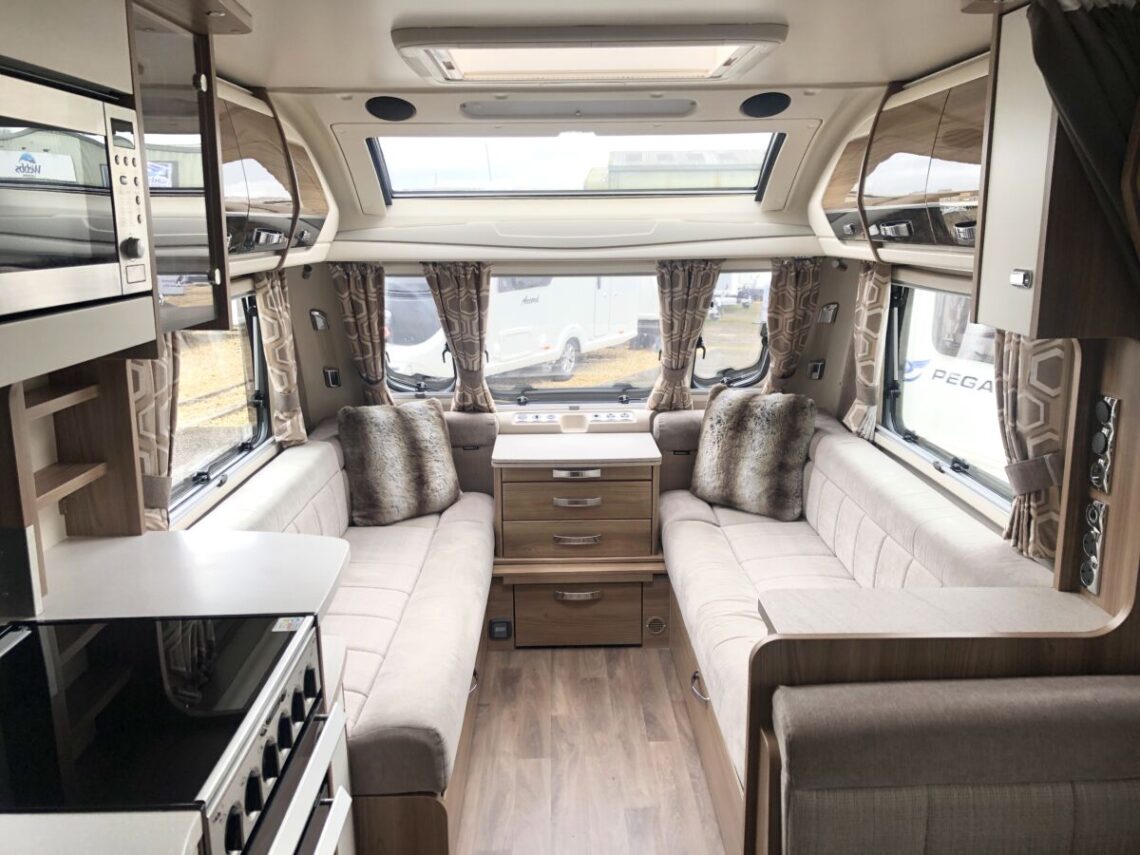 The Elegance 530 is a luxury 4 berth model with a spacious layout featuring a central side dinette and full width end washroom