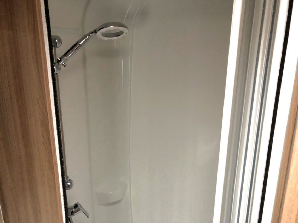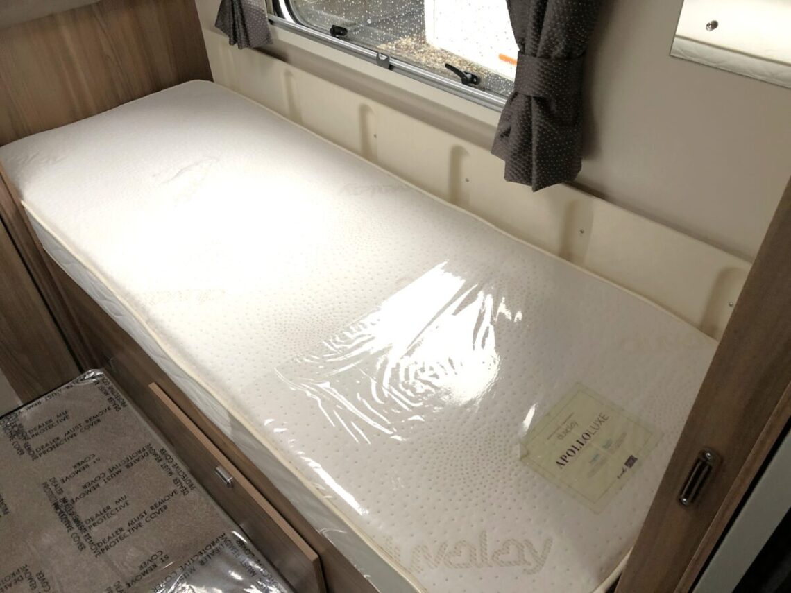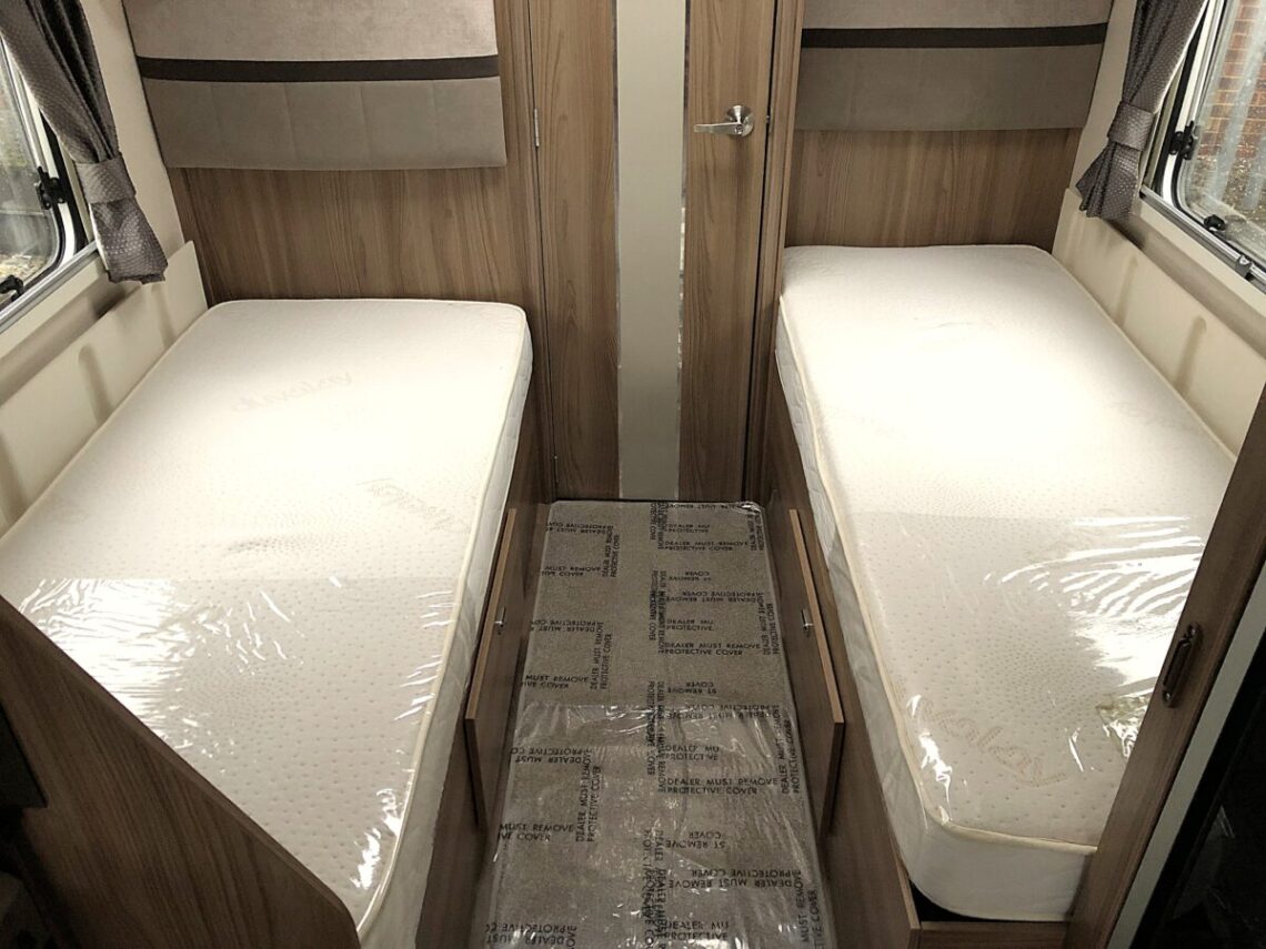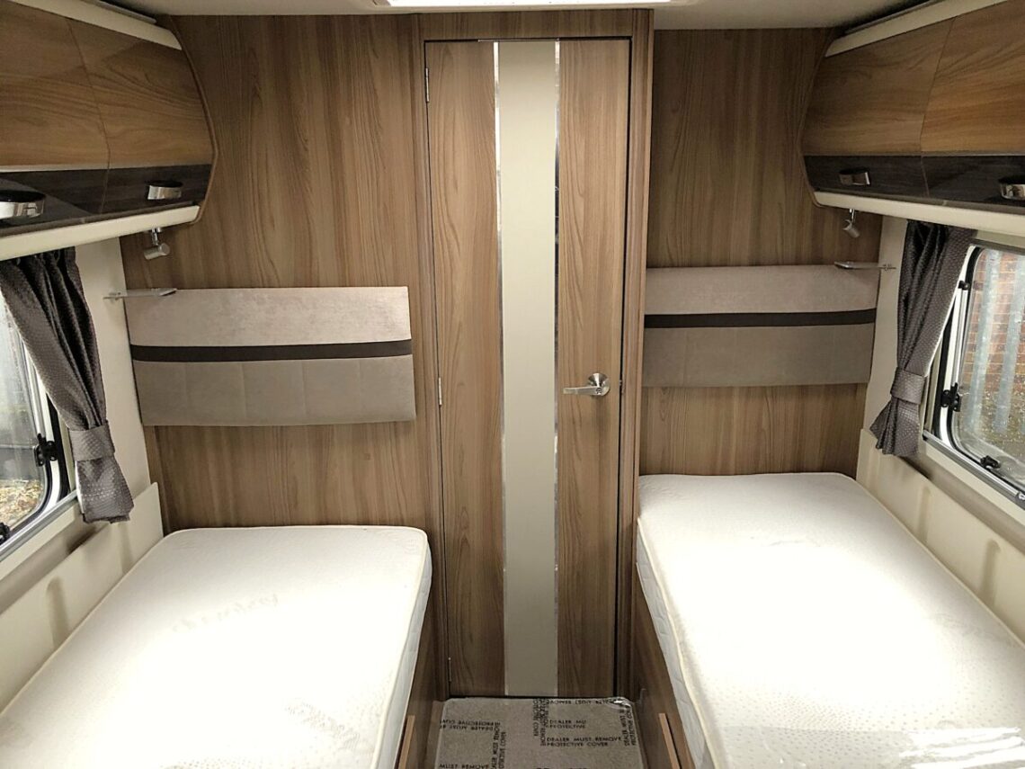 The Elegance 565 is a spacious twin fixed single bed model with a full width end washroom