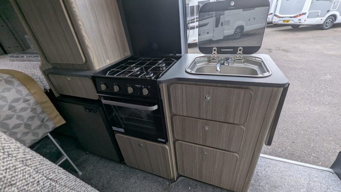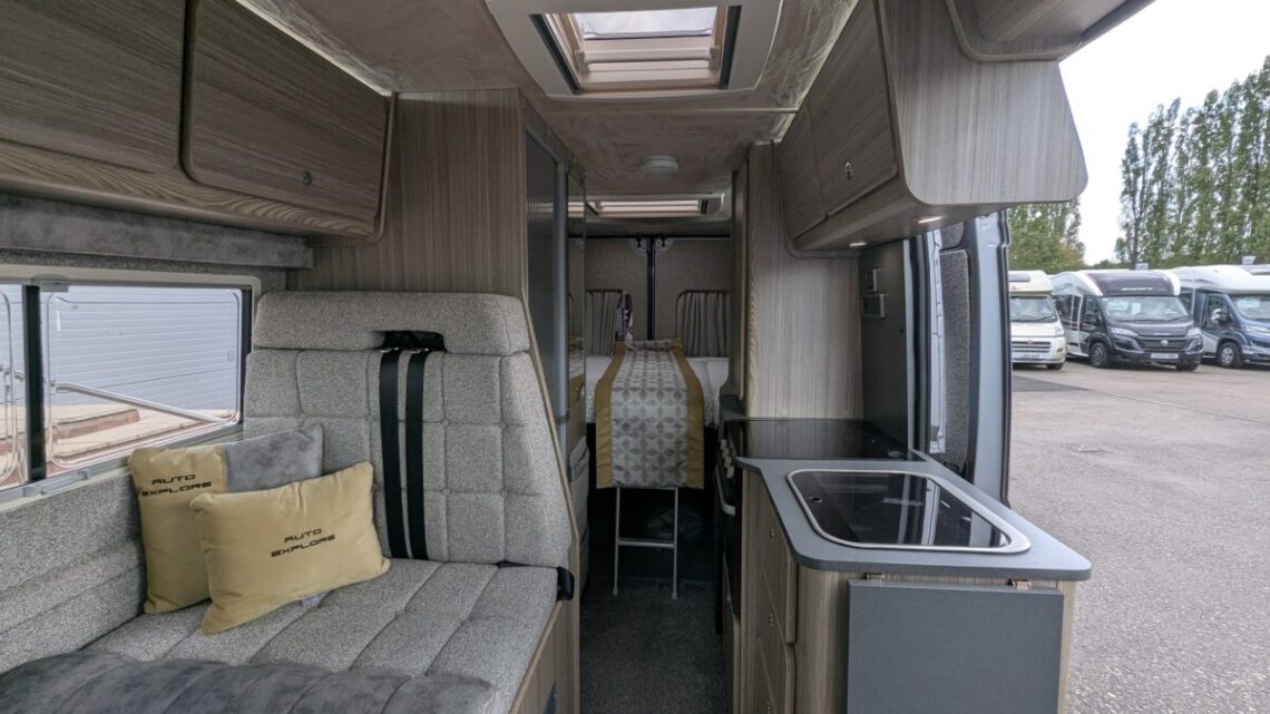 The Auto-Explore RB is a compact, stylish campervan designed for easy travel and comfort. Its standout feature is a fixed rear double bed, so you don’t have to set up or pack away your sleeping area each day. The front seats swivel to create a cosy lounge space, and the kitchen and bathroom are neatly fitted with everything you need for life on the road.
