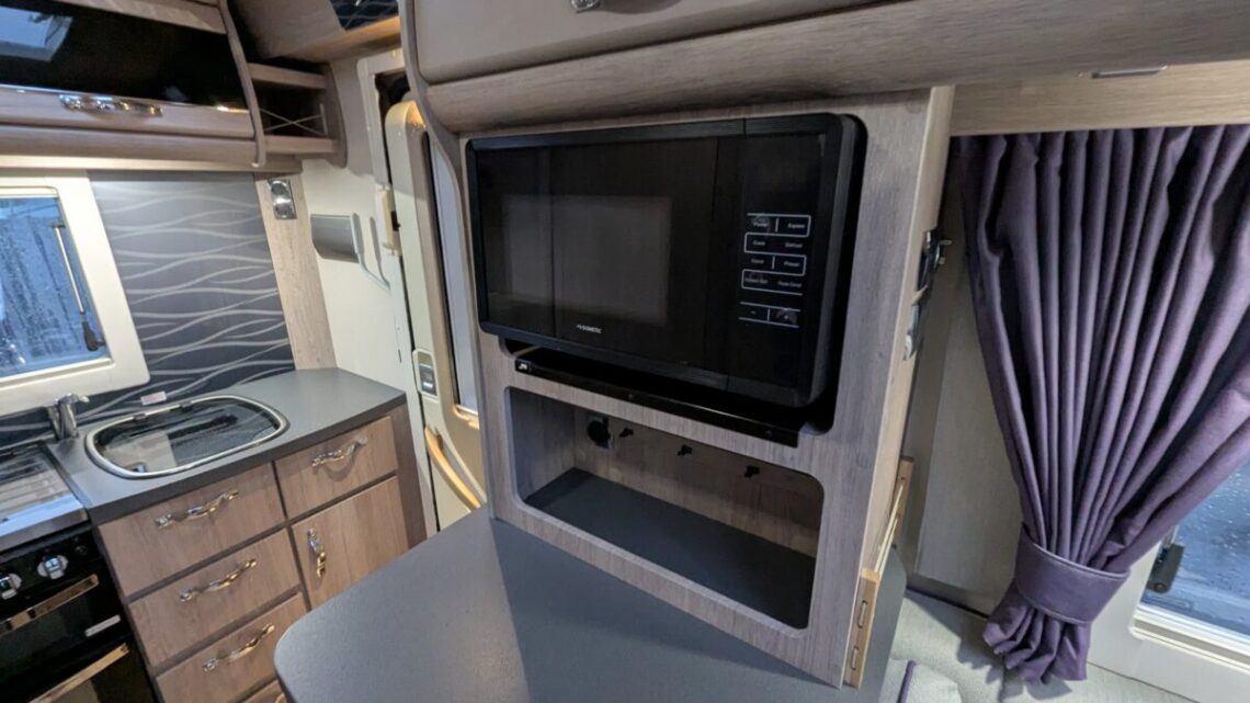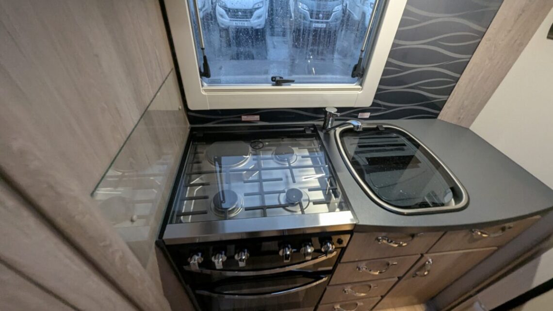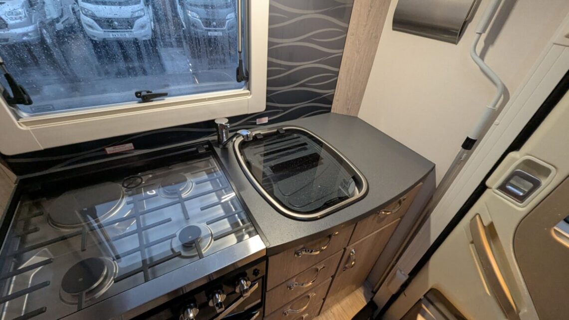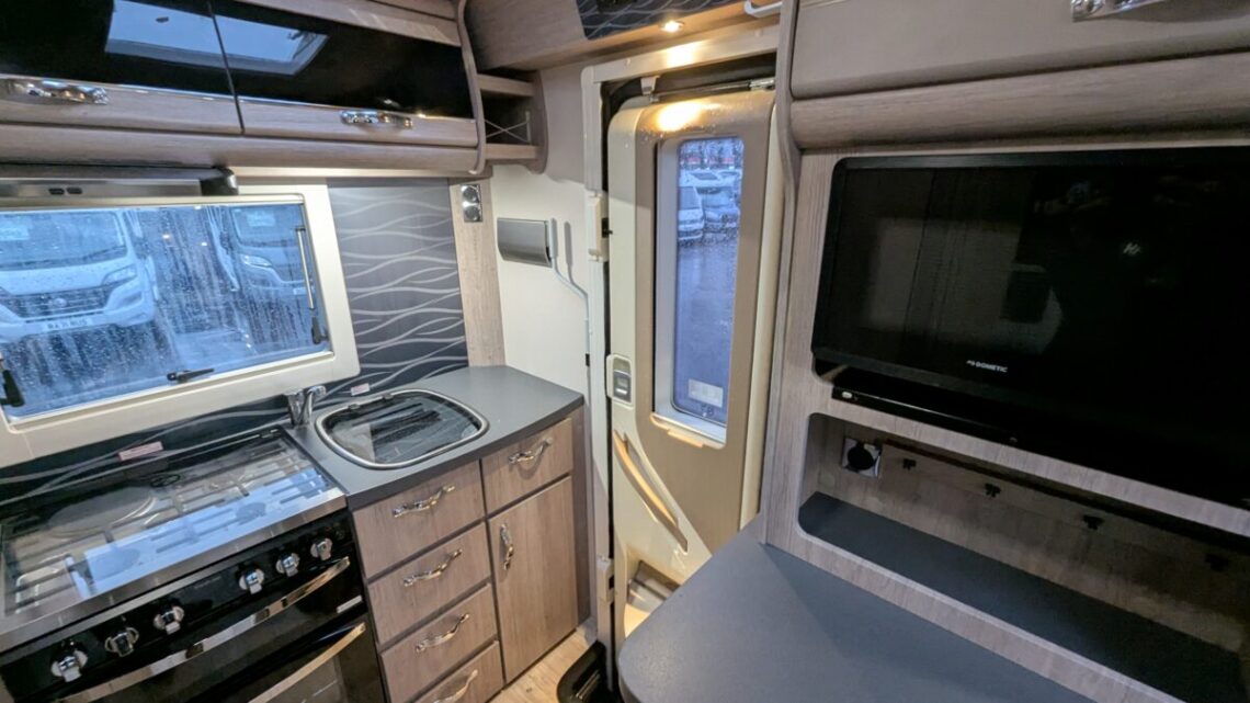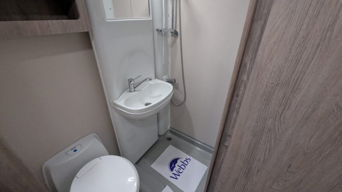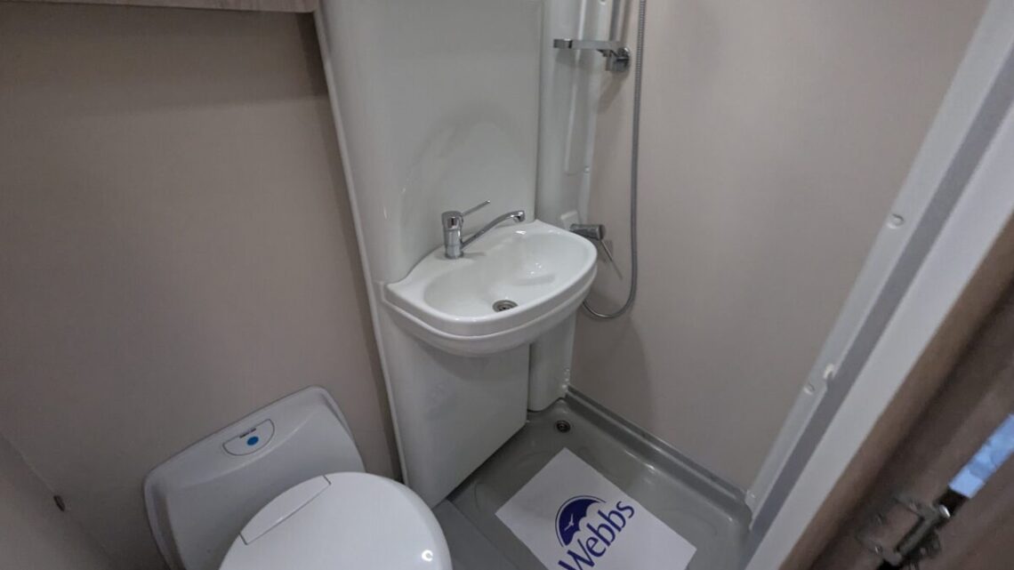 Inside, the Nuevo EK features a bright and welcoming front lounge with flexible seating that effortlessly converts into either a spacious double bed or two comfortable single beds. At the rear, the well-designed end kitchen is fully equipped for life on the move, offering a three-burner hob, microwave, fridge/freezer, and ample worktop and storage space. Adjacent to the kitchen is a practical rear washroom, providing a toilet, washbasin, and shower facilities for complete independence wherever your travels take you.