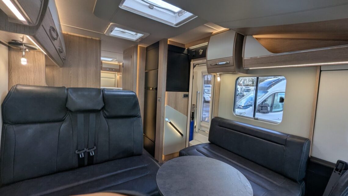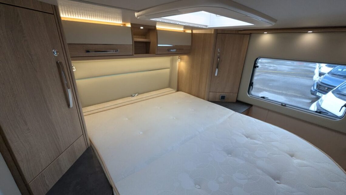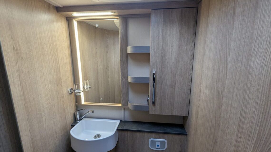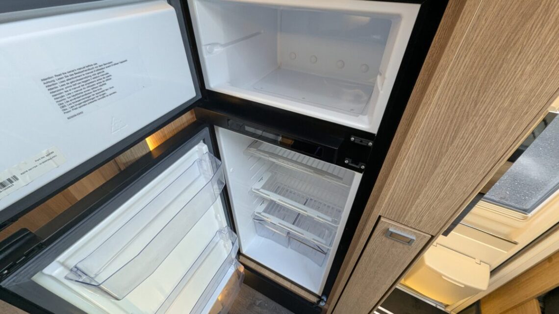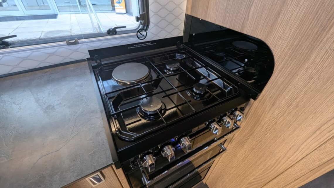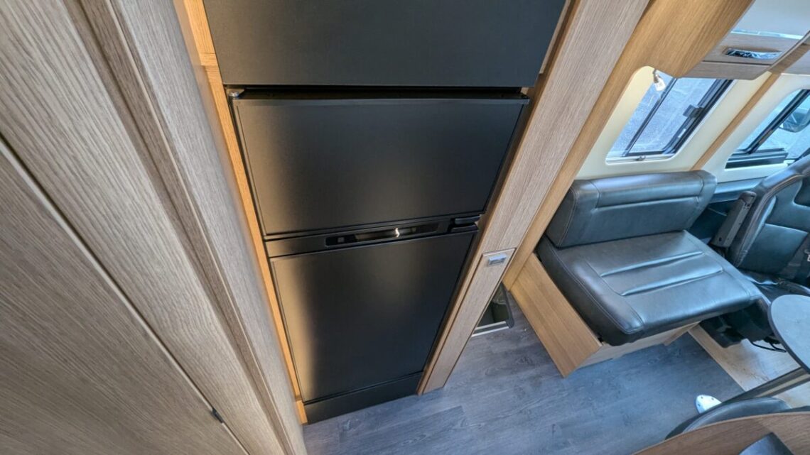 Moving forward, the motorhome features a central kitchen, equipped with a four‑ring hob, oven/grill, and a large 171‑litre fridge, giving it the practicality needed for extended touring. Opposite the kitchen sits the washroom and separate shower, forming a functional mid‑section that separates the living and sleeping spaces.