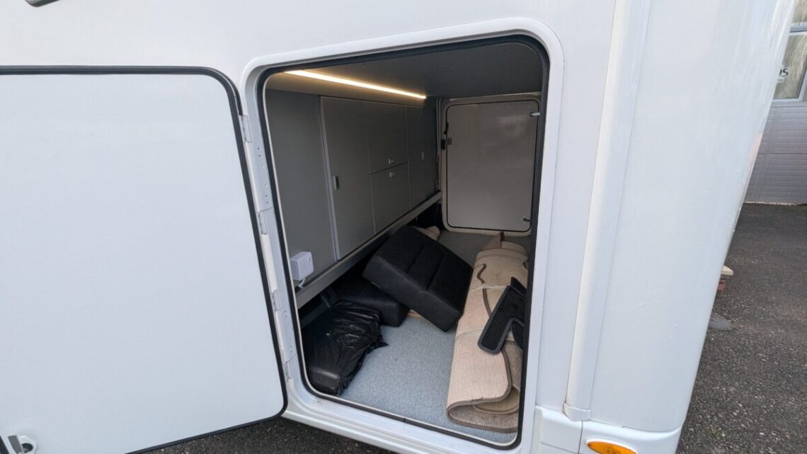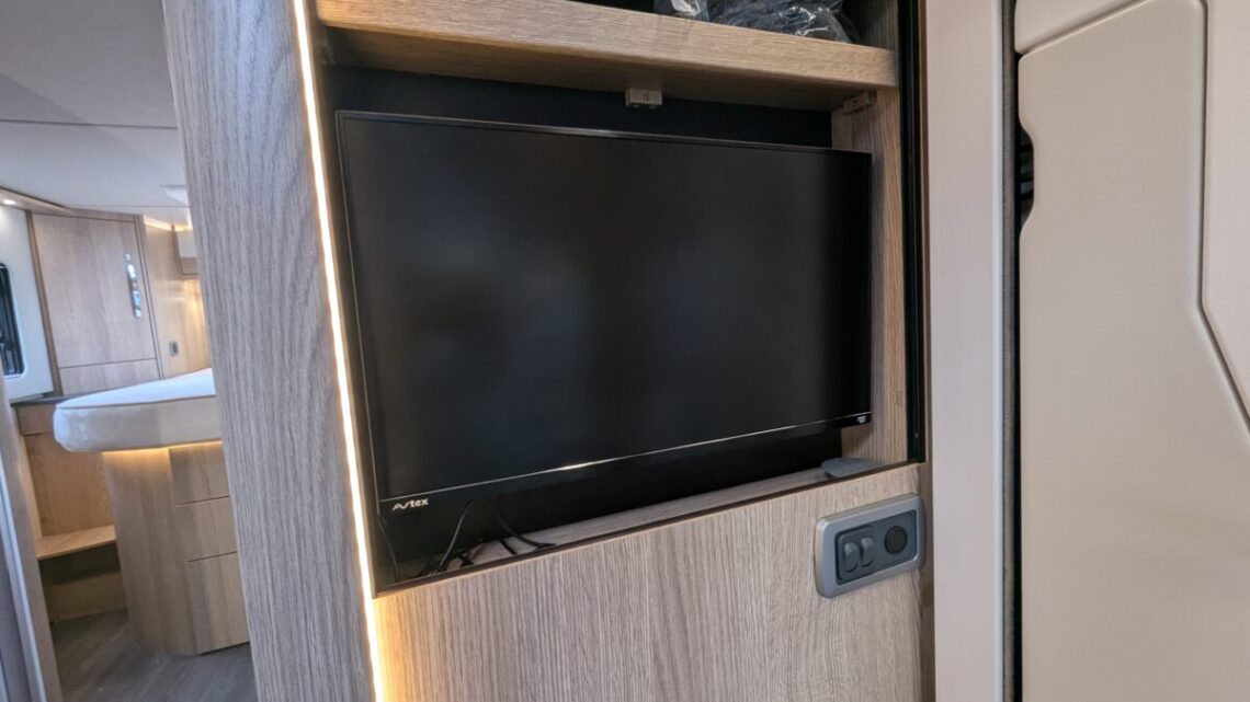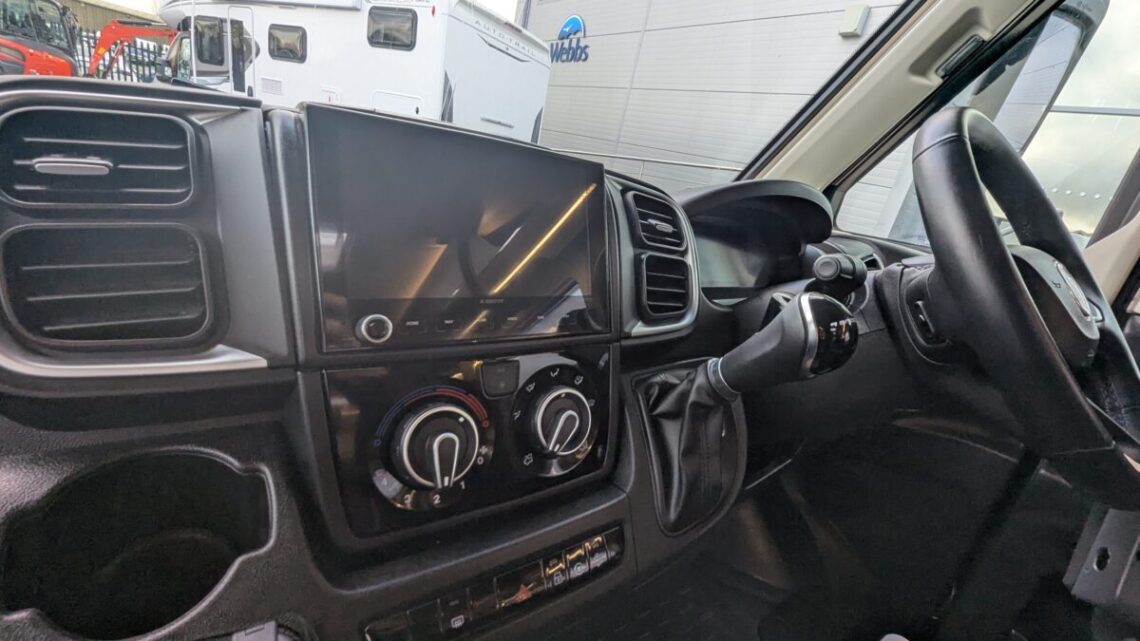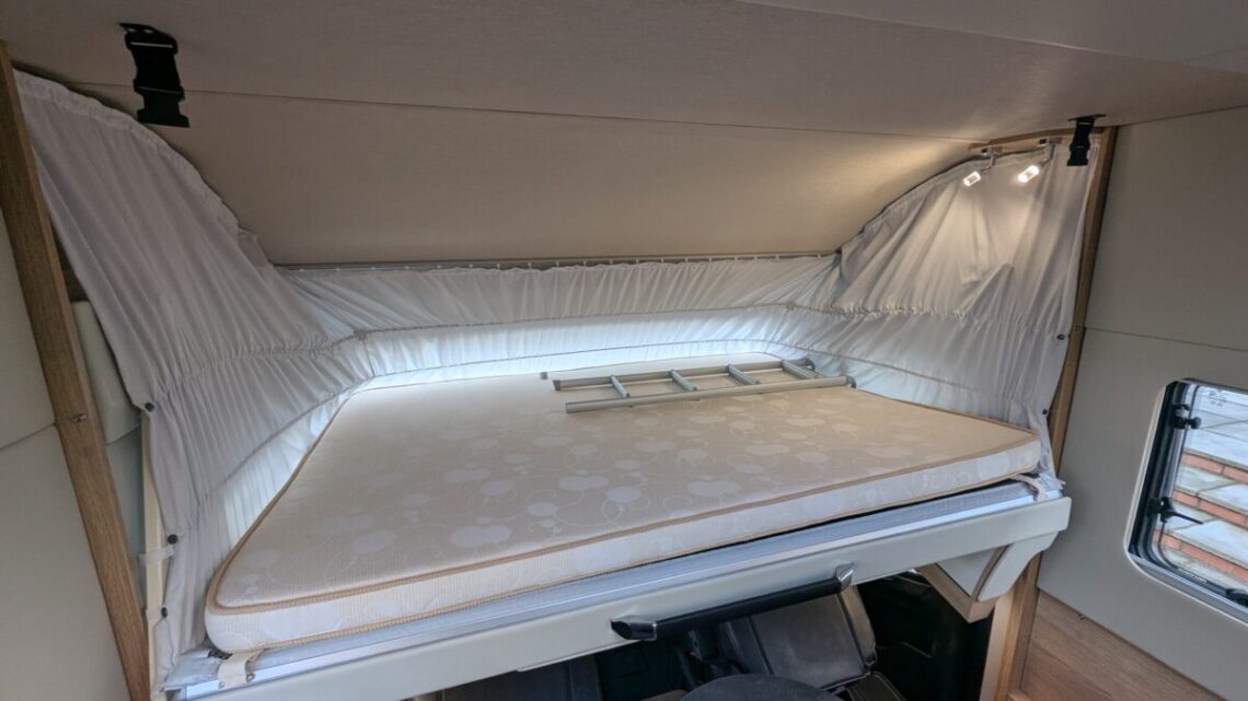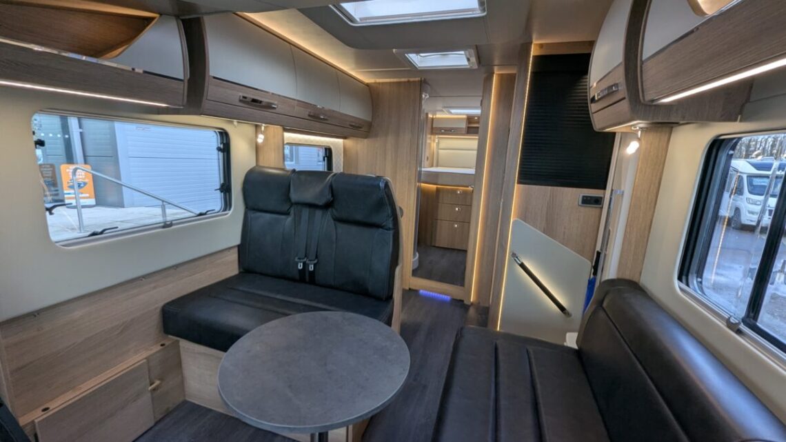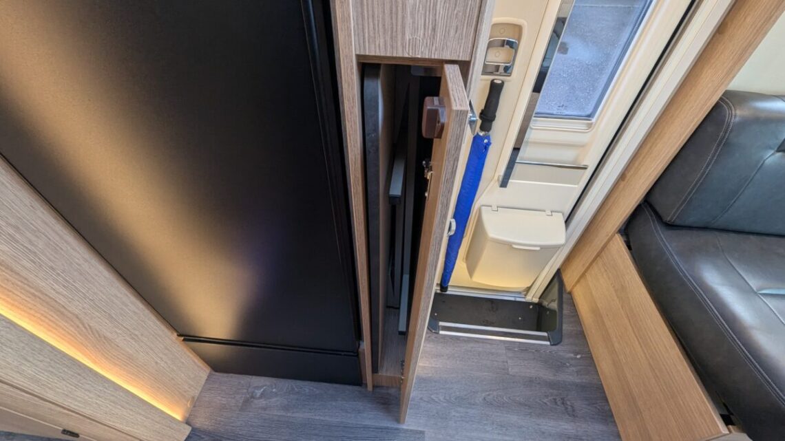 Moving forward, the motorhome features a central kitchen, equipped with a four‑ring hob, oven/grill, and a large 171‑litre fridge, giving it the practicality needed for extended touring. Opposite the kitchen sits the washroom and separate shower, forming a functional mid‑section that separates the living and sleeping spaces.