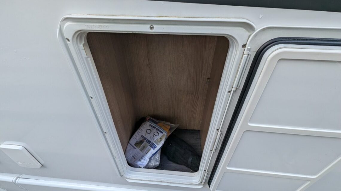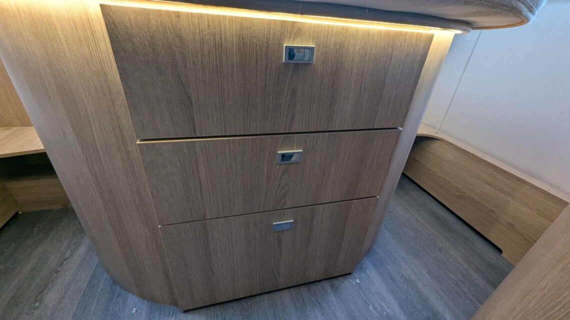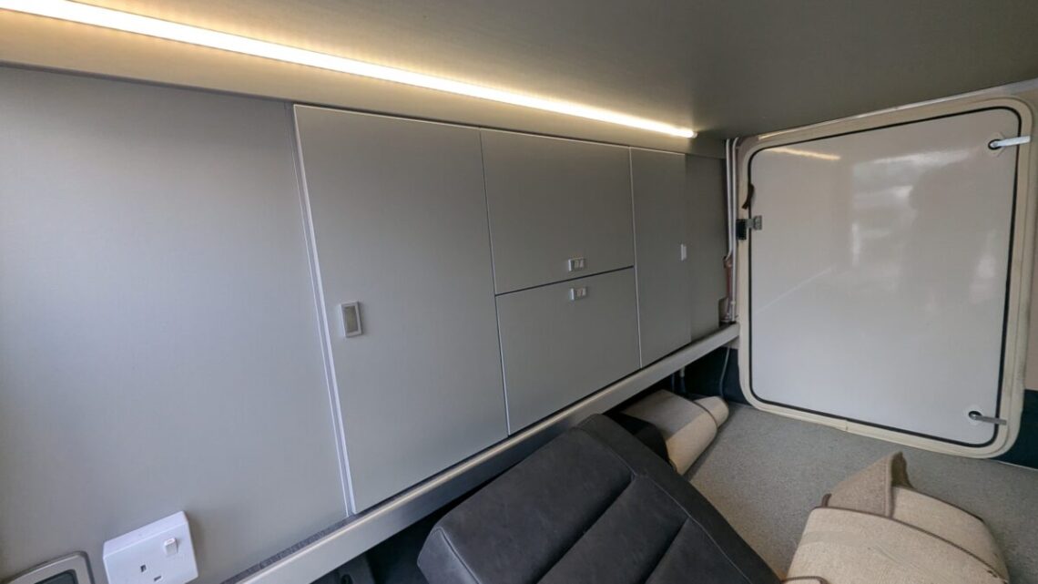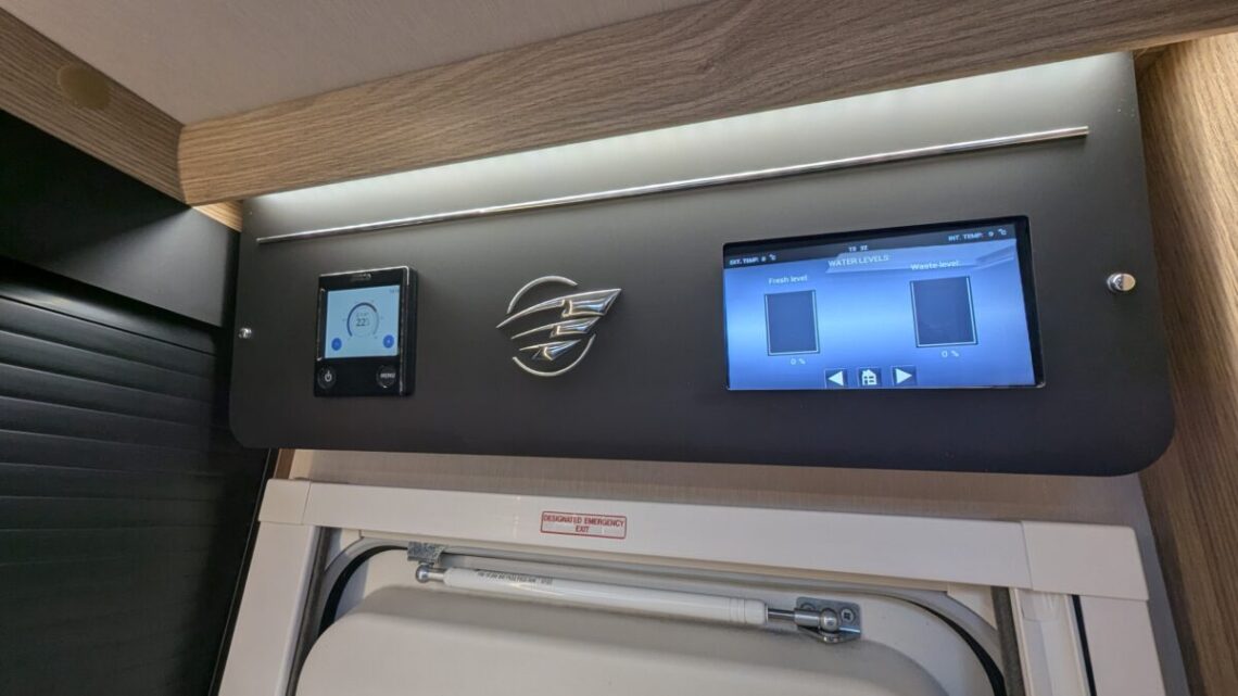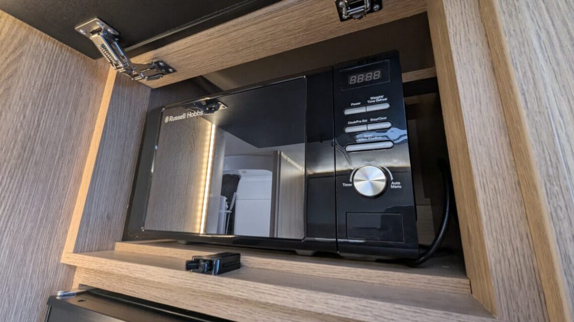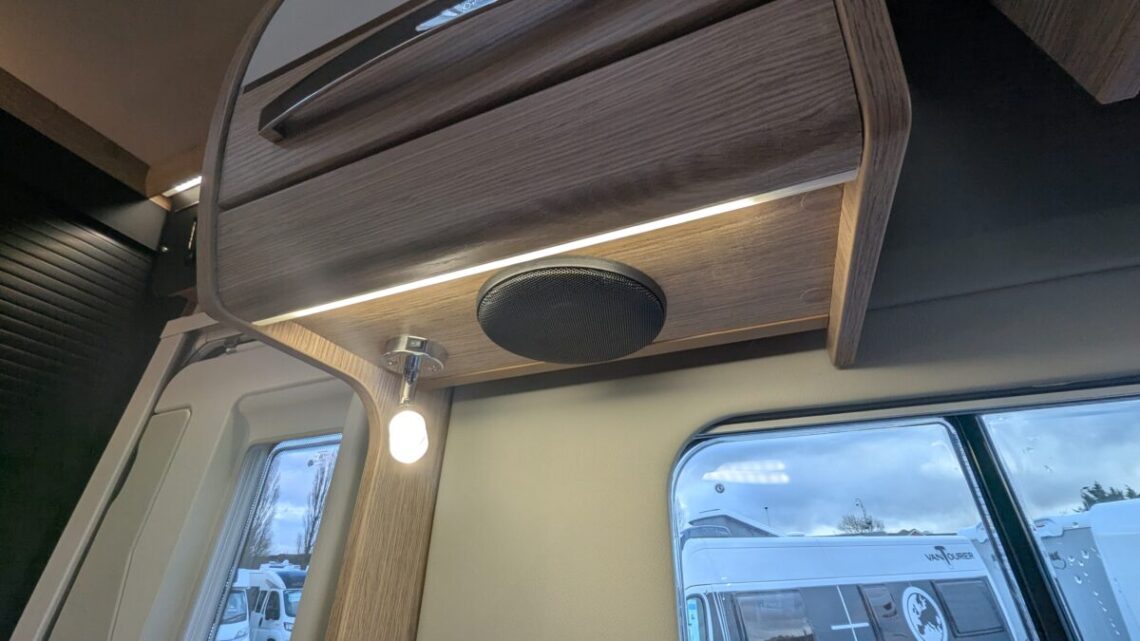Moving forward, the motorhome features a central kitchen, equipped with a four‑ring hob, oven/grill, and a large 171‑litre fridge, giving it the practicality needed for extended touring. Opposite the kitchen sits the washroom and separate shower, forming a functional mid‑section that separates the living and sleeping spaces.