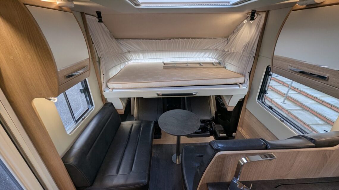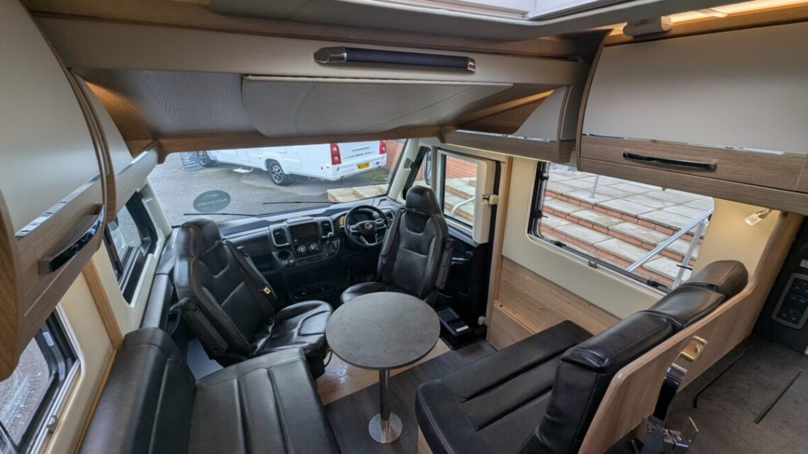 At the front, the GF80 HB provides a forward lounge, a signature of the Grande Frontier range. This lounge is positioned beneath a transverse drop‑down double bed, allowing the vehicle to sleep up to four people. The cab and lounge area benefit from the open feel created by the A‑Class panoramic windscreen, enhancing visibility and interior space.