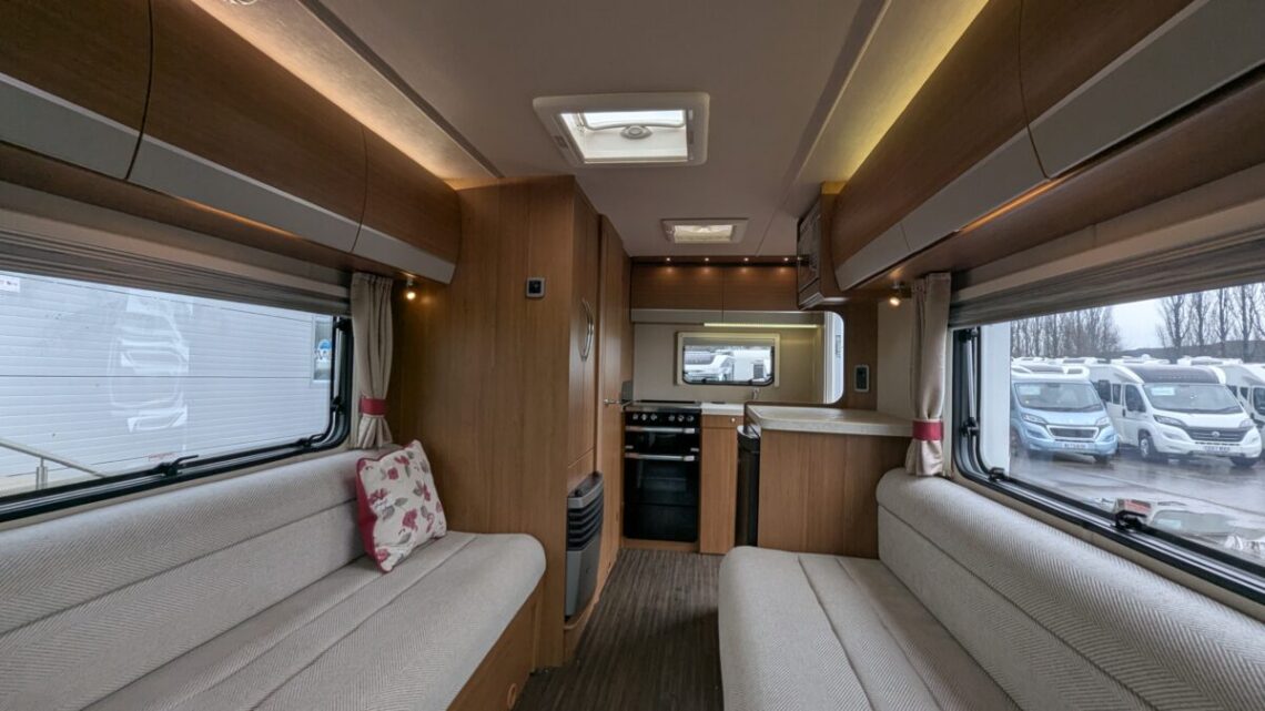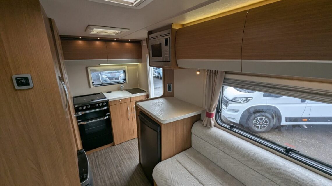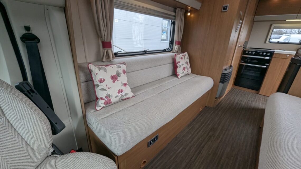 With just over 14,000 miles since new, this example is in great condition. This layout is very spacious, with long, comfortable bench seats either side of the motorhome as well as the large windows allowing lots of natural light in! These benches fold out in a matter of seconds to become a large double bed, using the cushions provided. The cab is fitted with a reversing camera, 6-speed manual, swivelling seats, cruise control and air conditioning, ensuring a relaxing journey anywhere you go. The kitchen is located at the rear, with an oven/grill, fridge/freezer and a microwave, as well as some overhead cupboards, giving you the freedom to cook, store and enjoy your food inside the comfort of the motorhome. On the exterior, the cab is a lovely grey colour, standing out from the rest. There is a solar panel and tv aerial on the roof, as well as an awning on the side of the vehicle.