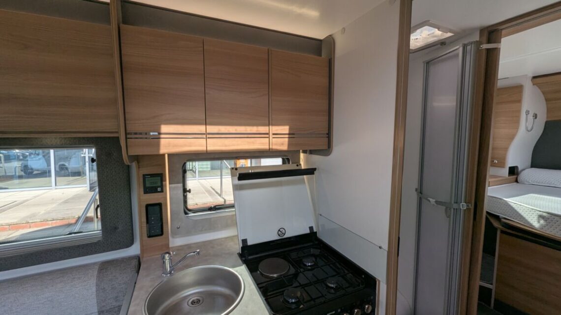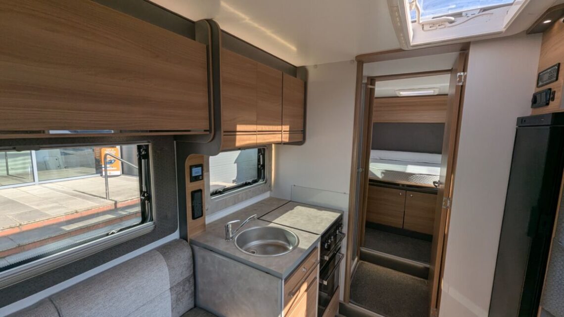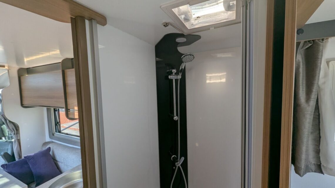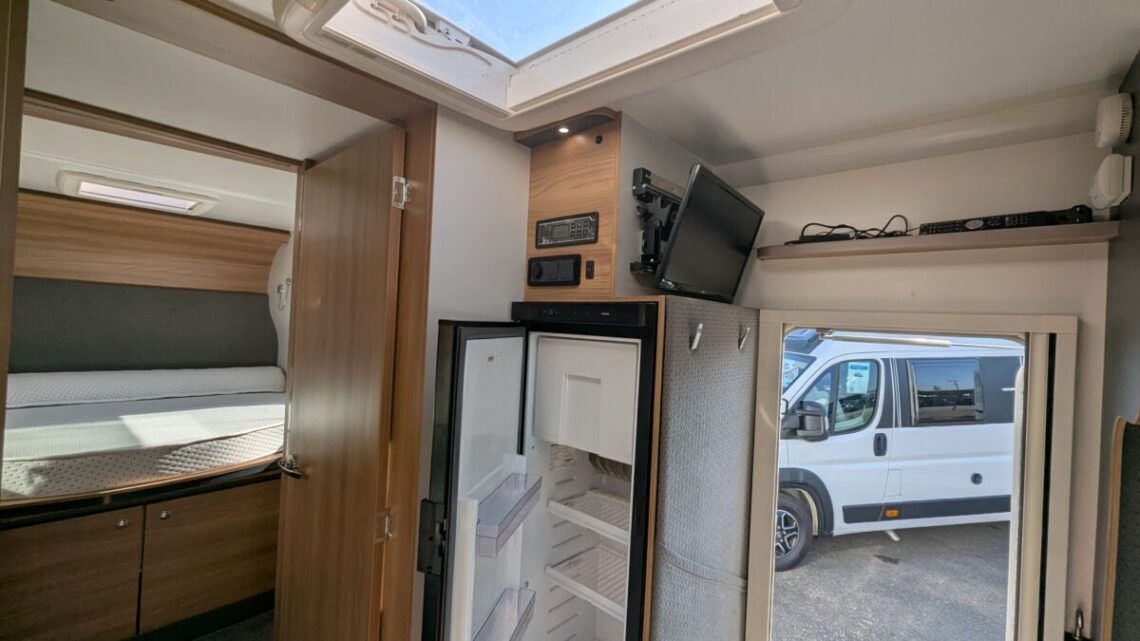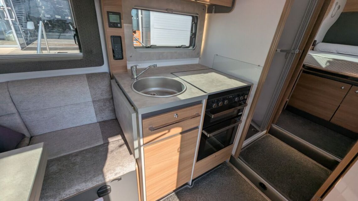 To the rear, the standout feature is the luxurious fixed island bed, offering true comfort with easy access from both sides and plenty of storage underneath – perfect for longer trips or extended touring. The central kitchen is fully equipped for life on the road, featuring an oven, grill, hob, and a large fridge freezer, making meal preparation simple and convenient. Opposite, the well-appointed washroom includes a separate shower, delivering all the comforts of home wherever you go.