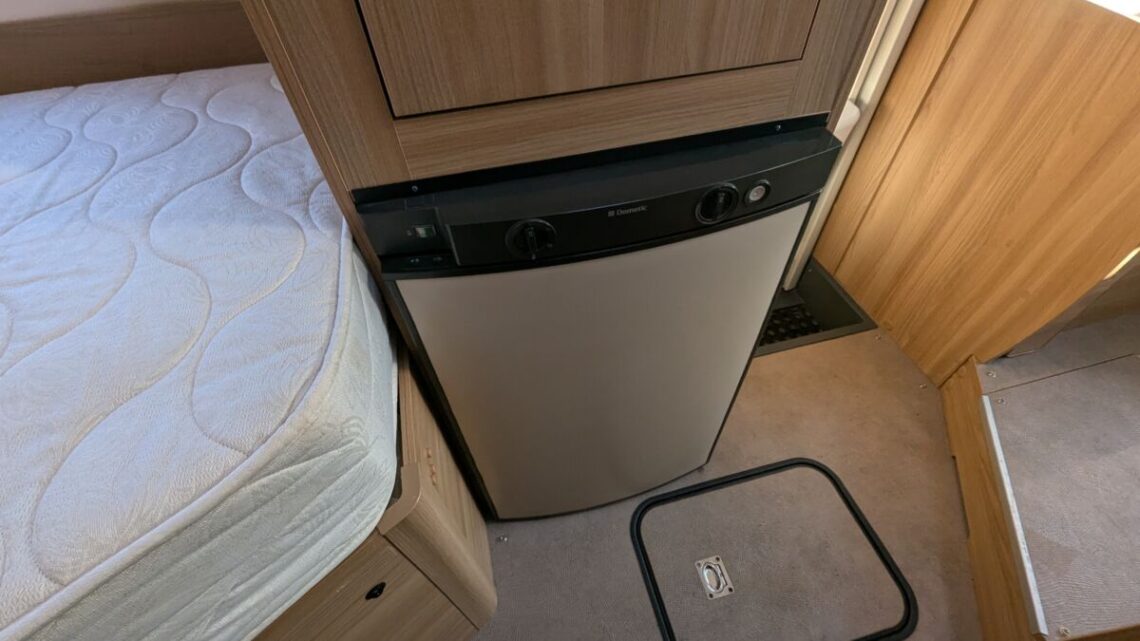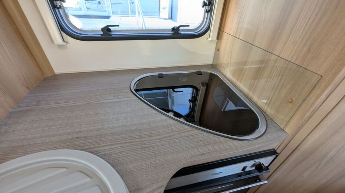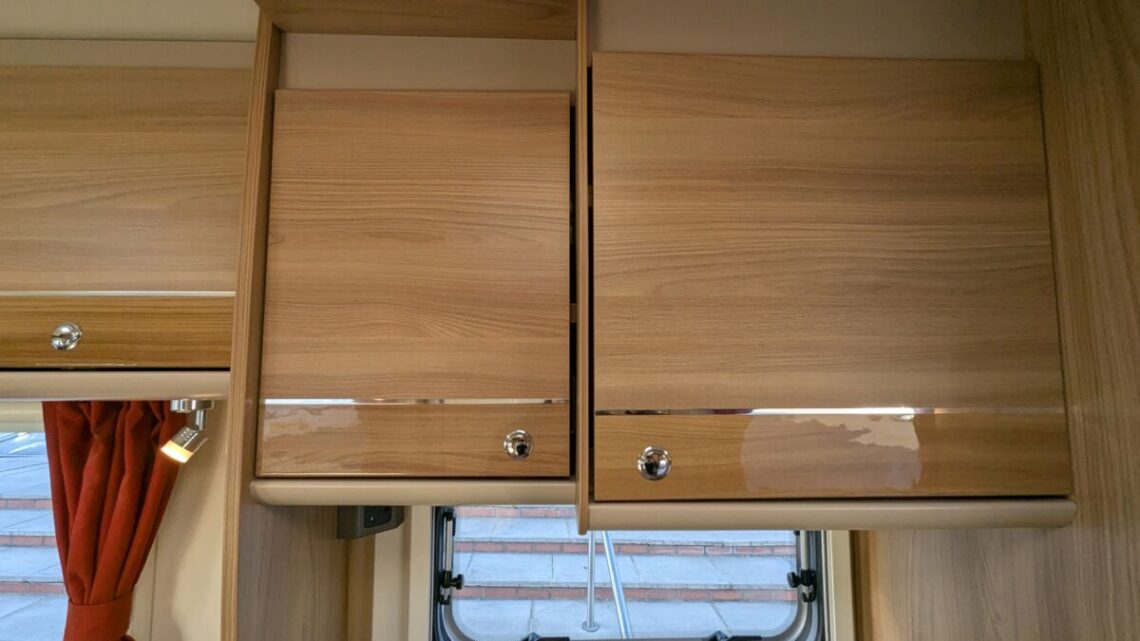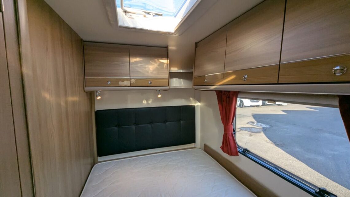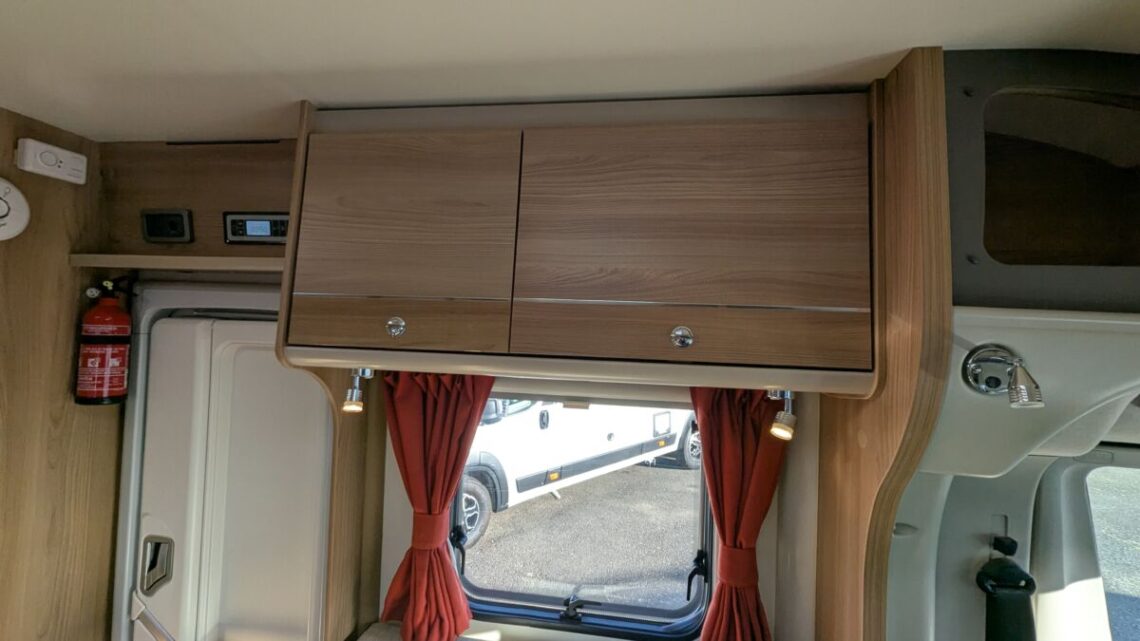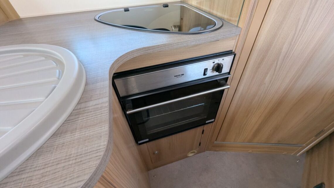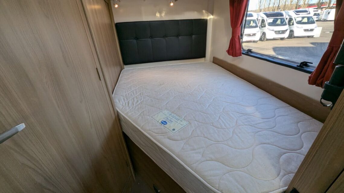 Towards the rear of the motorhome is the fixed French double bed, allowing you to keep the sleeping area made up at all times for convenience. The kitchen is well equipped with a gas hob, oven, grill and fridge with freezer compartment, along with ample storage space for food and cooking essentials, making it easy to prepare meals while on the road.