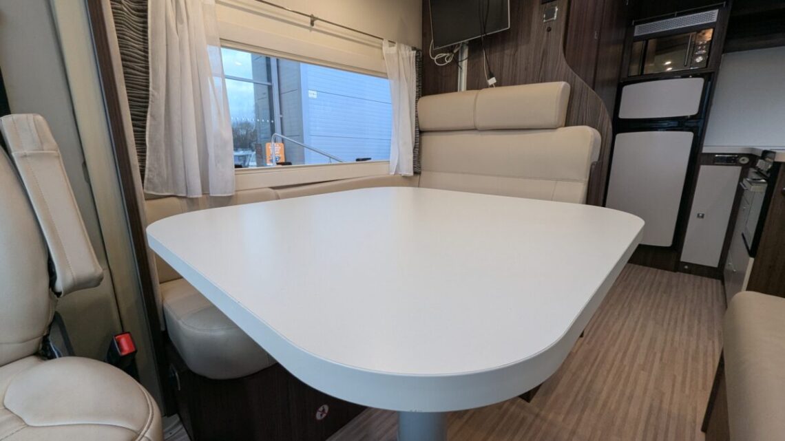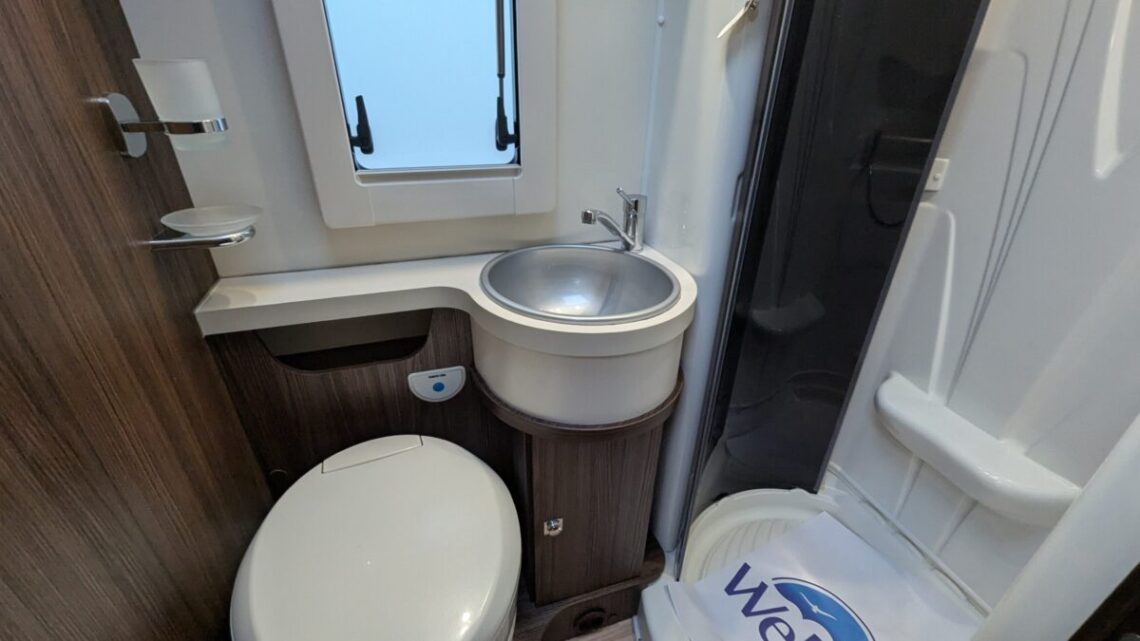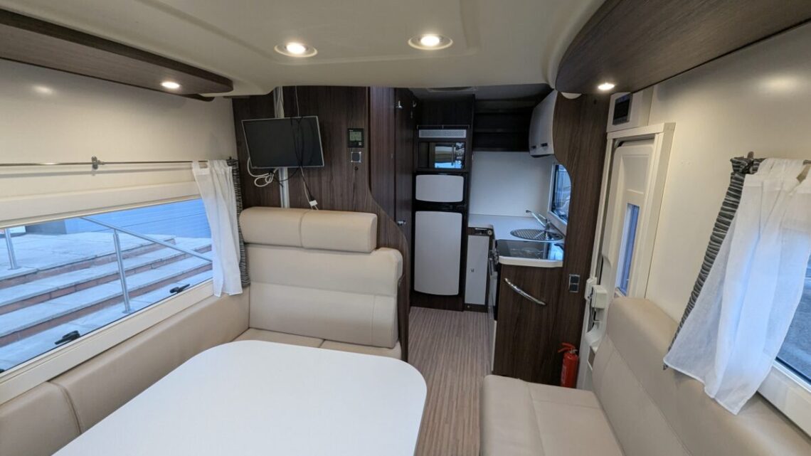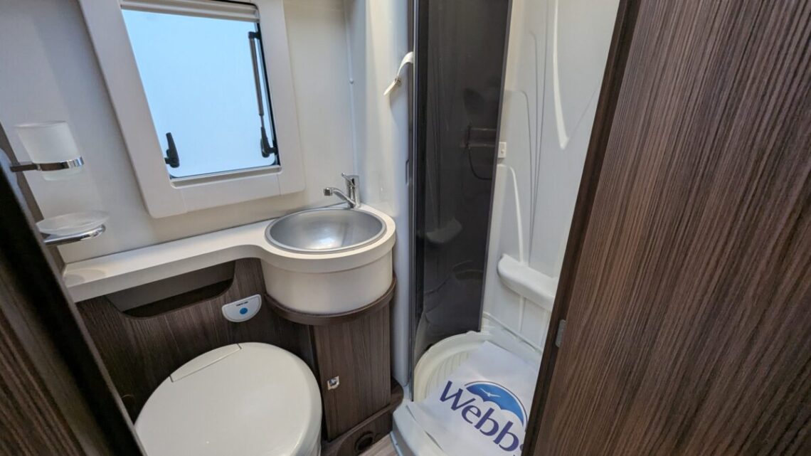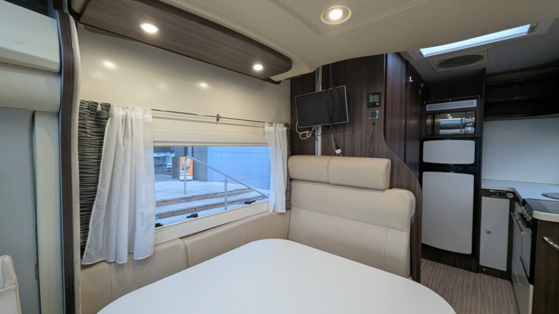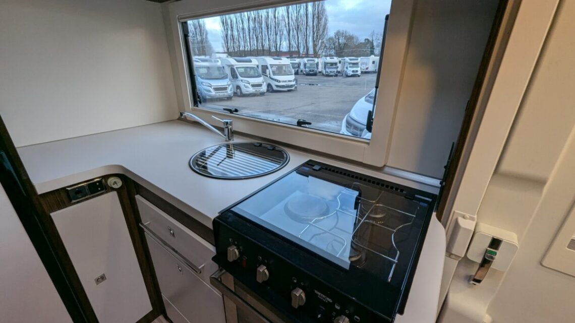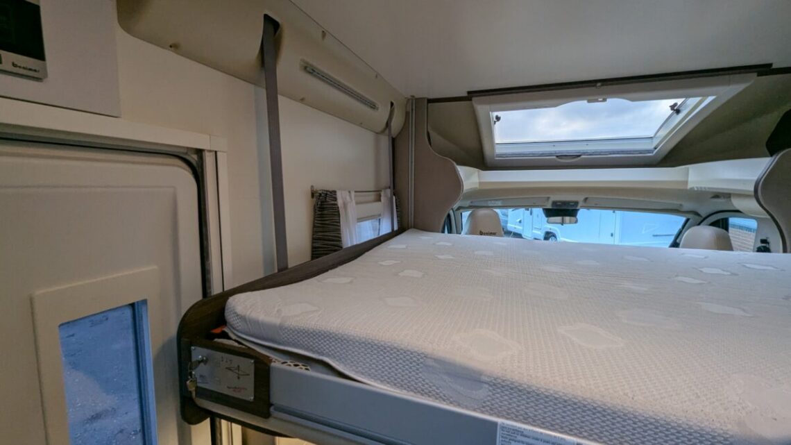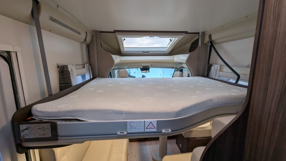 At the rear of the vehicle, you’ll find a well-appointed kitchen complete with generous worktop space, ample storage, and all the appliances you need to prepare meals on the go. When evening arrives, an electric drop-down double bed lowers effortlessly from above, offering a comfortable sleeping area without compromising daytime space. The lounge seating can also be converted into an additional double bed, making the Mileo 202 a highly flexible 4-berth option suitable for guests or families.