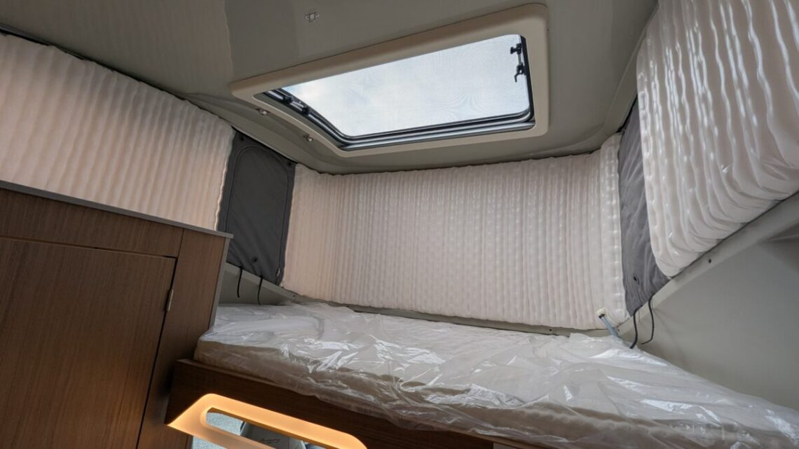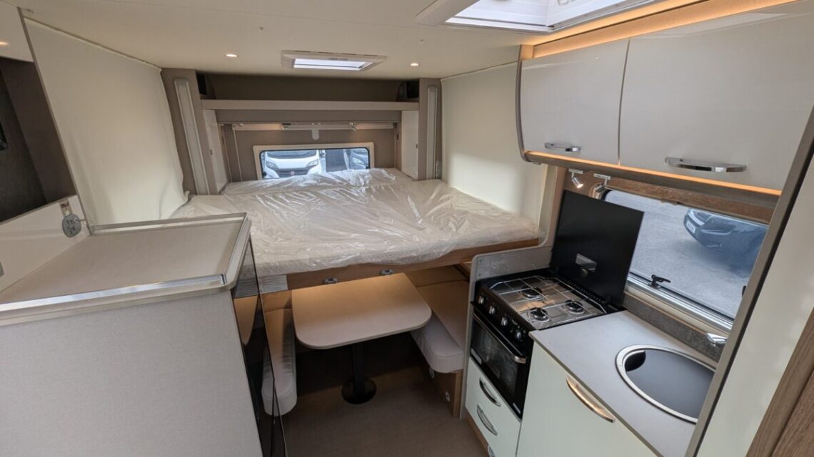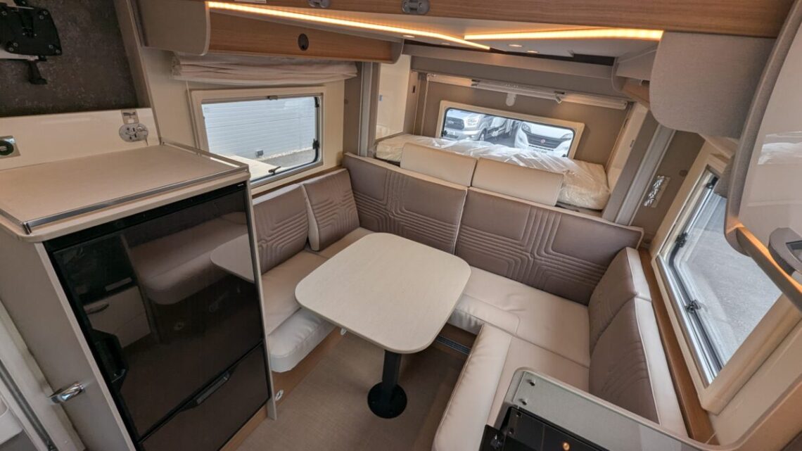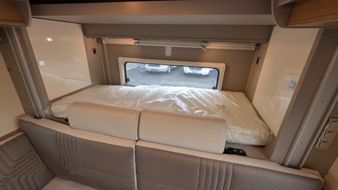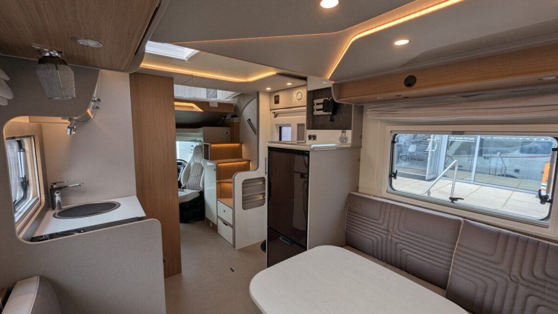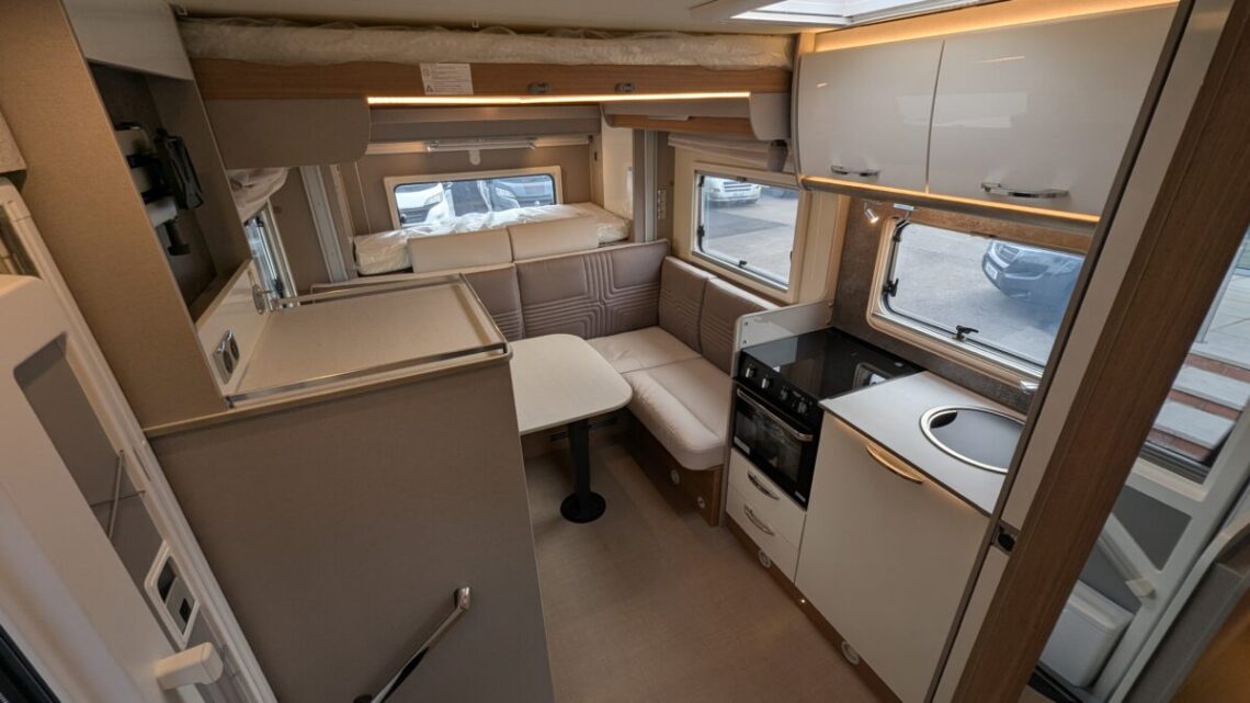 The Lyseo Gallery T649G is like stepping into a modern loft apartment that just happens to travel with you. Its most striking feature is the innovative inflatable “gallery” roof: when you park up, the roof rises in under two minutes, revealing a bright, full-height upstairs bedroom. This isn’t a cramped bunk—it’s a true second floor, with a staircase leading up to a spacious, light-filled retreat where you can stretch out, read, or gaze at the stars through the skylight.