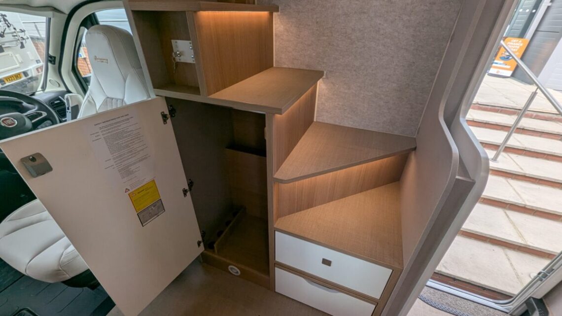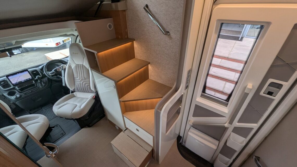 What really sets the T649G apart is how it blends innovation with comfort. The insulated floor keeps things cosy underfoot, and there’s storage everywhere you look—including hidden compartments in the stairs to the upper level. The whole interior feels contemporary and welcoming, with stylish finishes and a sense of space that belies its compact footprint.