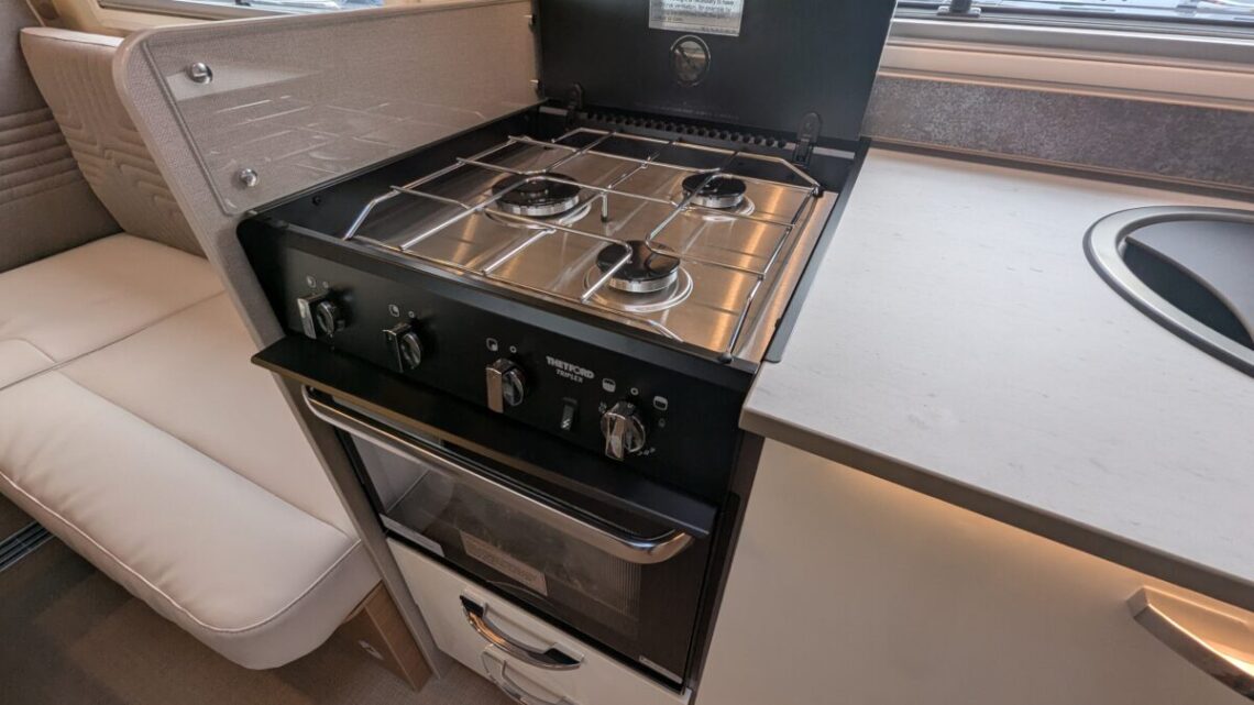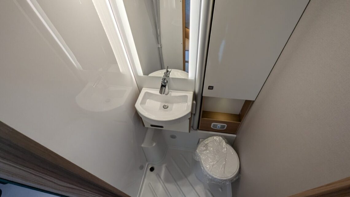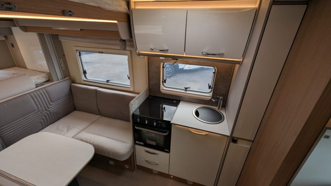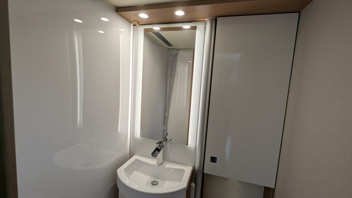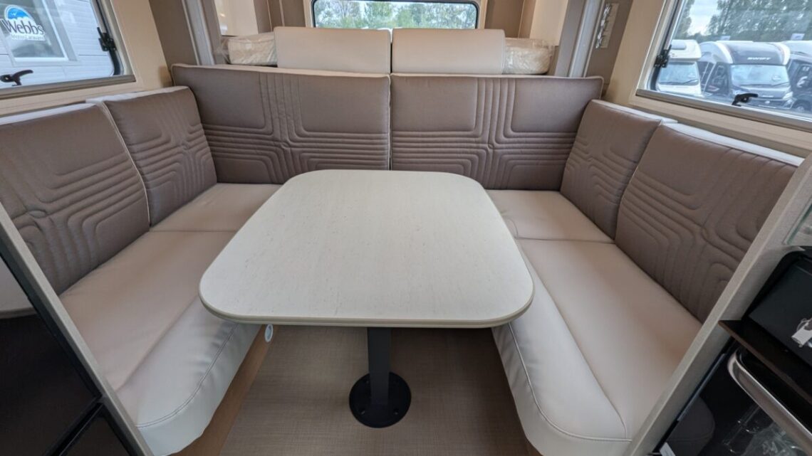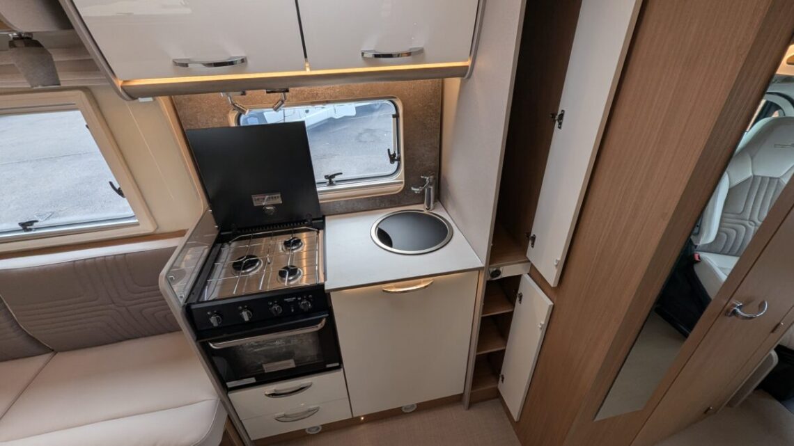 The kitchen is cleverly designed for real cooking, with plenty of storage and worktop space, so you can enjoy proper meals on the road. The bathroom is thoughtfully laid out, with a separate shower and quality fixtures, making it easy to freshen up after a day of exploring.
