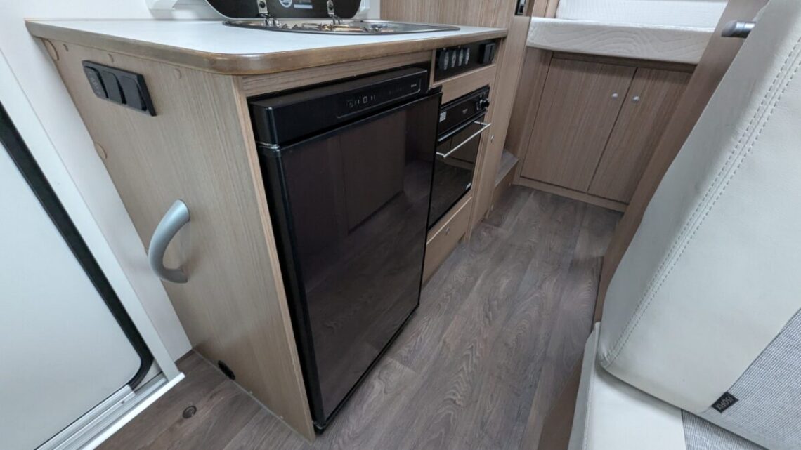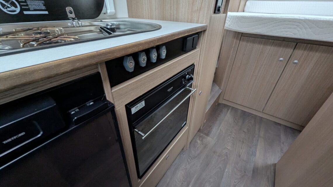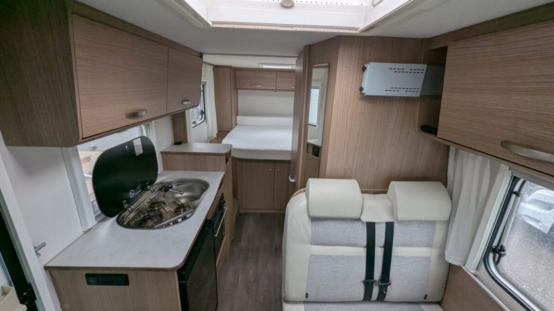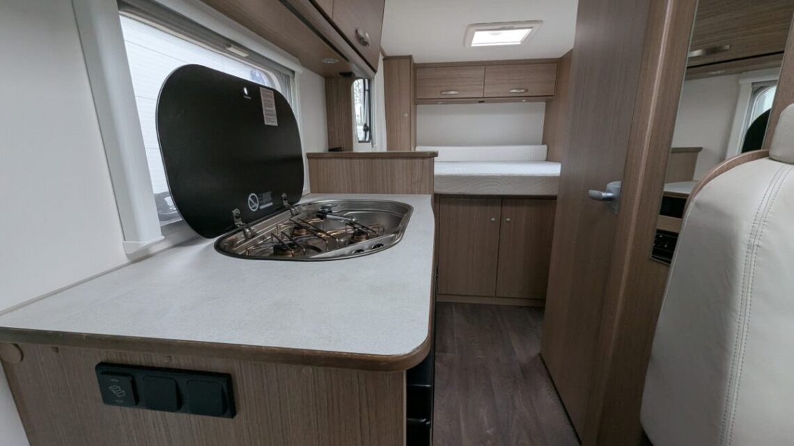 The front lounge is bright and welcoming, with the driver and passenger seats able to swivel to create a sociable dining or relaxation area. The well-equipped kitchen comes with a hob, oven/grill, fridge/freezer, and plenty of storage space, giving you everything you need to prepare proper meals on the road.  At the rear, the Carado V339 features a fixed island bed that can be accessed from both sides a rare luxury in a motorhome of this size.