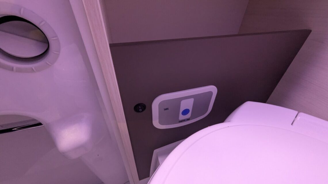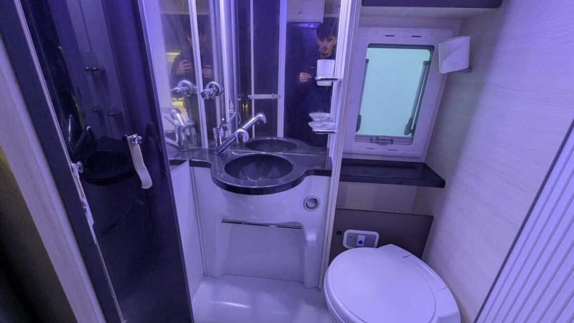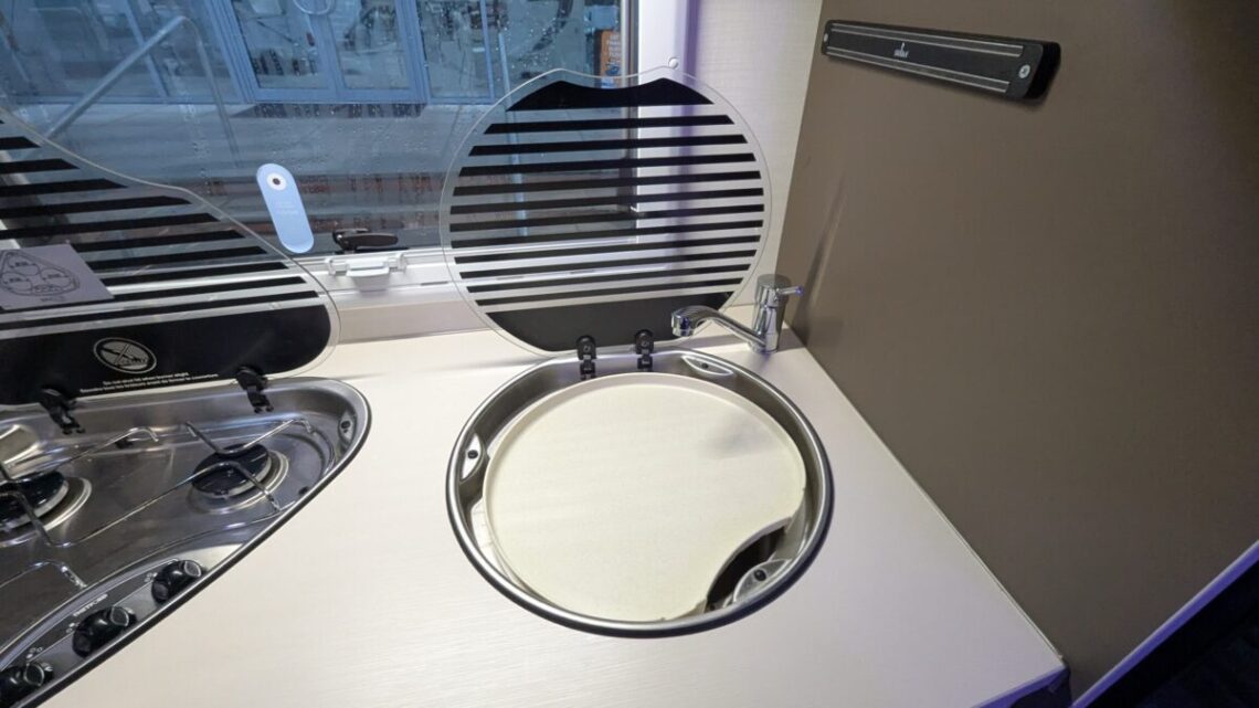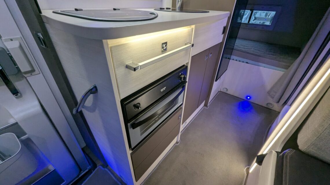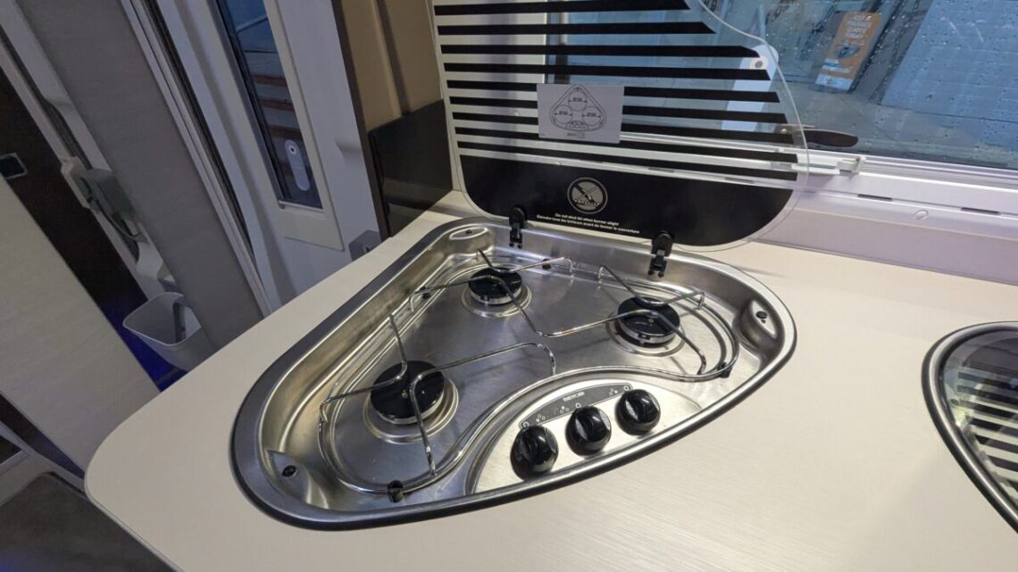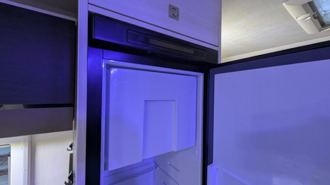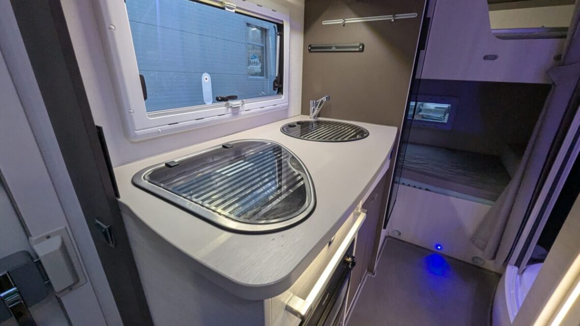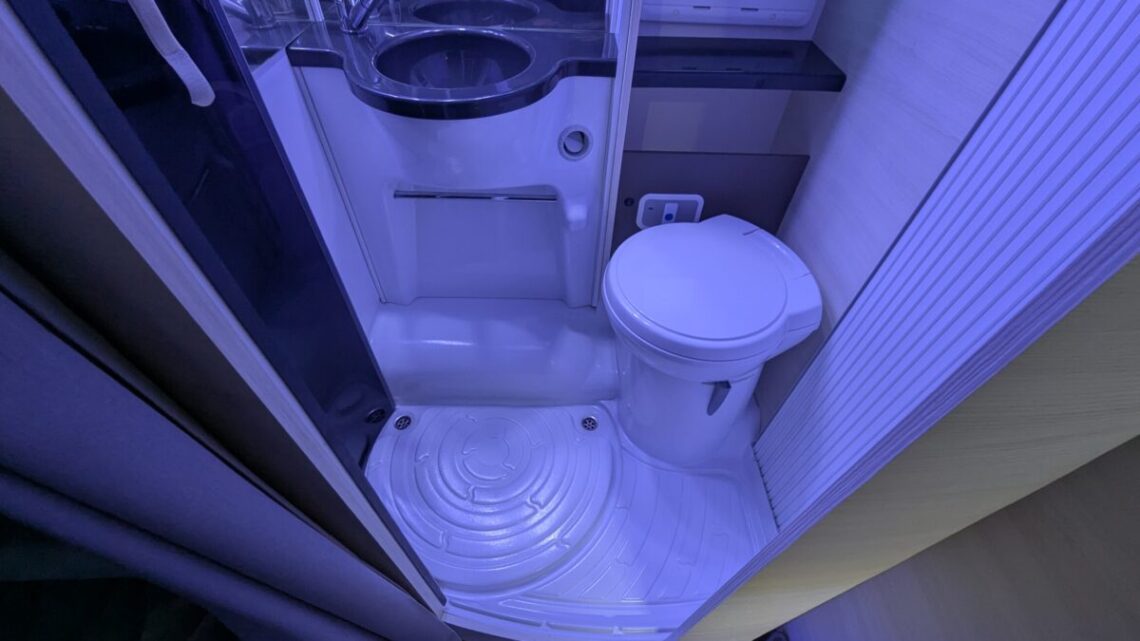The well-equipped kitchen provides everything needed for enjoyable meals on the road, including a three-burner hob, a good-sized fridge/freezer, and ample storage and worktop space. Opposite, the washroom features a practical layout with a toilet, washbasin, and separate shower area, making longer trips comfortable and convenient.