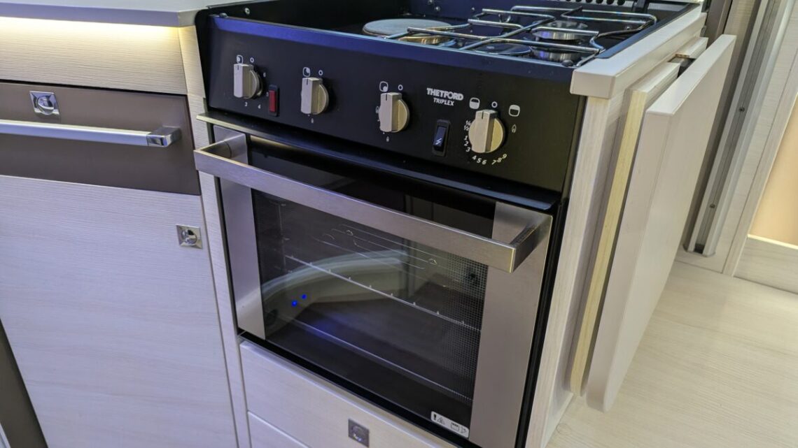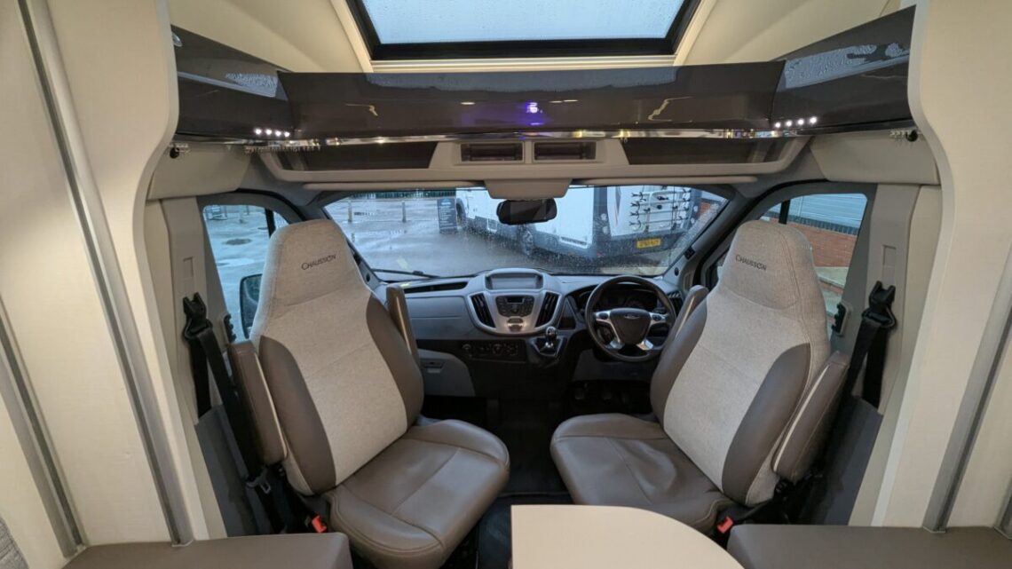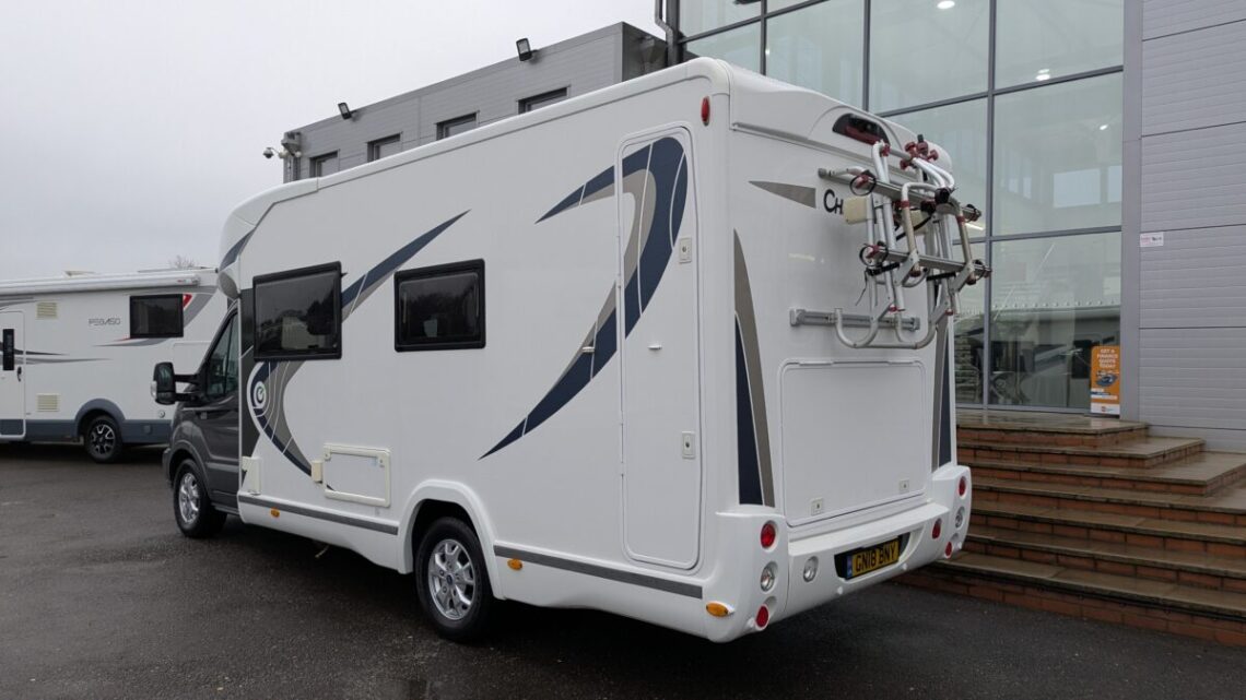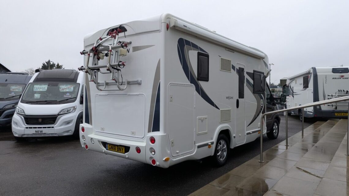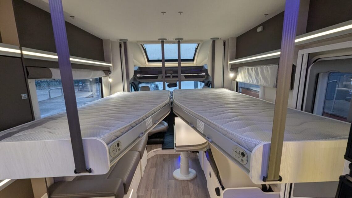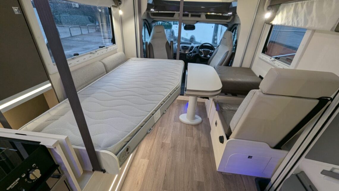 This motorhome comes with the electric drop-down single beds, which can be controlled separately, allowing for room on one side if needed. The cab is very spacious, with a rooflight above, 6-speed manual gearbox, cruise control, air con and swivelling captain’s seats. Behind the cab there is a dinette/lounge area, with high quality material, adding to the comfort of this modern-styled motorhome. The table folds down and in half, so can be tailored to your needs. Towards the rear of the motorhome, there is a kitchenette, fitted with an oven/grill, fridge/freezer and a sink. Located above the habitation door, is the thermostat for the powerful, yet efficient, diesel heating. The large washroom spans the rear of the motorhome, with storage cupboards, a shower and a toilet. Underneath there is a large garage area, which can be accessed from both sides and the rear of the motorhome, so you don’t have to worry about where you park! On the exterior, this examples comes with the lovely grey cab, as well as alloy wheels, a reversing camera and a tv aerial, with an external BBQ point to make your summers more simple and more enjoyable. The awning and bike rack are fantastic extras to have and make a big difference to your motorhoming experience.