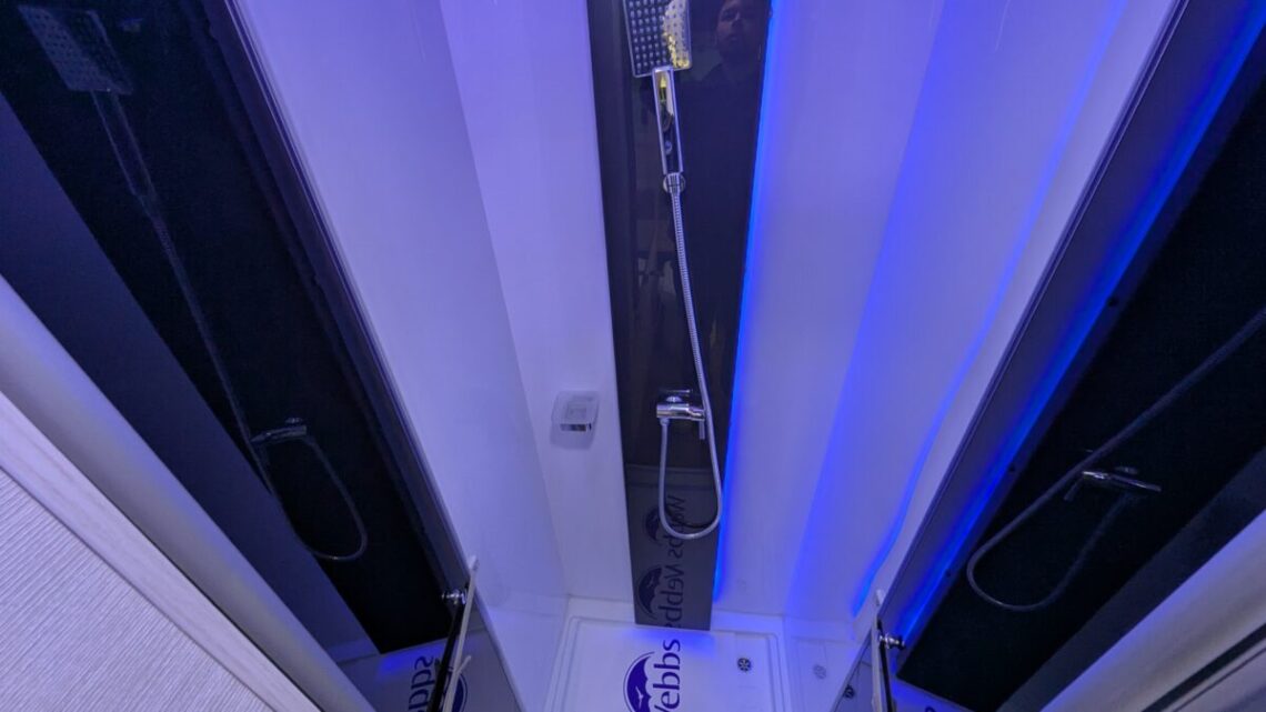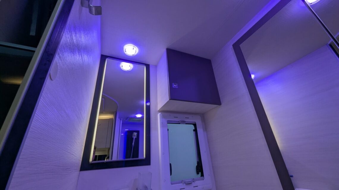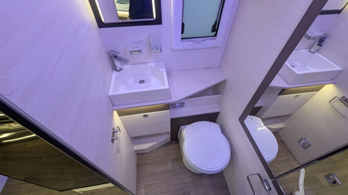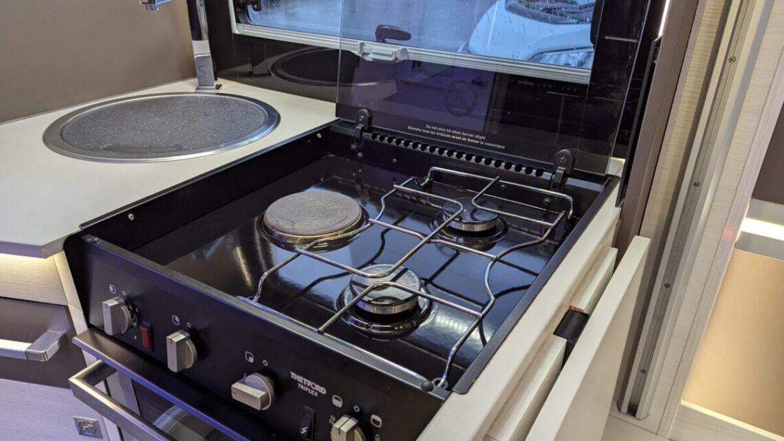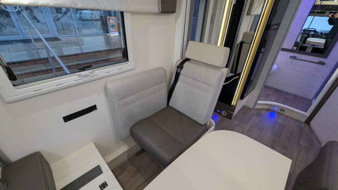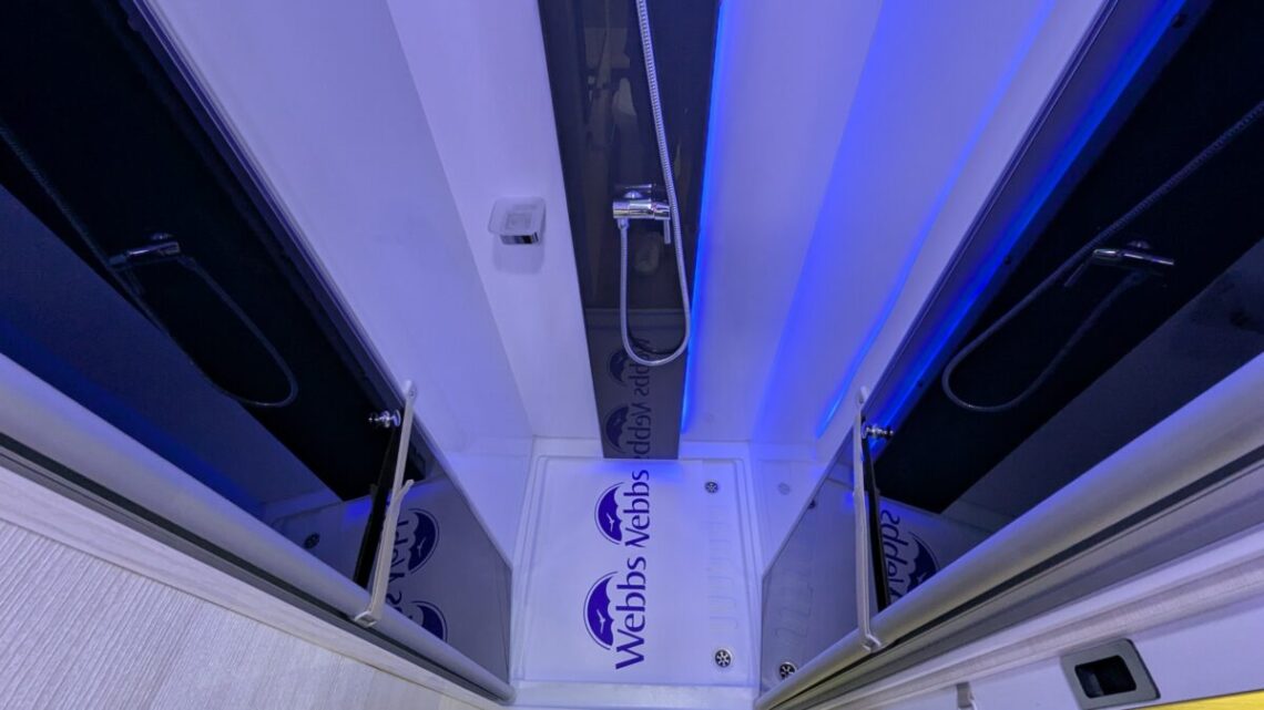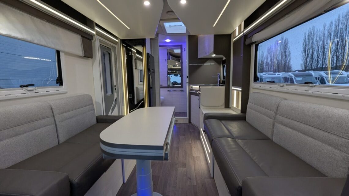 This motorhome comes with the electric drop-down single beds, which can be controlled separately, allowing for room on one side if needed. The cab is very spacious, with a rooflight above, 6-speed manual gearbox, cruise control, air con and swivelling captain’s seats. Behind the cab there is a dinette/lounge area, with high quality material, adding to the comfort of this modern-styled motorhome. The table folds down and in half, so can be tailored to your needs. Towards the rear of the motorhome, there is a kitchenette, fitted with an oven/grill, fridge/freezer and a sink. Located above the habitation door, is the thermostat for the powerful, yet efficient, diesel heating. The large washroom spans the rear of the motorhome, with storage cupboards, a shower and a toilet. Underneath there is a large garage area, which can be accessed from both sides and the rear of the motorhome, so you don’t have to worry about where you park! On the exterior, this examples comes with the lovely grey cab, as well as alloy wheels, a reversing camera and a tv aerial, with an external BBQ point to make your summers more simple and more enjoyable. The awning and bike rack are fantastic extras to have and make a big difference to your motorhoming experience.