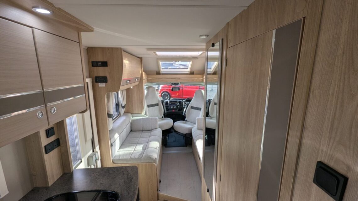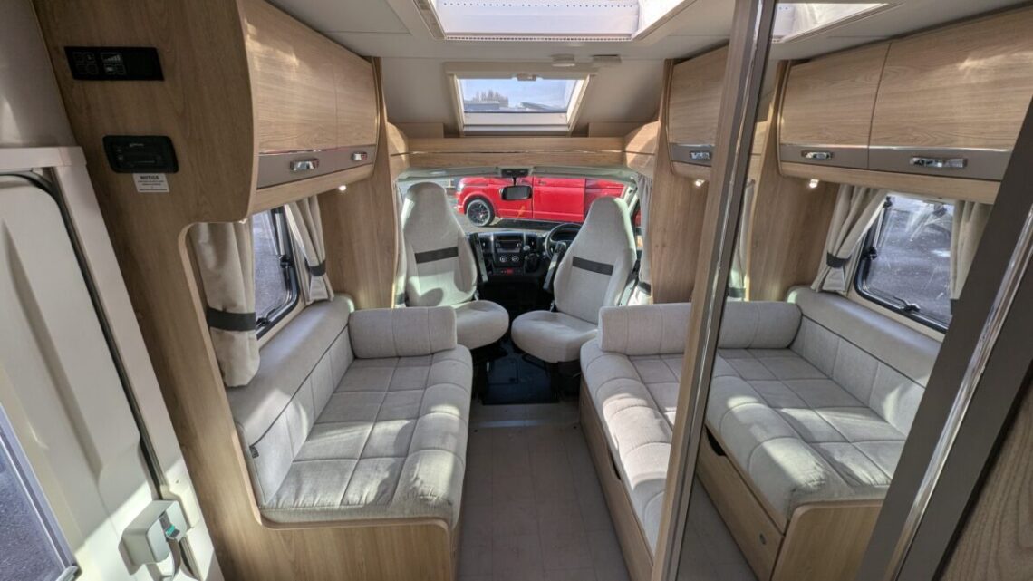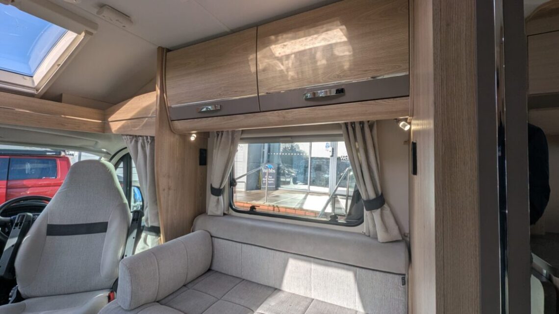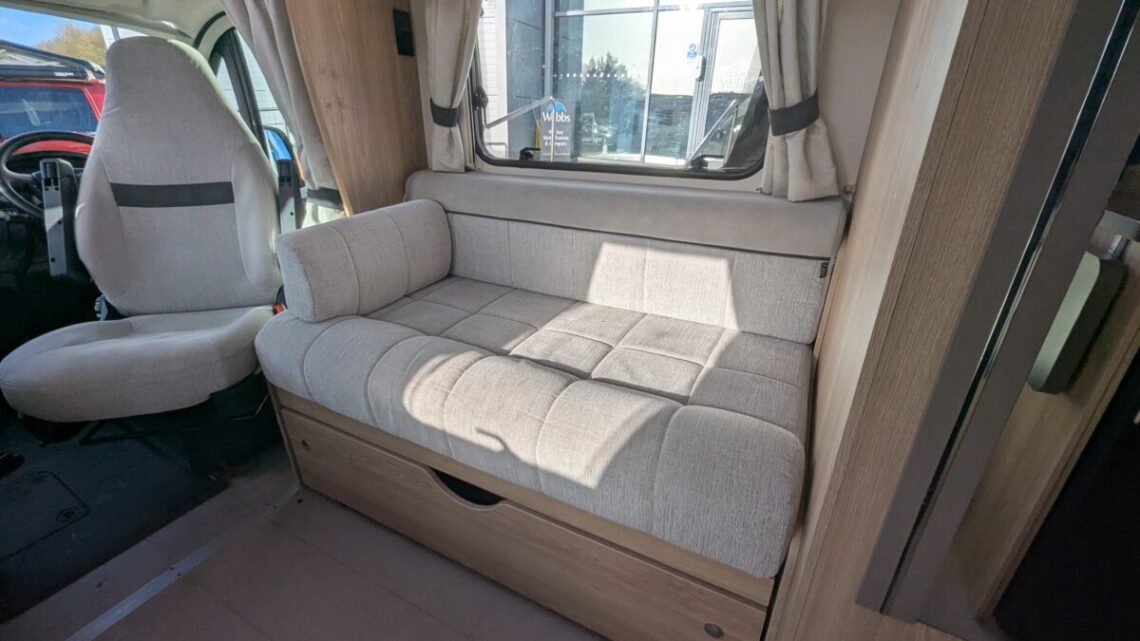 This Stunning example from Elddis features many useful extras such as, reversing camera, awning, cruise control and air-conditioning all to make those fun adventures even more enjoyable! Built on the reliable Peugeot Boxer chassis with a 2.2L 140 bhp engine and engineered for smooth driving. Step inside to discover a smart interior layout designed with real touring life in mind. At the rear you’ll find a raised sleeping area that can be arranged as two comfortable singles or a luxurious double bed, with a large garage/storage space conveniently accessed from the outside — ideal for bikes, luggage or outdoor gear. Up front, the lounge seating with fold-away travel seats easily converts into a further double sleeping area if needed, giving flexible accommodation for up to four travellers.