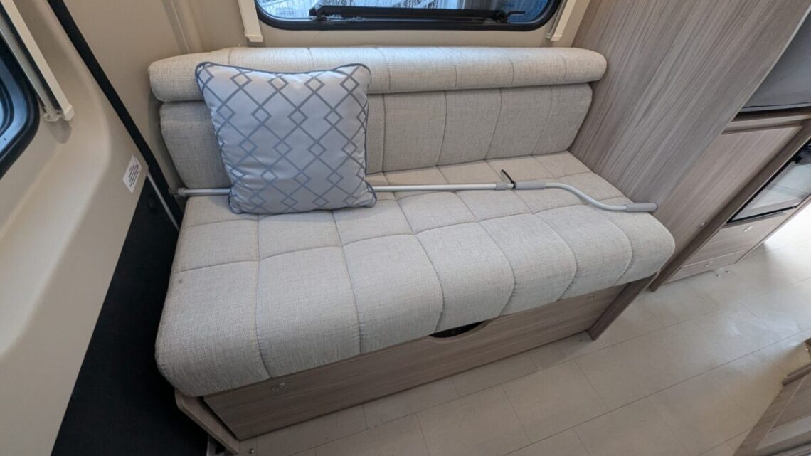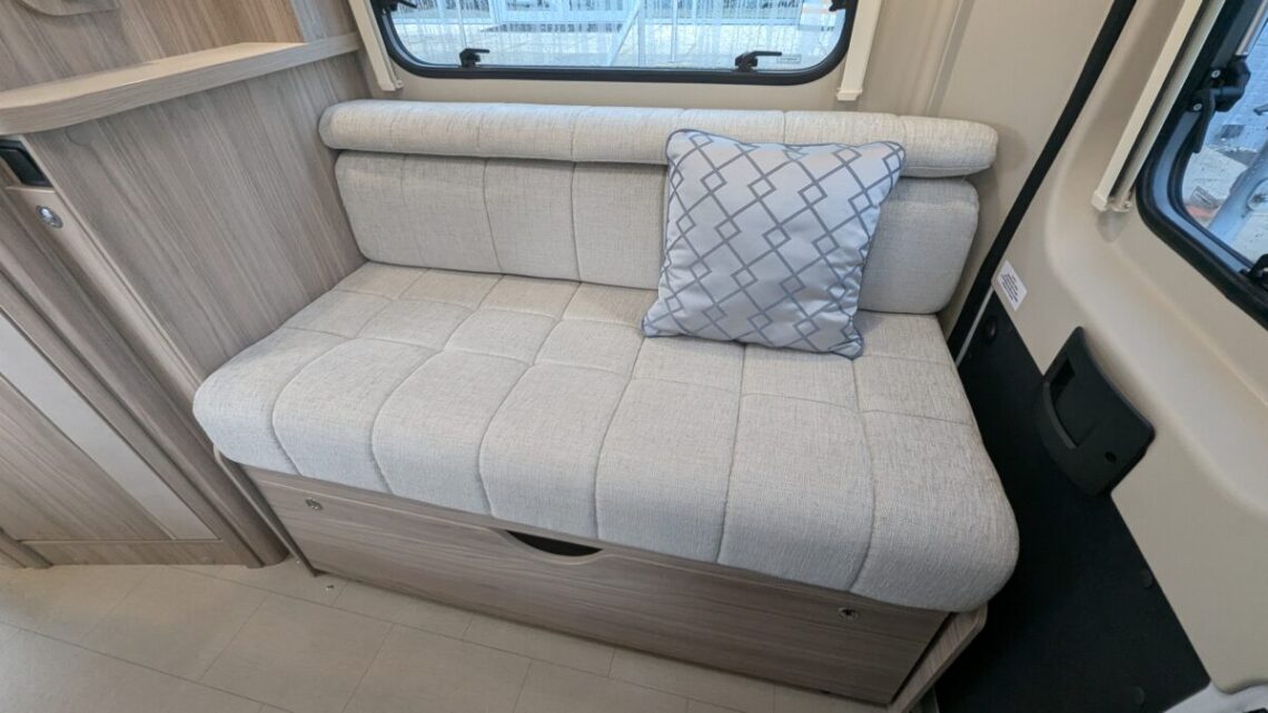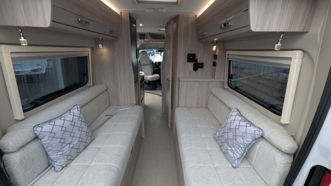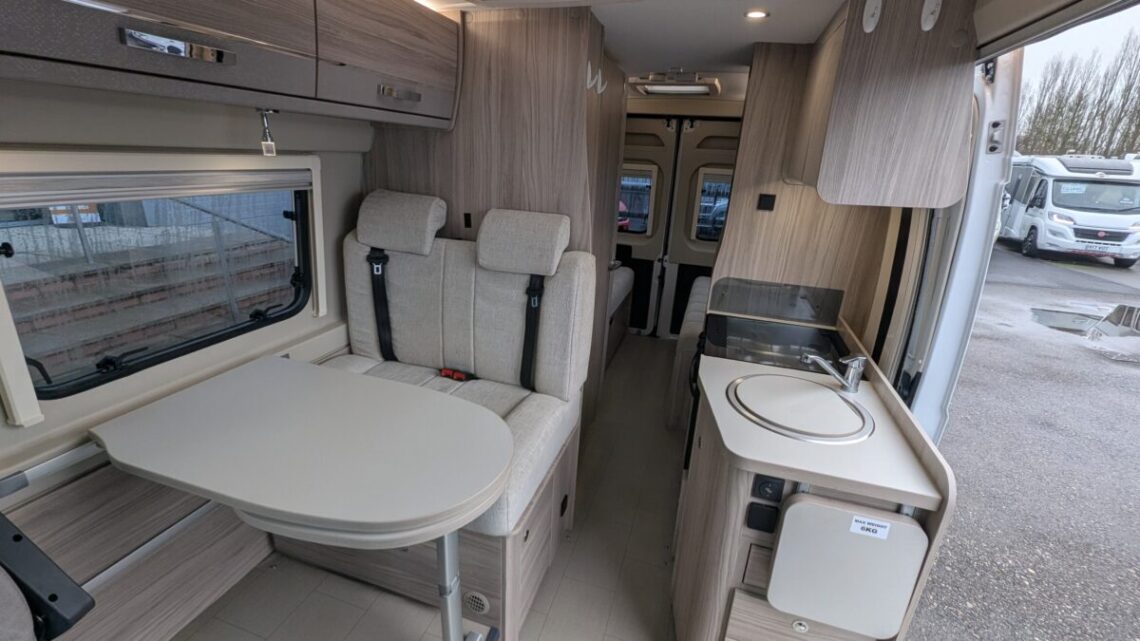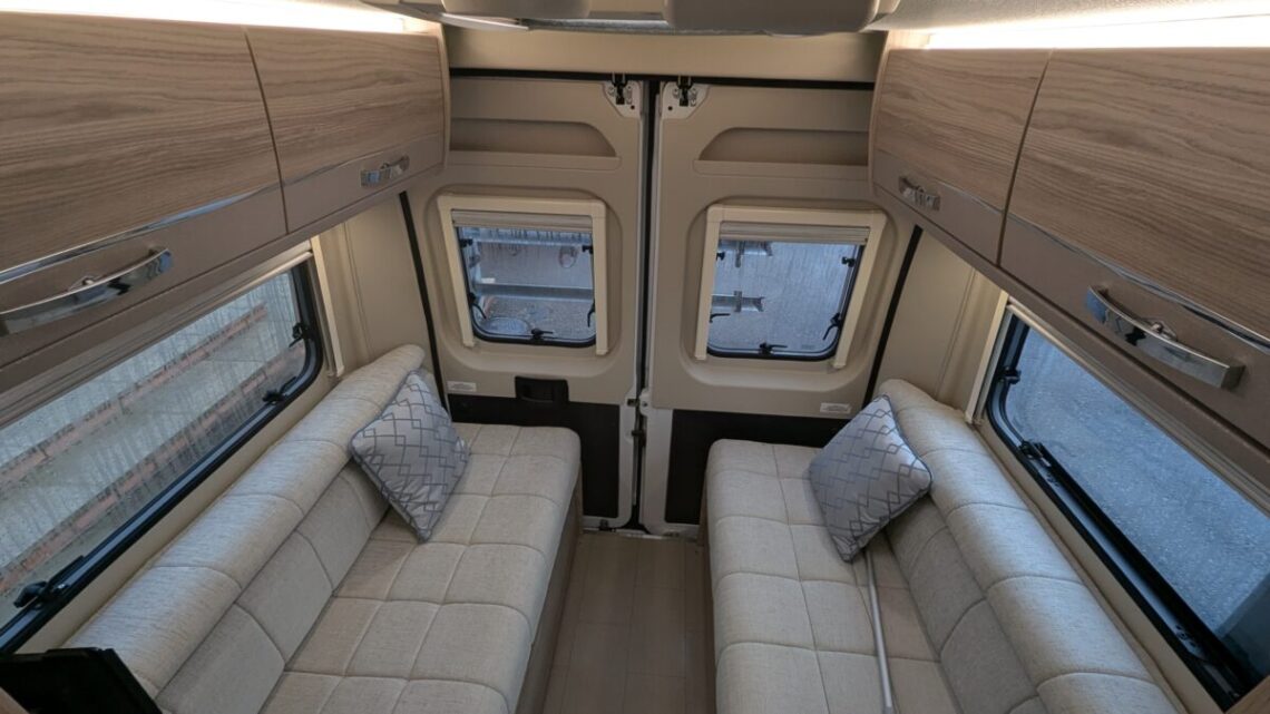 The Elddis Autoquest CV40 has a simple, flexible layout built around a rear lounge, central kitchen and washroom, and a front dinette. At the back, two long side sofas form a spacious lounge that easily converts into a large double bed. In the middle of the van, the kitchen sits on the nearside and includes essentials like a hob, oven/grill, sink, and a fridge/freezer, with the washroom opposite, featuring a compact wet-room setup with a toilet, shower, and basin. At the front, a small dinette with belted travel seats pairs with the swivelling cab seats to create a second seating area, which can be turned into a single guest bed, giving the CV40 its 3‑berth capability. Overall, it’s a compact van that makes clever use of space, offering a comfortable rear living area, practical mid‑section facilities, and an additional front seating and sleeping option.