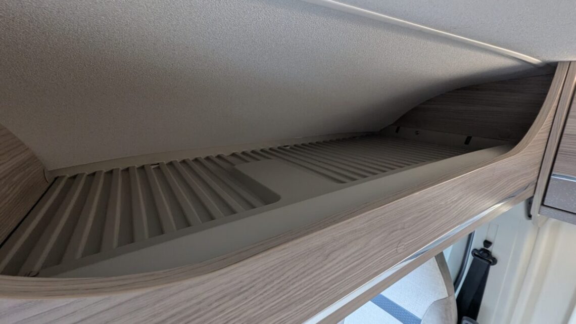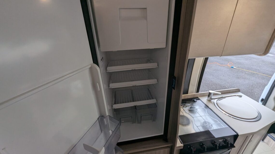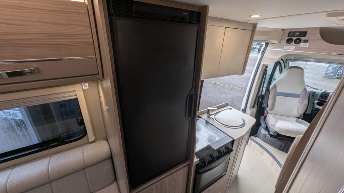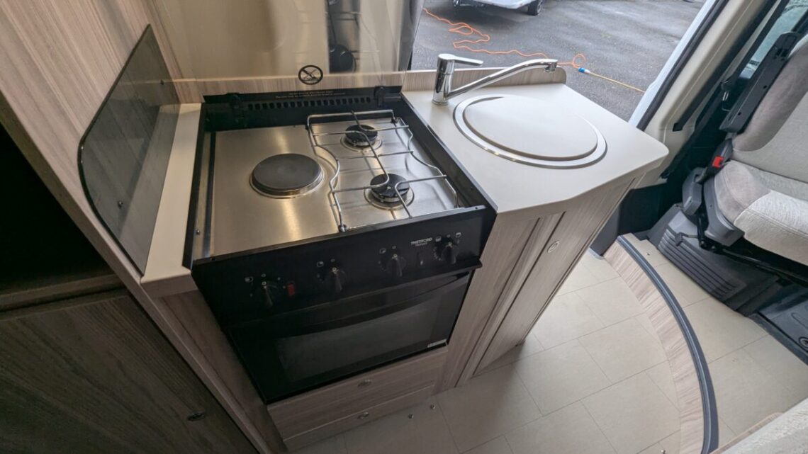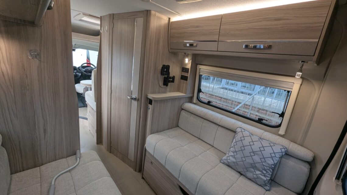 The Elddis Autoquest CV40 has a simple, flexible layout built around a rear lounge, central kitchen and washroom, and a front dinette. At the back, two long side sofas form a spacious lounge that easily converts into a large double bed. In the middle of the van, the kitchen sits on the nearside and includes essentials like a hob, oven/grill, sink, and a fridge/freezer, with the washroom opposite, featuring a compact wet-room setup with a toilet, shower, and basin. At the front, a small dinette with belted travel seats pairs with the swivelling cab seats to create a second seating area, which can be turned into a single guest bed, giving the CV40 its 3‑berth capability. Overall, it’s a compact van that makes clever use of space, offering a comfortable rear living area, practical mid‑section facilities, and an additional front seating and sleeping option.