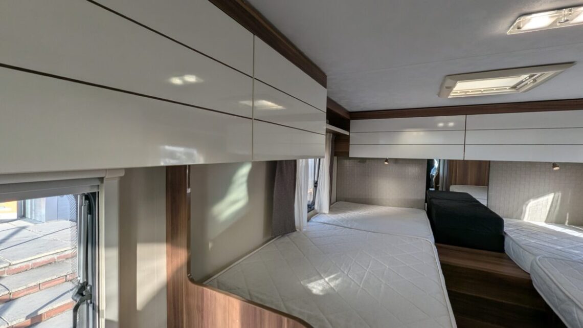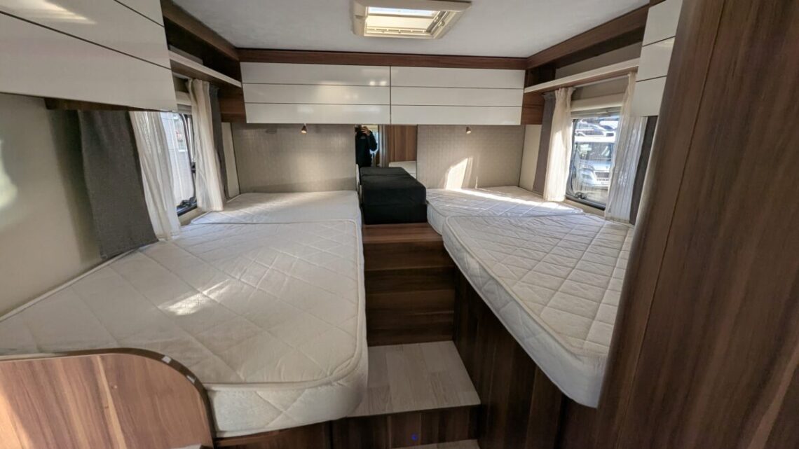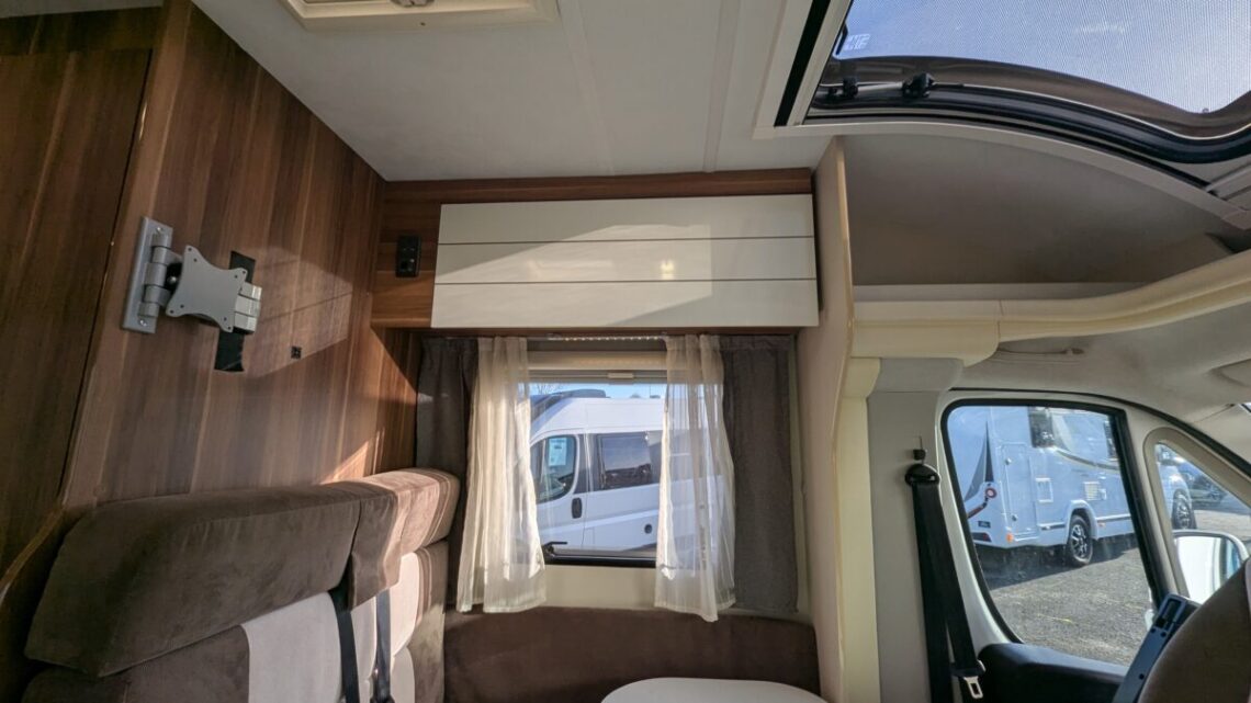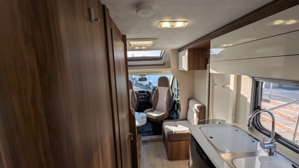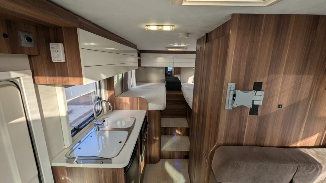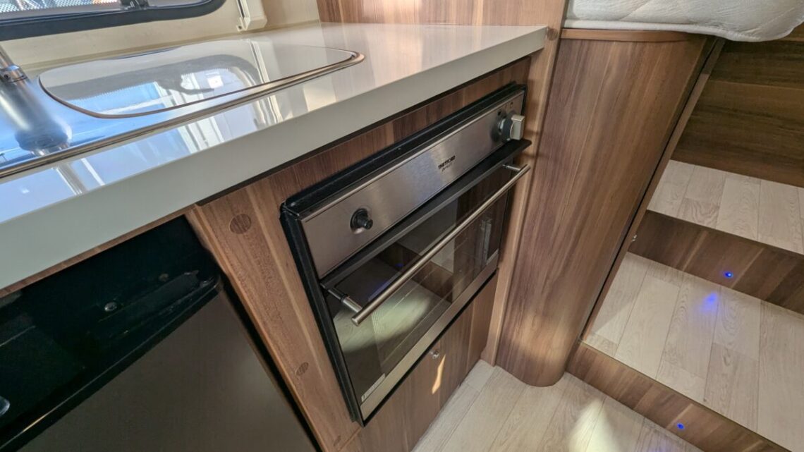 Inside, the layout is spacious and thoughtfully arranged. The standout feature is the rear twin single beds, providing comfortable sleeping without the need for daily bed conversion. Beneath the beds is a large rear garage, perfect for storing bikes, outdoor equipment or additional luggage, making this motorhome especially appealing for active travellers. The living and dining area is bright and welcoming, with plenty of seating and natural light from large skylight windows. The kitchen is fully equipped to handle life on the road, featuring a hob, oven/grill, fridge and ample storage, allowing you to prepare meals with ease. Whether you’re cooking a quick breakfast or a full evening meal, everything you need is close at hand.