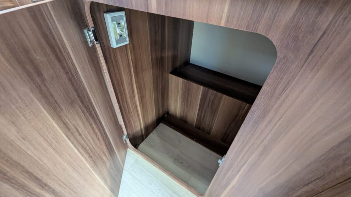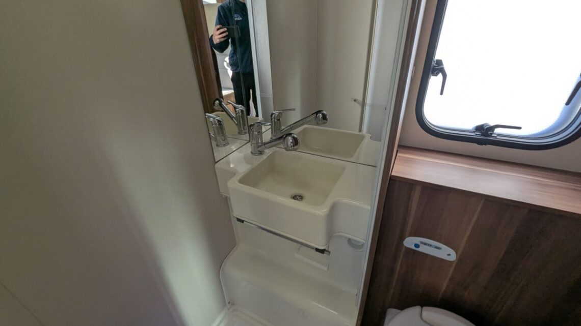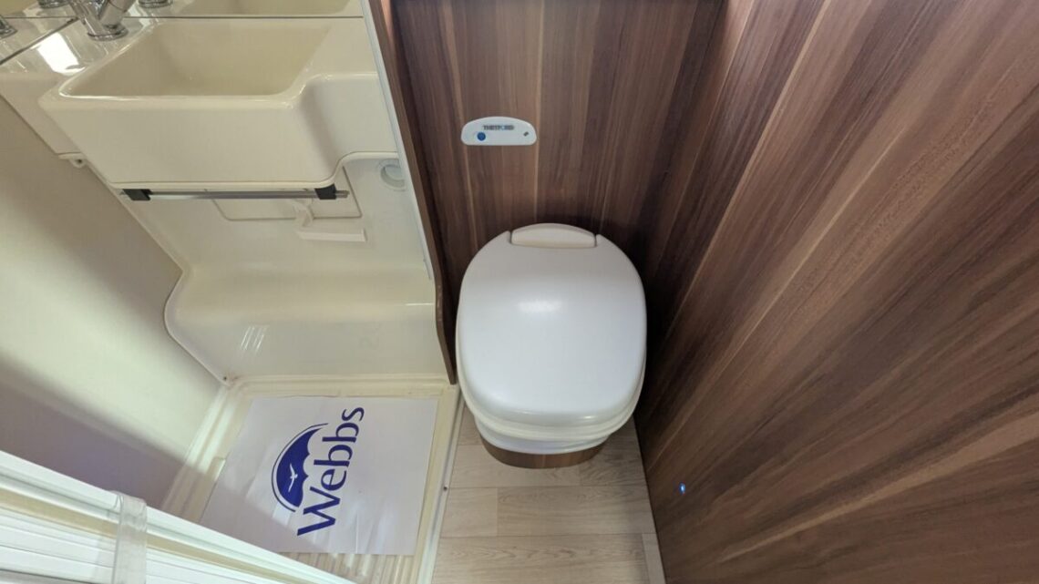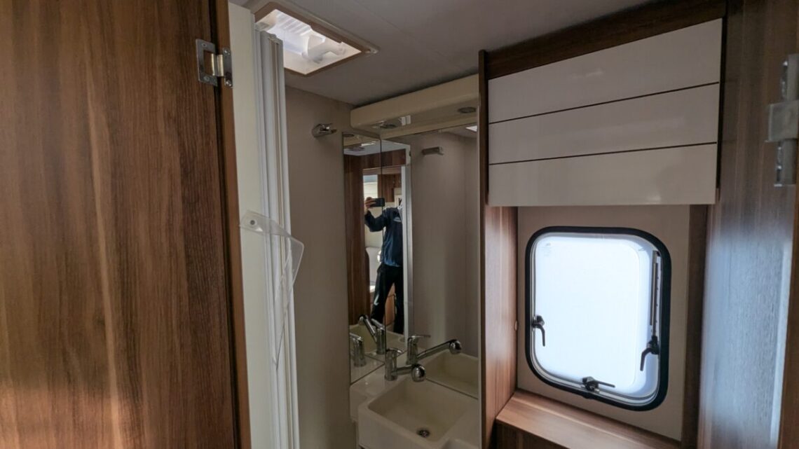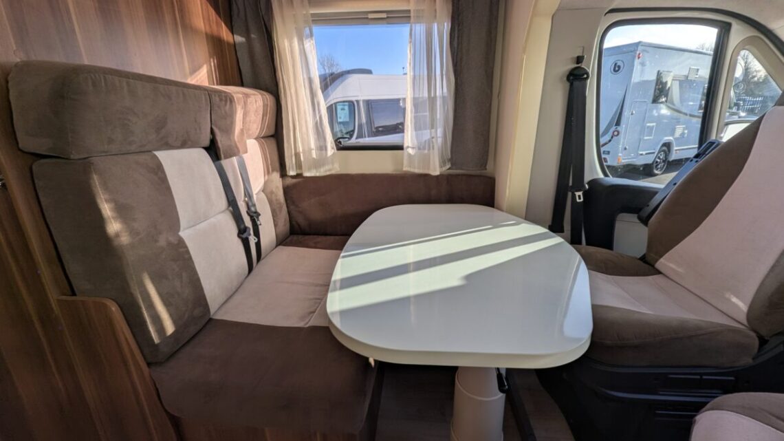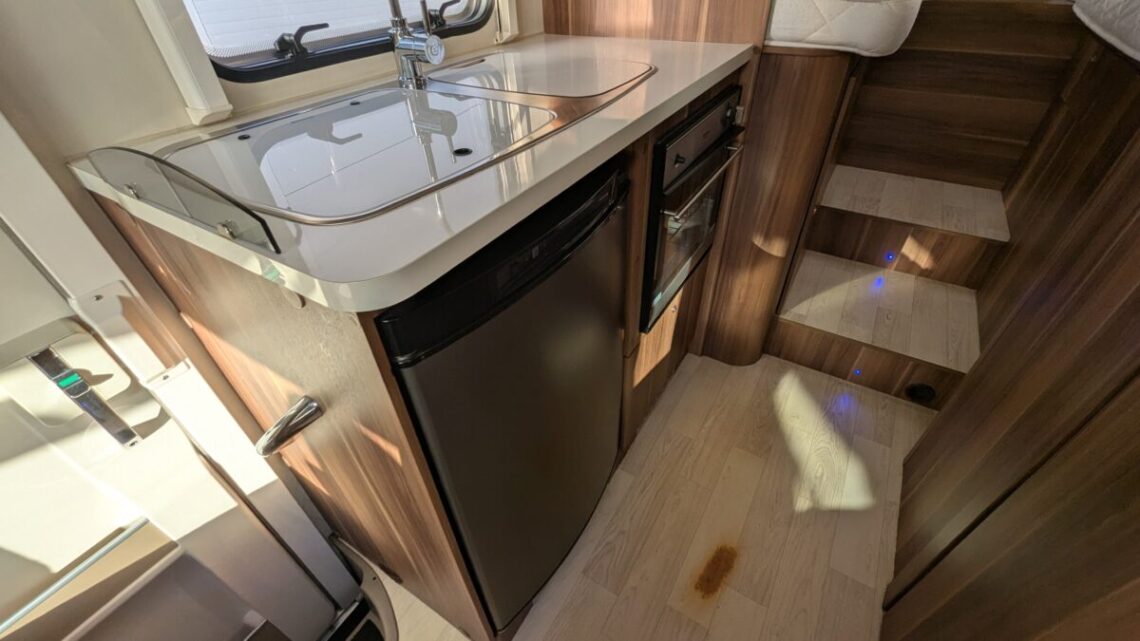Inside, the layout is spacious and thoughtfully arranged. The standout feature is the rear twin single beds, providing comfortable sleeping without the need for daily bed conversion. Beneath the beds is a large rear garage, perfect for storing bikes, outdoor equipment or additional luggage, making this motorhome especially appealing for active travellers. The living and dining area is bright and welcoming, with plenty of seating and natural light from large skylight windows. The kitchen is fully equipped to handle life on the road, featuring a hob, oven/grill, fridge and ample storage, allowing you to prepare meals with ease. Whether you’re cooking a quick breakfast or a full evening meal, everything you need is close at hand.