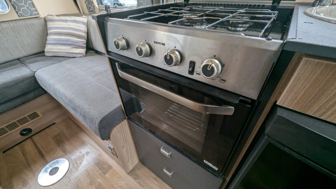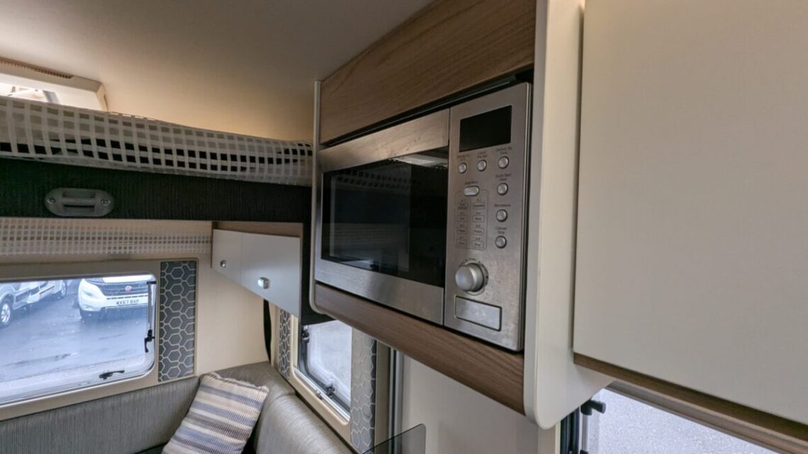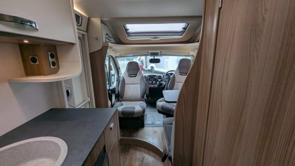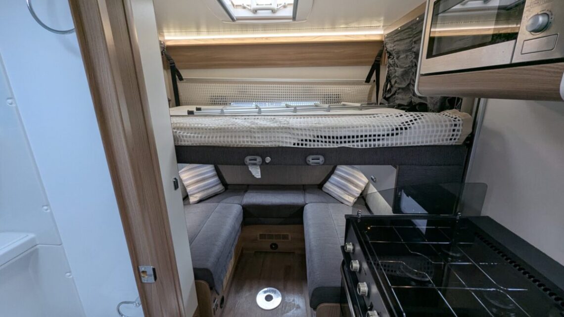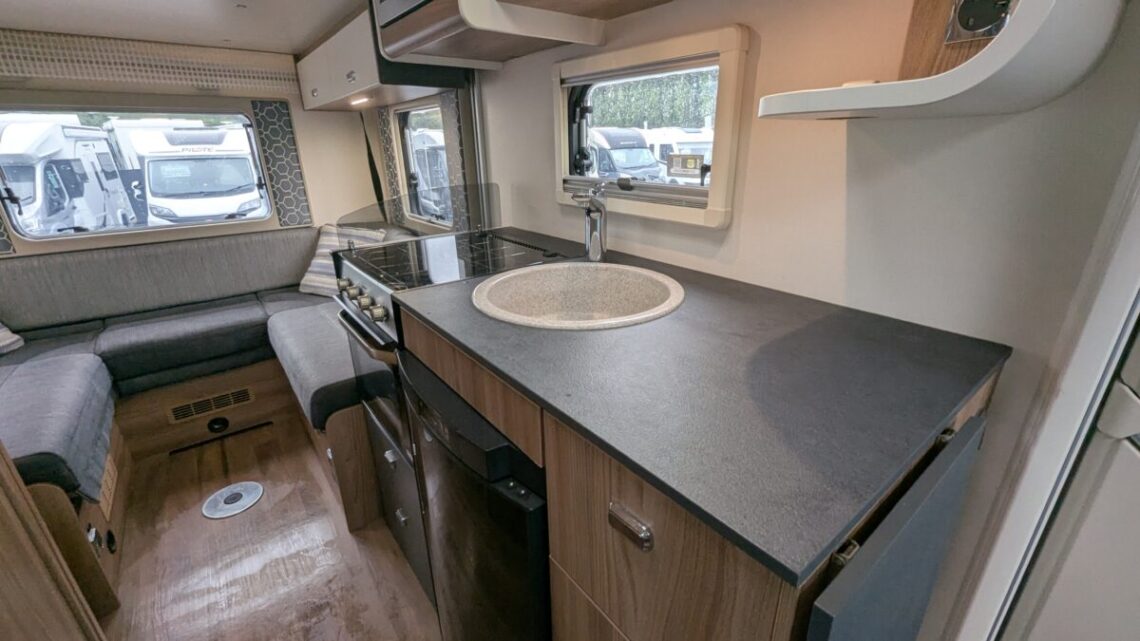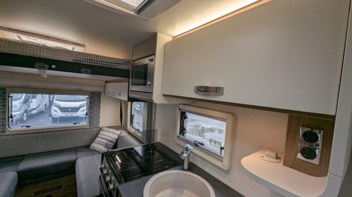 Inside, the C404 is thoughtfully laid out to make the most of its space. The rear U-shaped lounge provides a comfortable area for dining and relaxing, and easily converts into a spacious double bed. Additionally, an overcab drop-down double bed offers extra sleeping space, allowing the motorhome to comfortably sleep up to four people. This flexible layout makes it ideal for couples, small families, or even solo travellers who value space and functionality. The well-equipped kitchen includes a gas hob, oven with grill, microwave, sink, and a generously sized fridge, giving you everything you need to prepare meals on the go. Opposite the kitchen, the stylish washroom features a compact yet practical wet room with shower, toilet, and hand basin — perfect for life on the road.